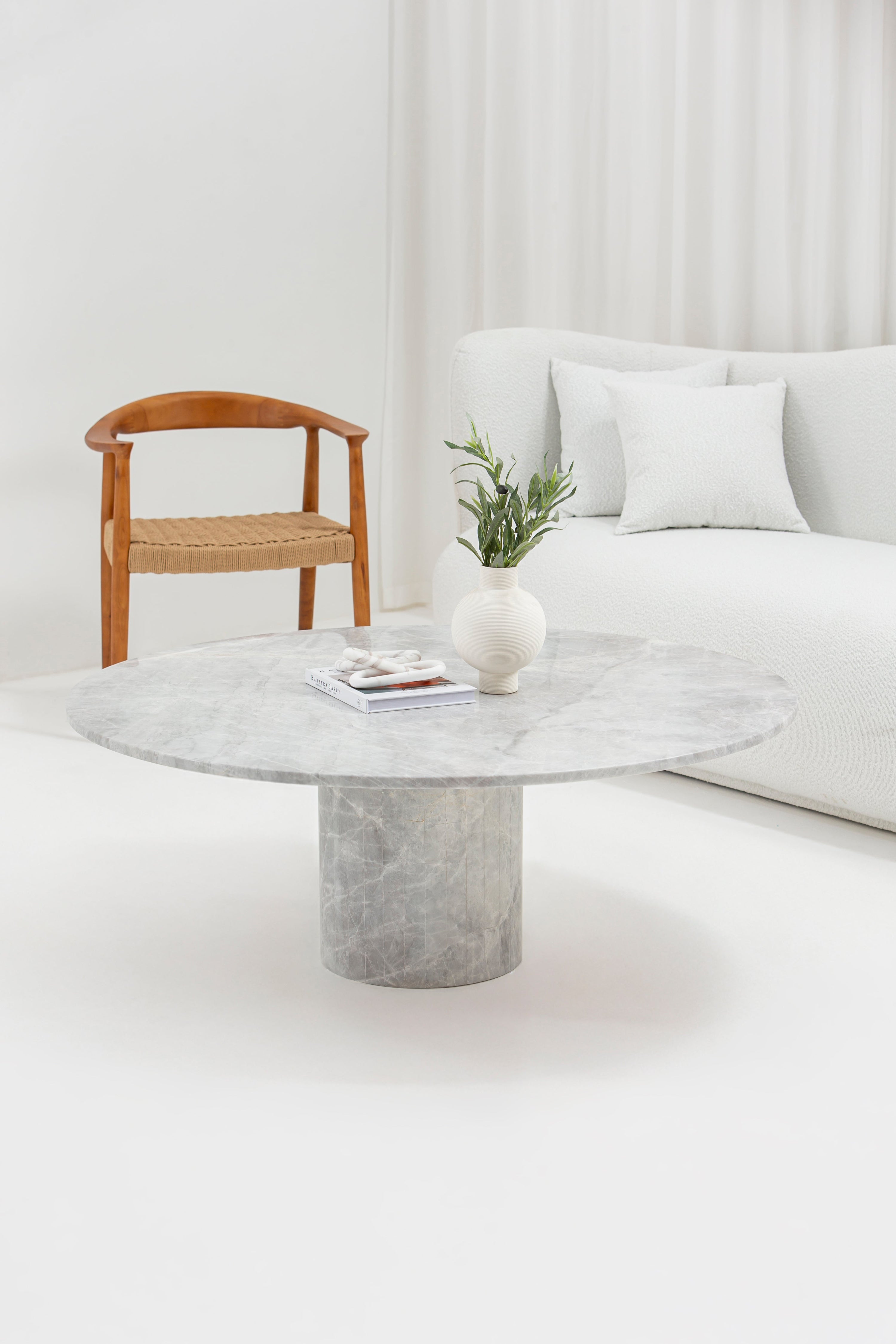 Step into a world of refined elegance with this ultimate living room centerpiece. A flawlessly smooth, round marble tabletop showcases the unique soft grey and white veining of authentic Fior De Pasco marble, exuding natural sophistication and subtle contrast. Its substantial yet graceful cylindrical base offers exceptional stability and a clean, modern silhouette that embodies minimalist luxury. Perfect for contemporary homes, upscale apartments, or anyone seeking high-end furniture that merges natural stone artistry with everyday functionality. This designer coffee table isn’t just a surface—it’s a statement of timeless style and unrivaled craftsmanship. Elevate your space with a piece that defines modern interior trends and infuses your home with quiet sophistication.