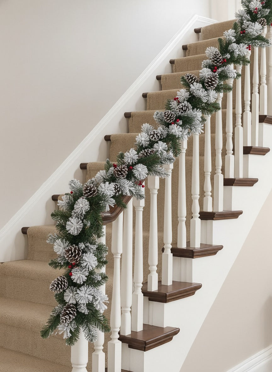 Create a cozy winter scene with the Christmas Snow-Tipped Garland Decoration. This festive garland features frosted pine branches, red berries, and miniature pinecones that capture the magic of freshly fallen snow. Its lush, flexible design makes it perfect for draping over mantels, stair rails, or tables. The white dusting adds a soft, wintry glow, while the berry accents lend a cheerful pop of color. Ideal for both rustic and elegant holiday interiors, it brings seasonal warmth to any space.
