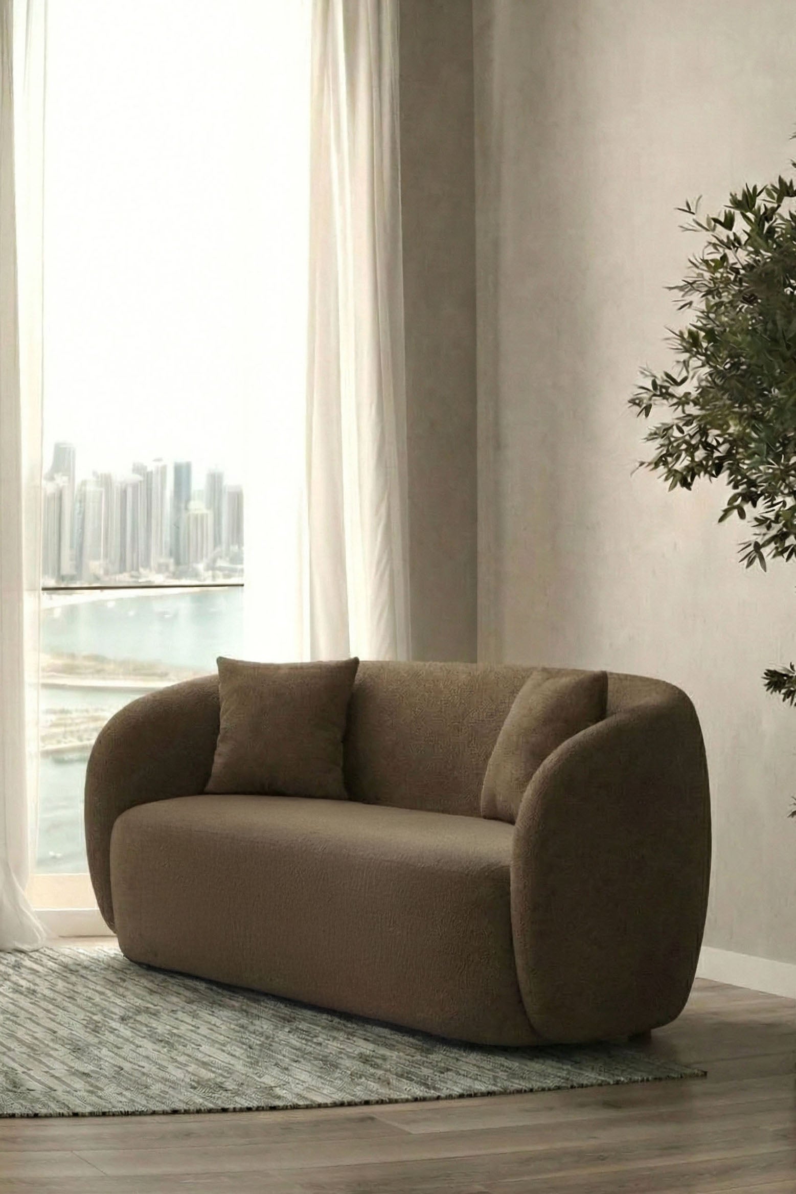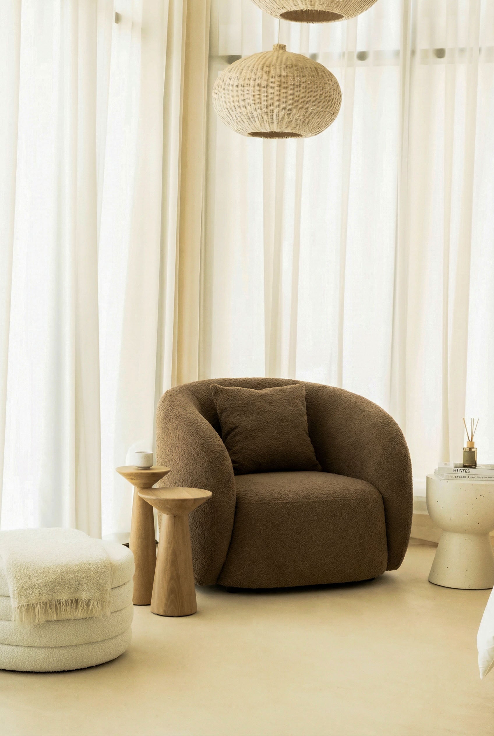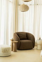 Create a cozy design moment with this lounge chair, wrapped in rich brown boucle for a soft, elevated finish that instantly warms your space. Its rounded, enveloping silhouette and plush seat invite slow mornings and long evenings, while the sculptural profile adds a modern, gallery inspired touch to living rooms, bedrooms, or reading corners. Style it beside a side table and a floor lamp for an effortless retreat, or let it stand alone as a statement piece that feels as comforting as it looks.