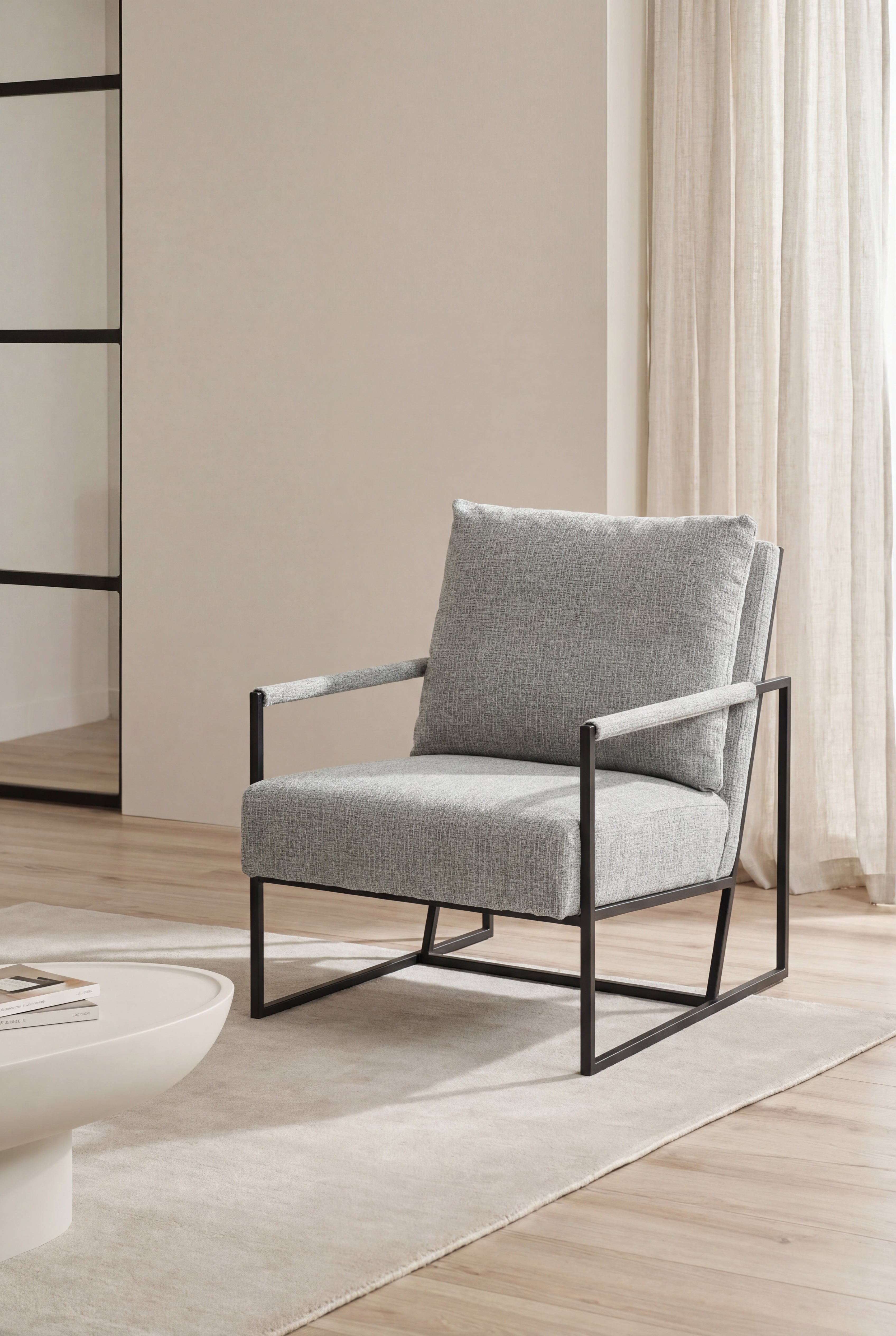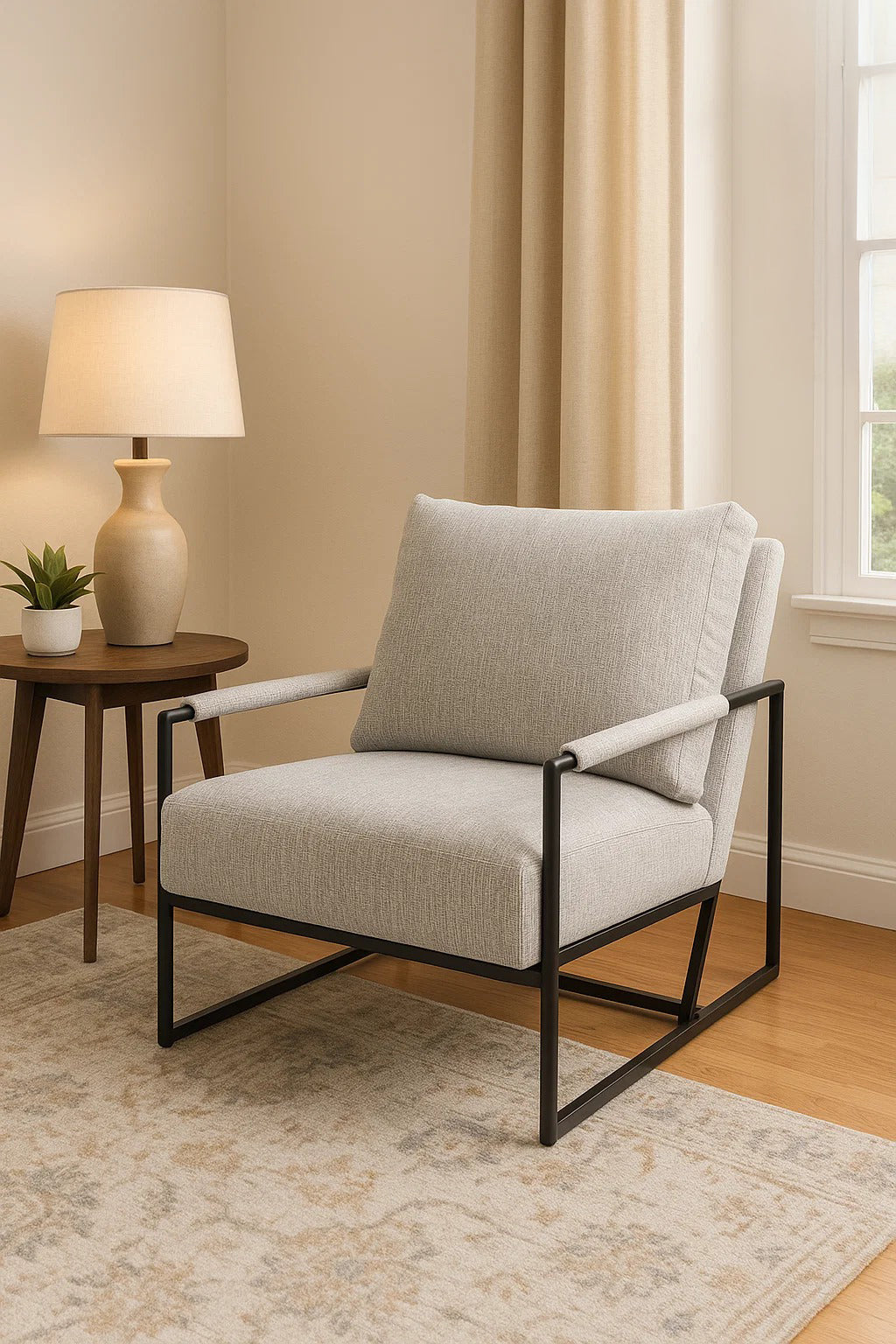 Settle into soft support with this accent chair upholstered in Boucle plain fabric and set on a slim black painted frame. The wide seat and generous back cushion invite you to lounge while padded arm wraps add a gentle touch. The open base keeps the profile light and modern and the neutral palette layers effortlessly with your decor. This living room chair brings relaxed comfort to reading corners and conversation spaces.