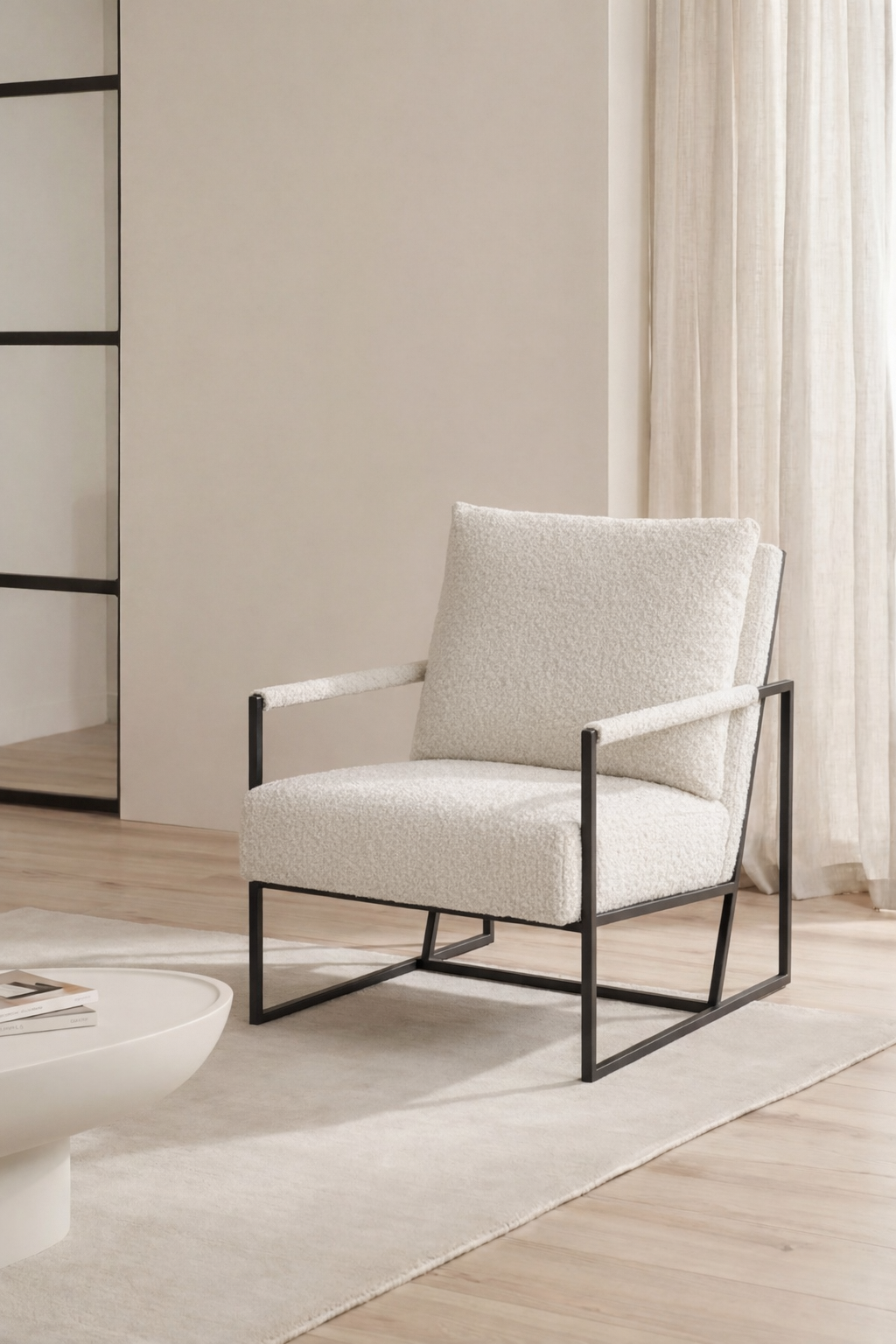 Settle into soft support with this accent chair upholstered in Boucle and set on a slim black painted frame. The wide seat and generous back cushion invite you to lounge while padded arm wraps add a gentle touch. The open base keeps the profile light and modern and the neutral palette layers effortlessly with your decor. This living room chair brings relaxed comfort to reading corners and conversation spaces.