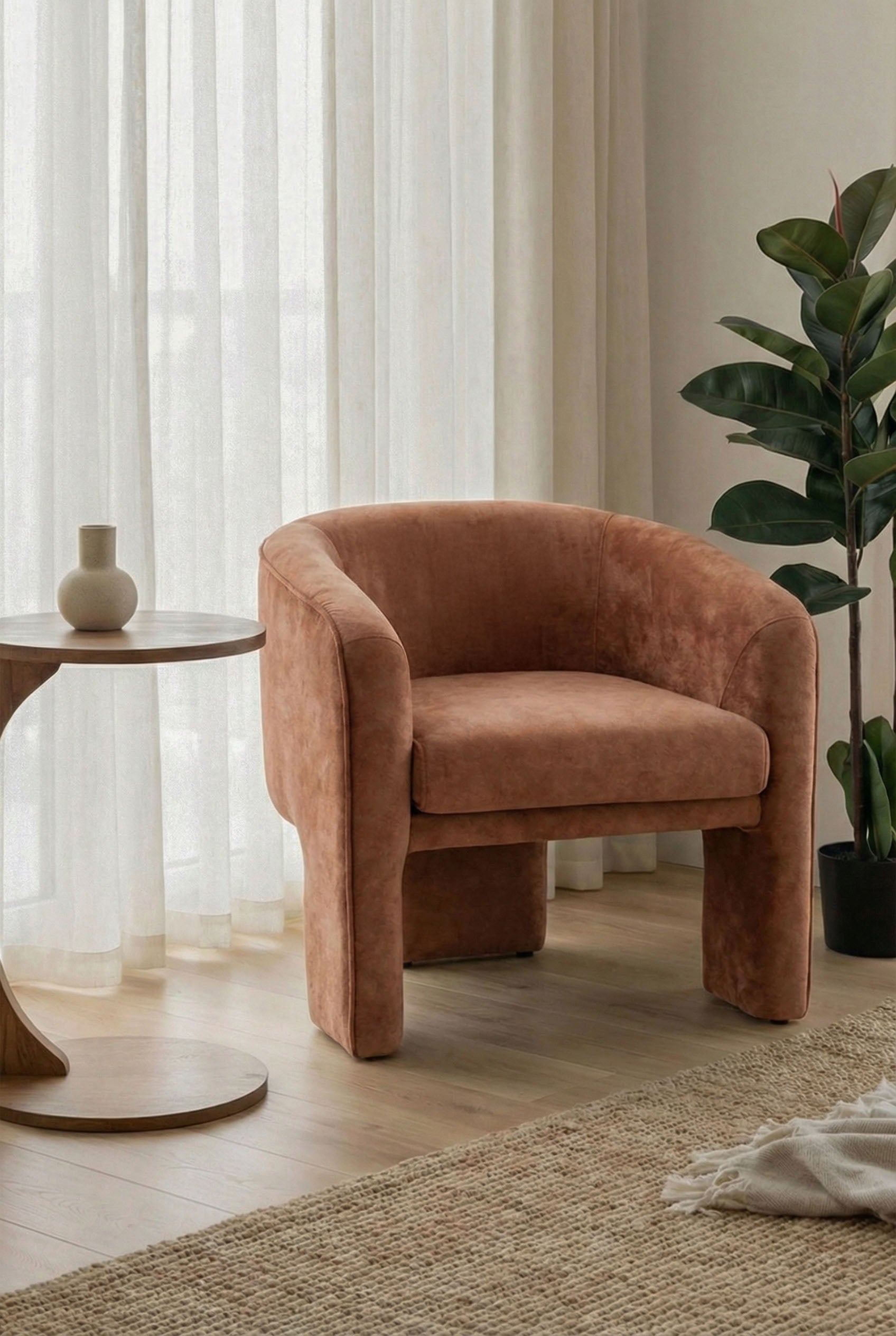 Infuse your home with earthy warmth through a lounge chair designed for both comfort and bold style. The rust brown fabric brings rich depth, accentuating the sculptural curves and rounded silhouette. Its plush seat offers lasting comfort while the color adds character to any space. Perfect for rustic, modern, or eclectic interiors, this chair becomes the cozy anchor your lounge or living room needs.