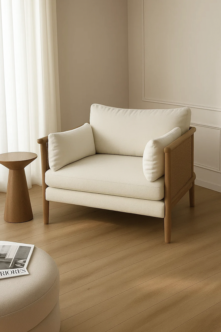 Crafted with a warm wooden frame and complemented by soft, cushioned upholstery, this lounge chair brings a refined blend of comfort and contemporary elegance to any living space. Its clean lines, natural textures, and generous seat create an inviting retreat for relaxation, while the supportive side cushions enhance both comfort and visual balance. Designed to suit minimalist, Scandinavian, and modern interiors, it adds a serene and timeless presence to living rooms, bedrooms, or reading corners, offering an effortless harmony of style, warmth, and everyday comfort.