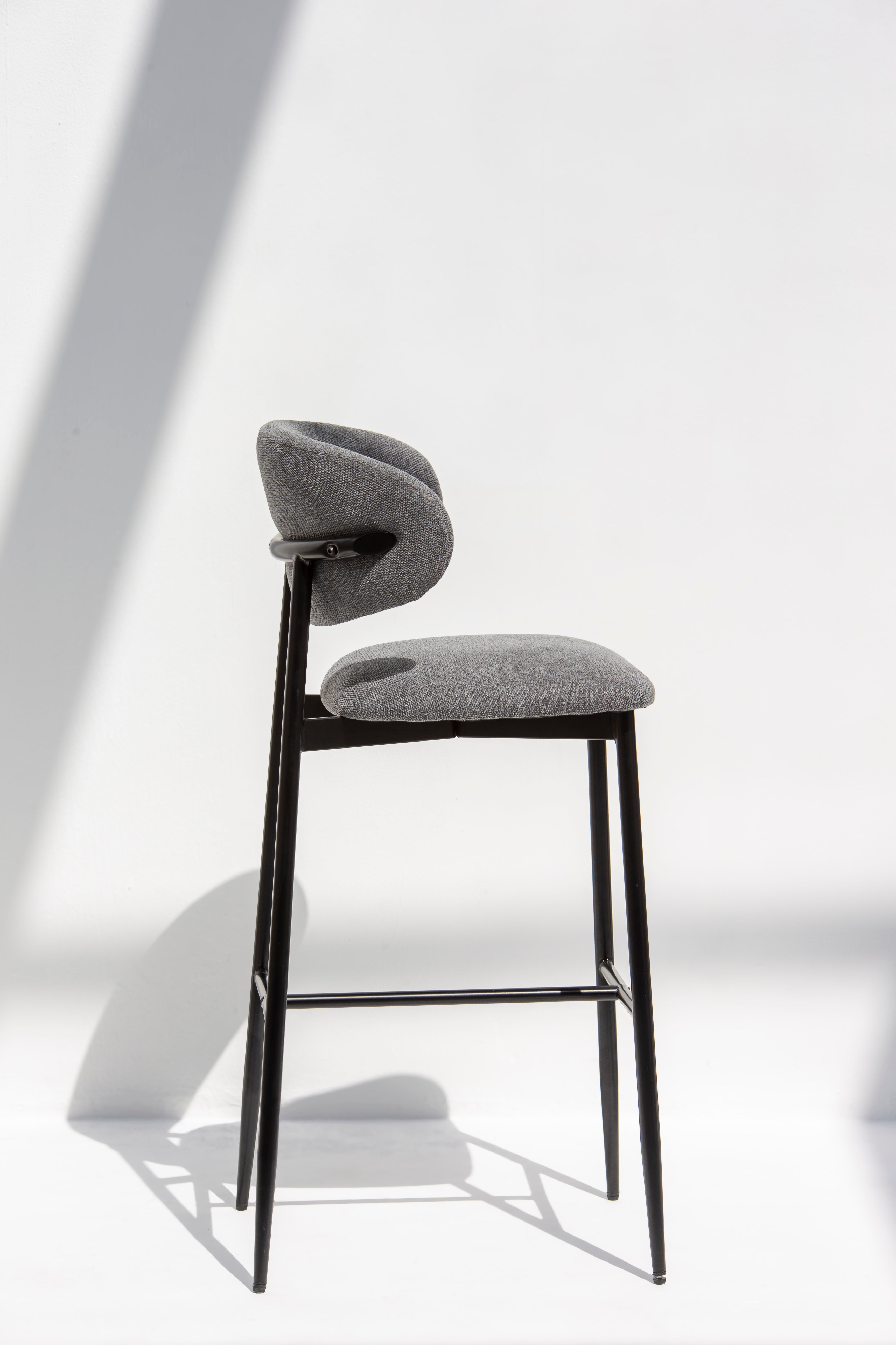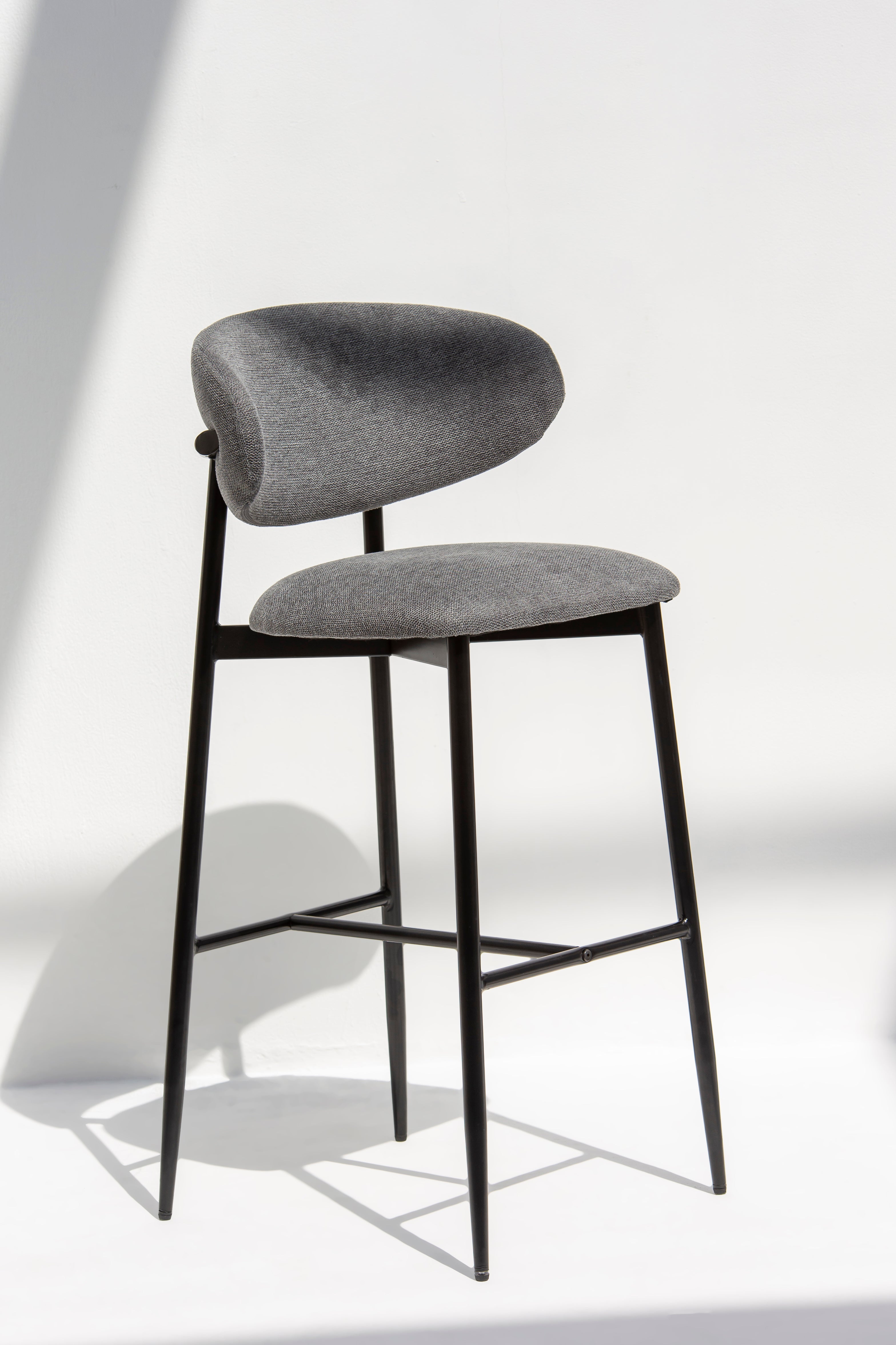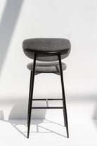 Crafted with a sleek black metal frame, the stool exudes industrial-inspired charm, providing stability and a striking visual contrast against the charcoal upholstery. The slender, tapered legs are reinforced with a convenient footrest, ensuring both functionality and comfort. Ideal for chic bar counters or kitchen islands, this bar stool seamlessly merges form with function, creating an inviting space with timeless appeal.