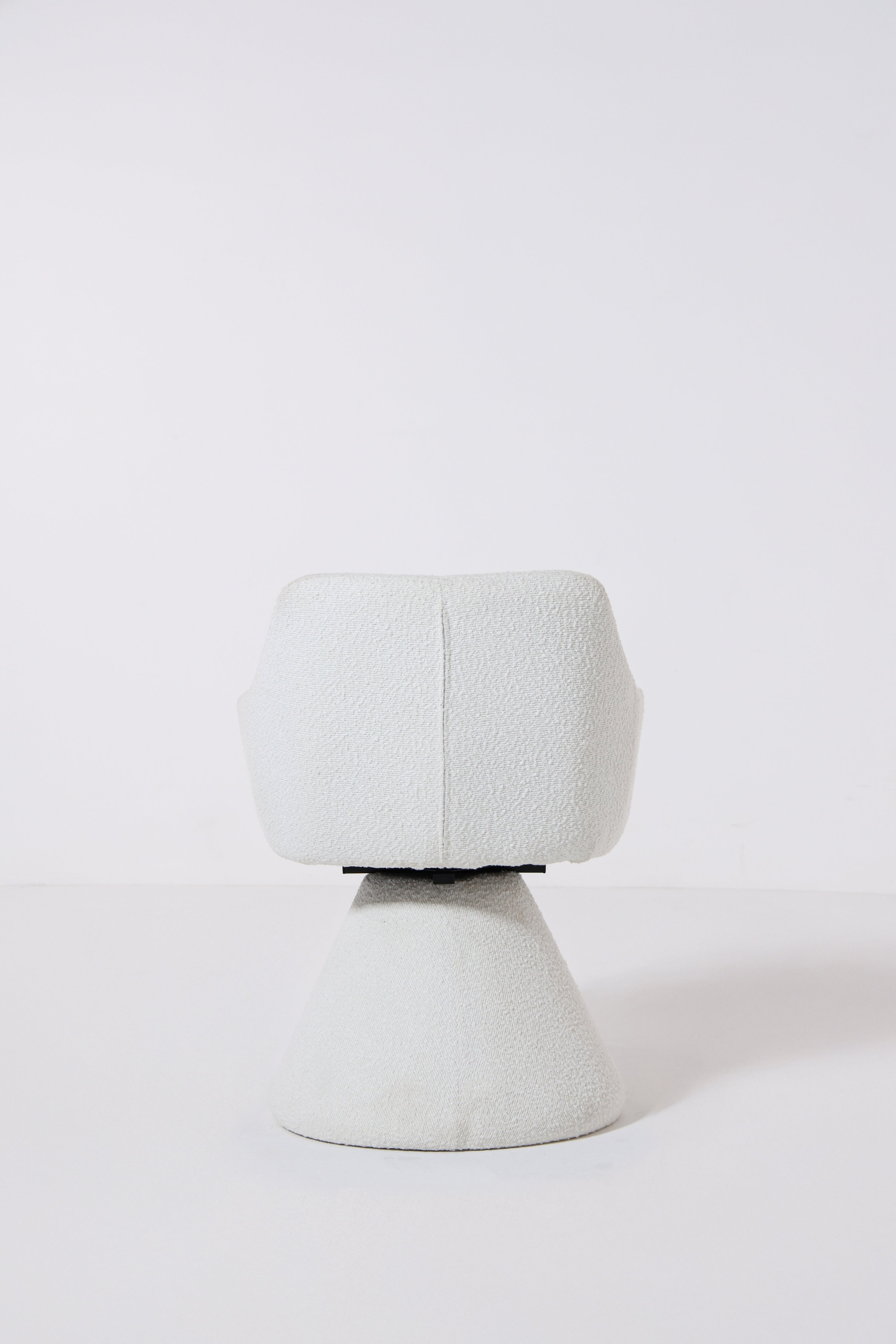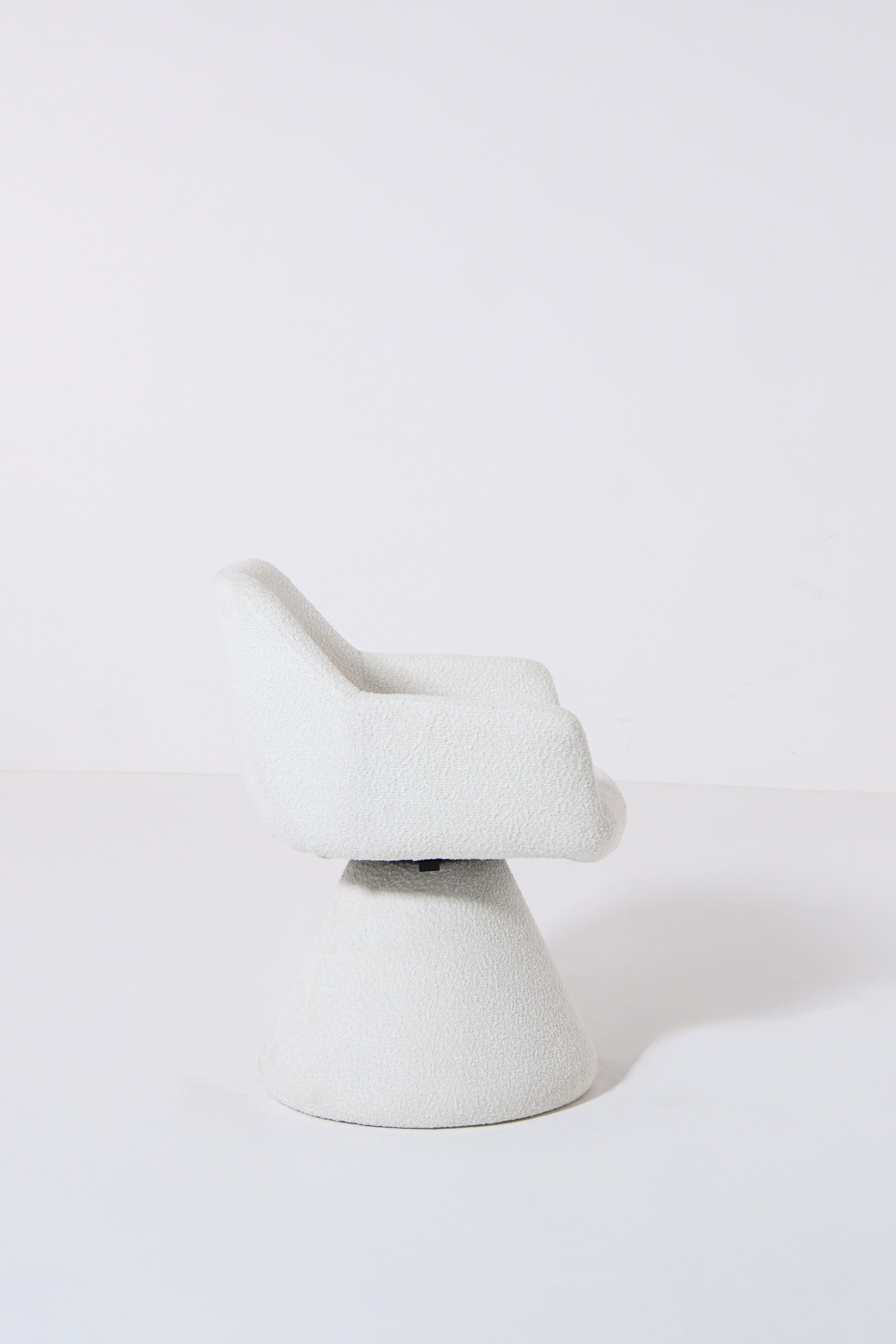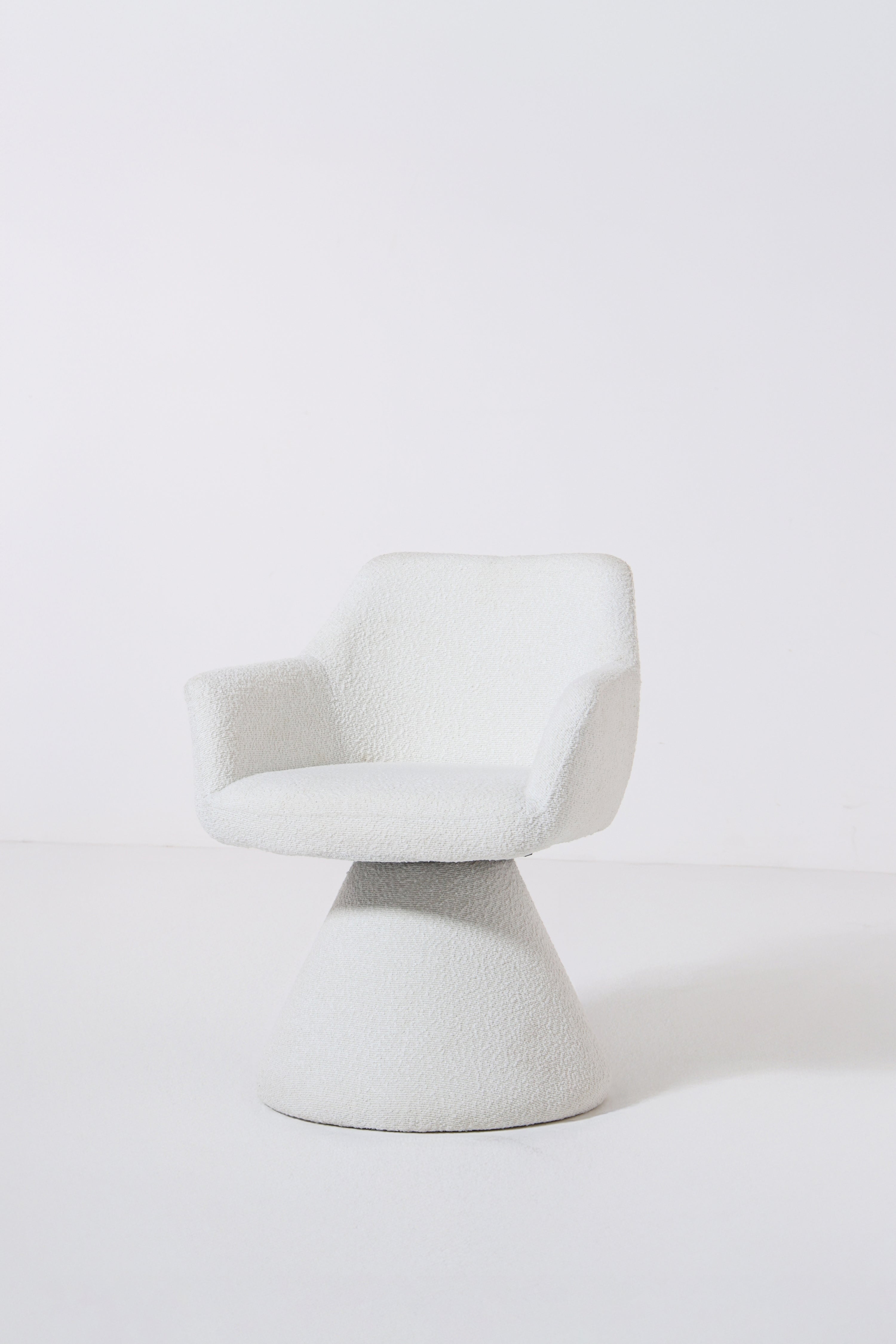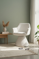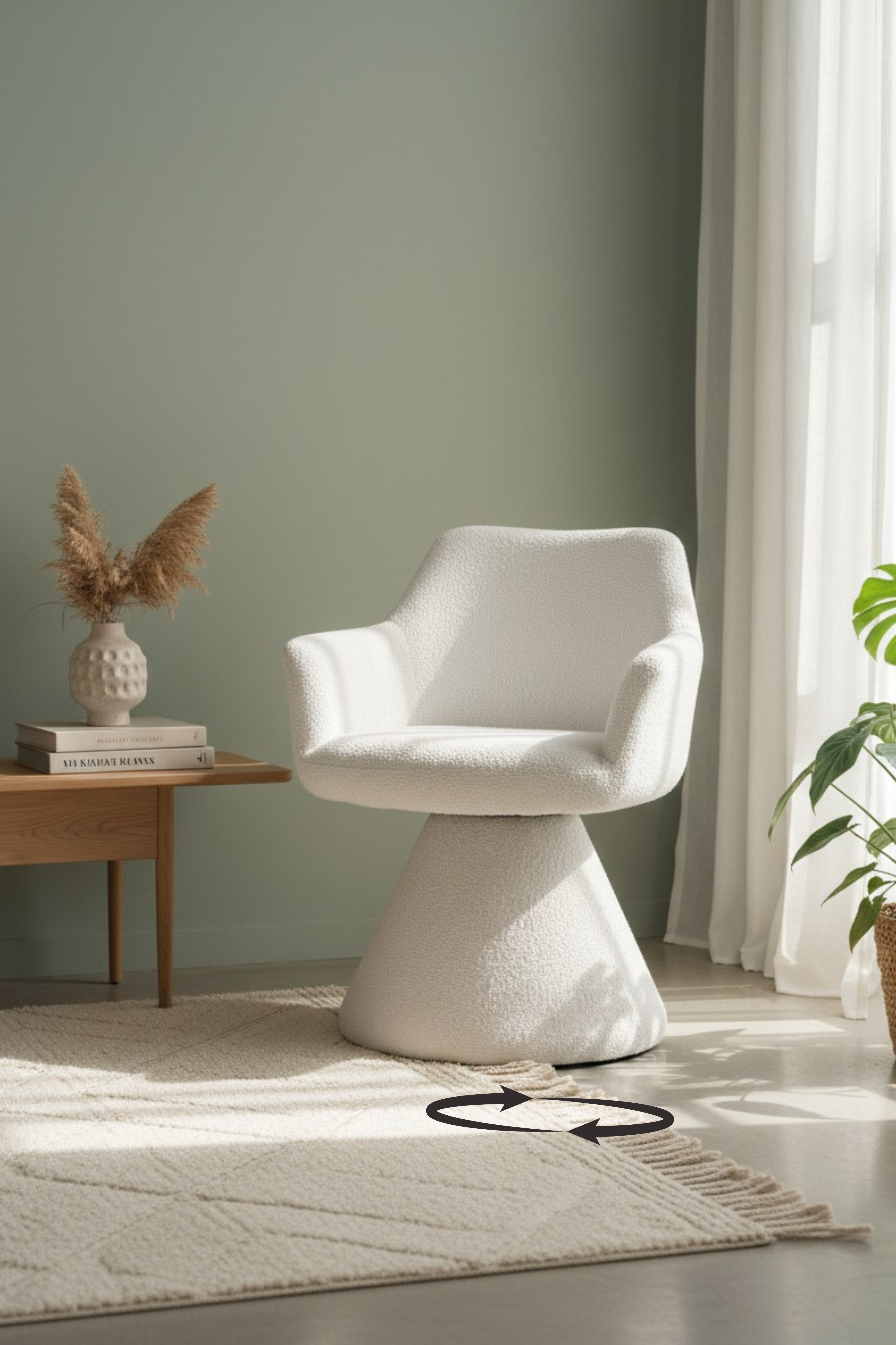 Indulge in effortless elegance with this modern swivel dining chair, wrapped in plush bouclé fabric for a soft, tactile experience. Its sculpted silhouette, complete with gently curved armrests and a conical base, adds artistic charm to any dining or lounge setting. Designed for both comfort and movement, the 360° swivel feature brings flexibility to everyday seating. Perfect for contemporary, minimalist, or Scandinavian spaces, it offers a luxurious blend of texture, style, and functionality.