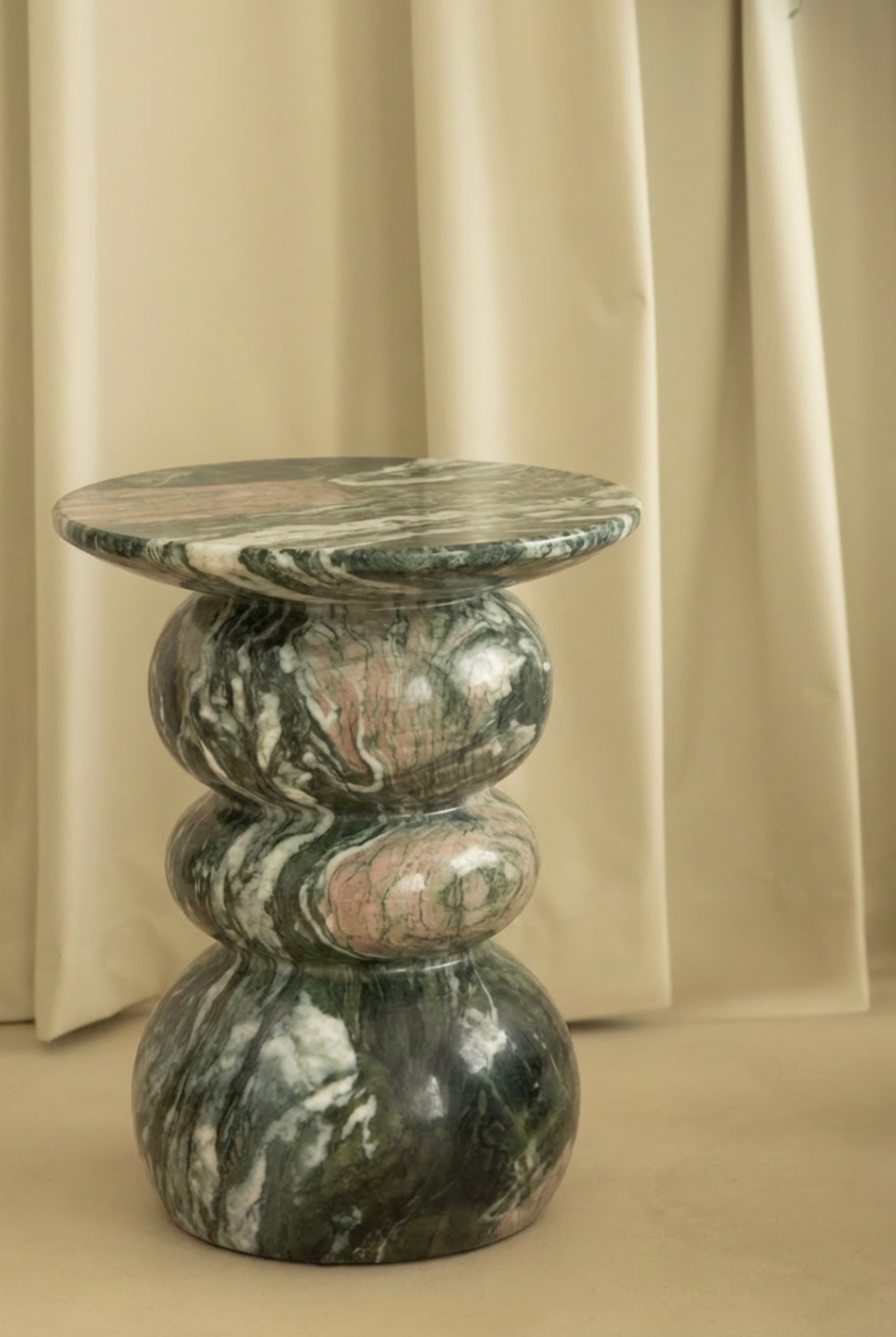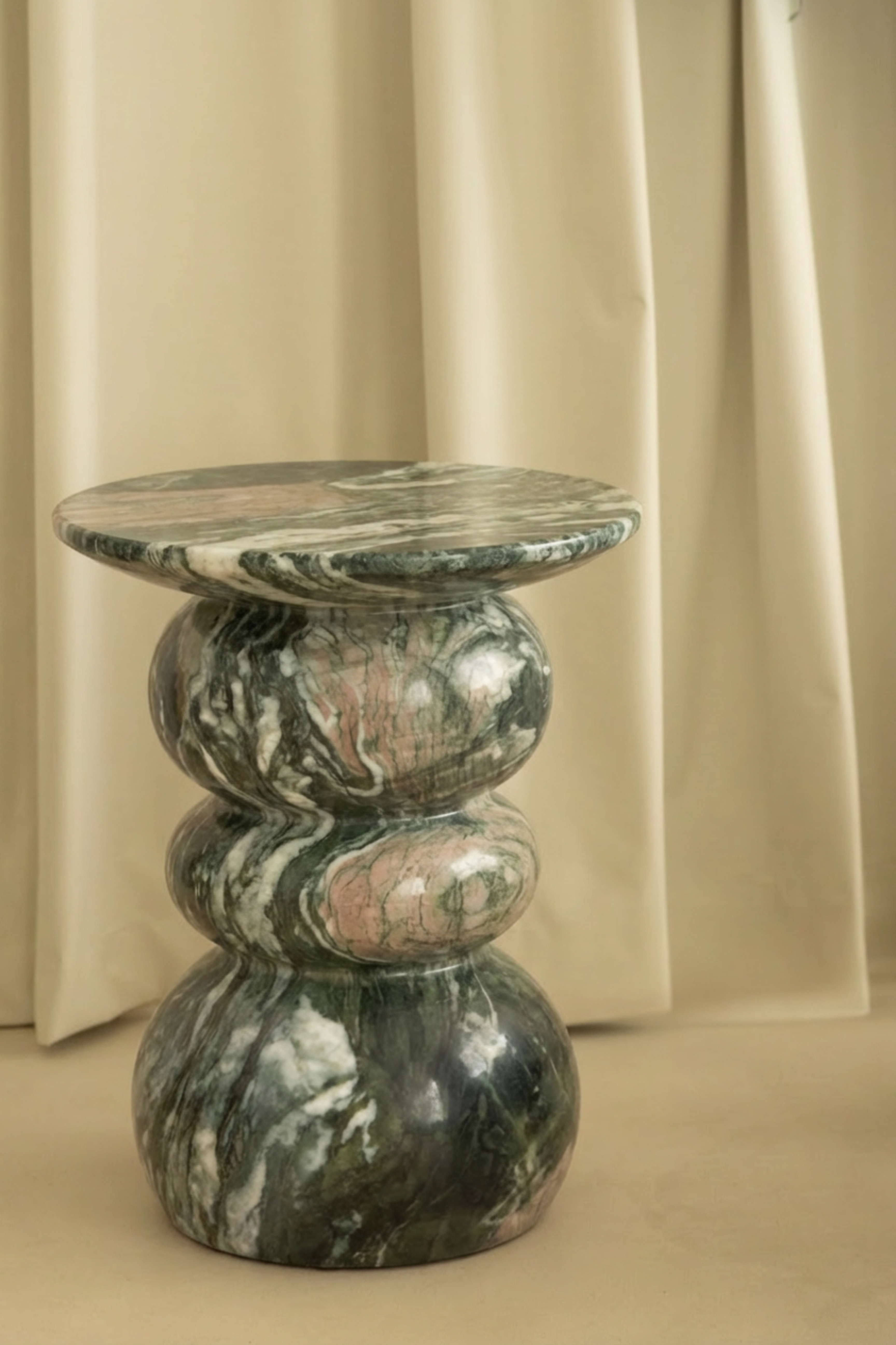 Featuring a sculptural silhouette, this side table draws the eye with its artful rounded base that transitions seamlessly into a refined top, now enhanced with a rich green marble–inspired finish. Crafted from durable Fiber Reinforced Concrete, it showcases deep green tones highlighted by organic white veining that introduces a luxurious yet natural elegance to any interior. The smooth surface and curvaceous profile make it a functional yet statement-making accent, perfect for displaying décor or serving as a chic alternative to a traditional side table. Designed to complement both minimalist and richly textured spaces, this versatile piece enriches modern and classic interiors with timeless sophistication and lasting durability.