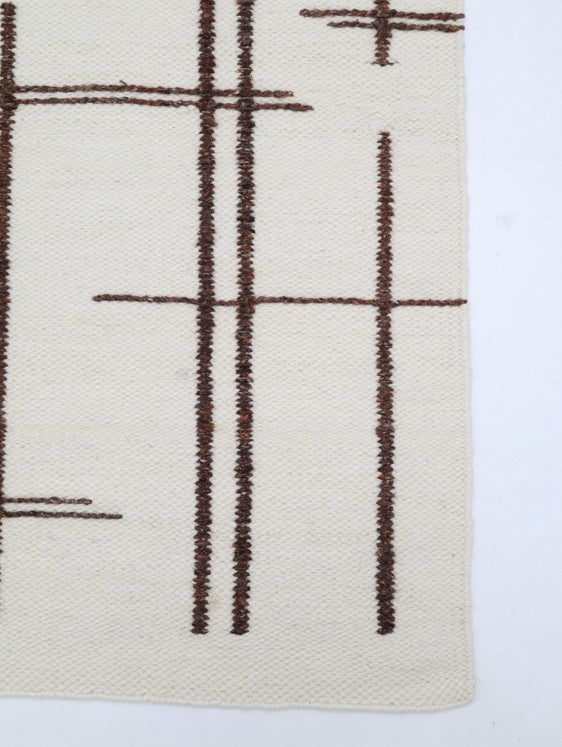 Set a clean, modern base with this handwoven white and brown wool area rug crafted from natural and New Zealand wool. Crisp linear bands move across a soft white ground, creating clear geometry and warm contrast that reads beautifully in everyday light. A thick, textured weave gives a cushioned step, with gentle highs and lows that add depth without fuss. Clean finished edges and the rectangular shape sit neatly under sofas, dining tables, and beds, anchoring minimalist and Scandinavian interiors. Choose it when you want real texture, quiet pattern, and comfortable warmth in the living room or bedroom.