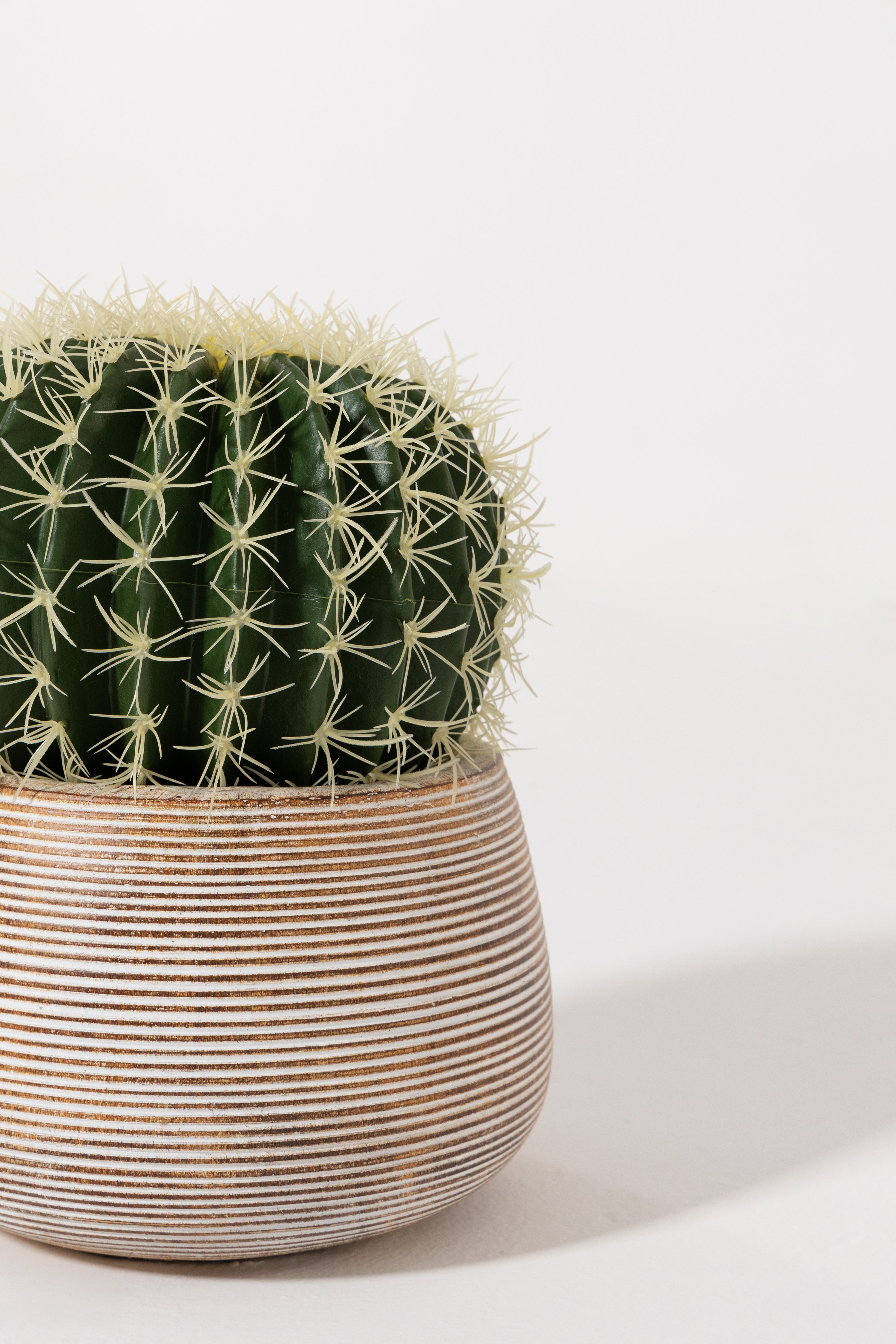 Bring a touch of the desert into your home with this beautifully crafted piece that radiates charm and simplicity. Its round, ribbed form and rich green hue are accentuated by lifelike spines that capture the natural beauty of a real cactus. The compact design sits in a modern, making it the perfect accent for shelves, desks, or coffee tables. With its realistic detail and sculptural shape, it offers the allure of greenery without the need for sunlight or care ideal for contemporary interiors that value effortless sophistication.