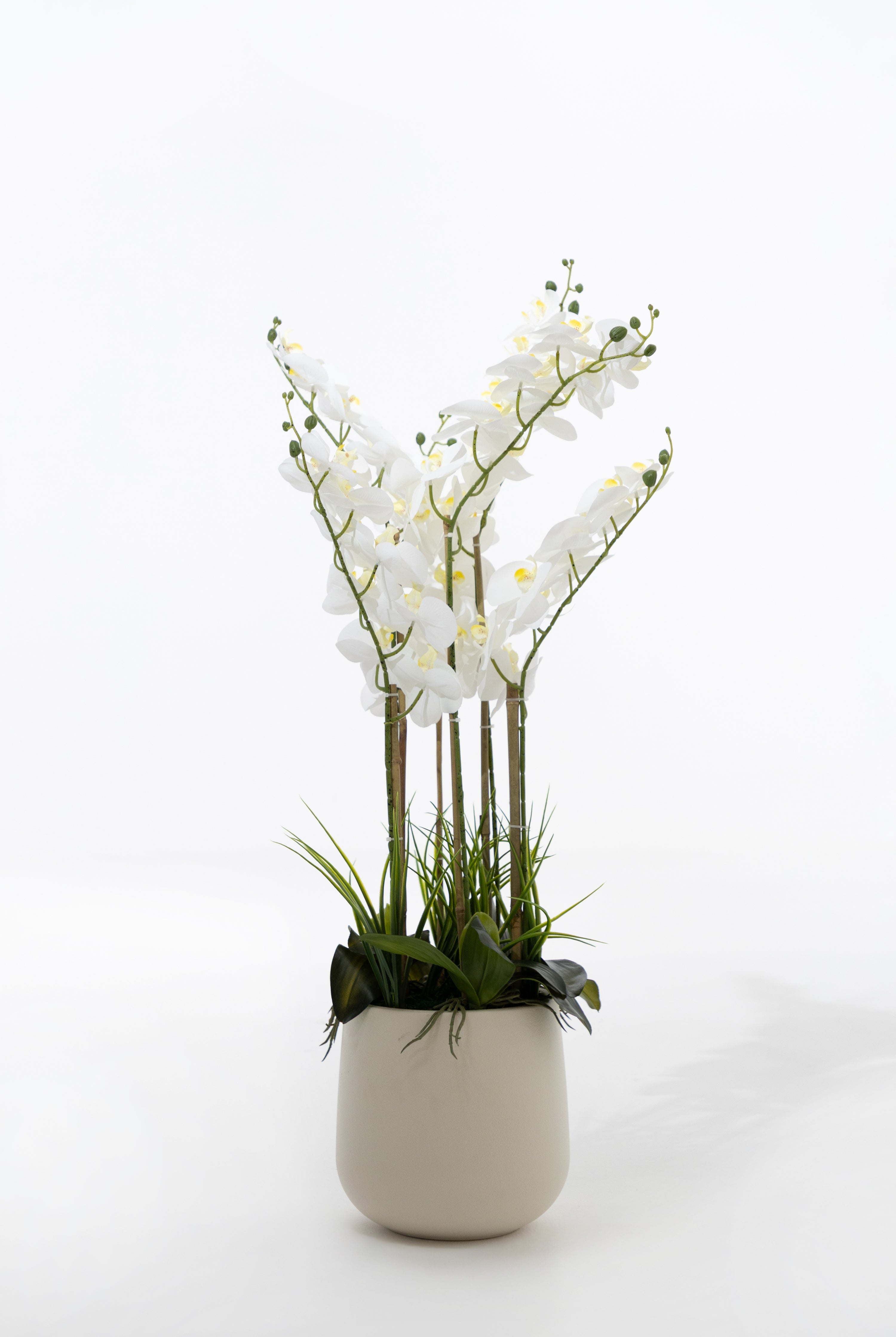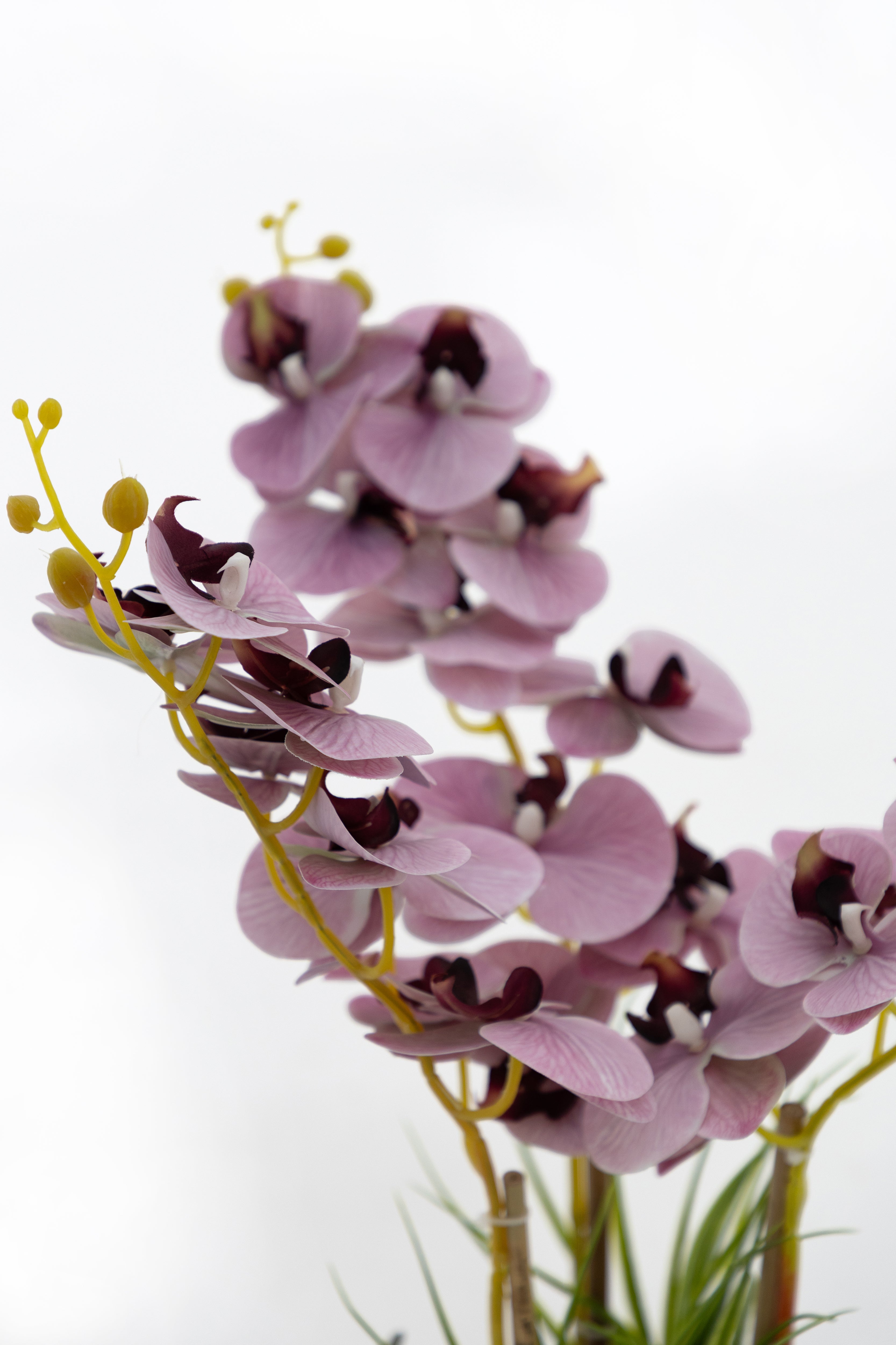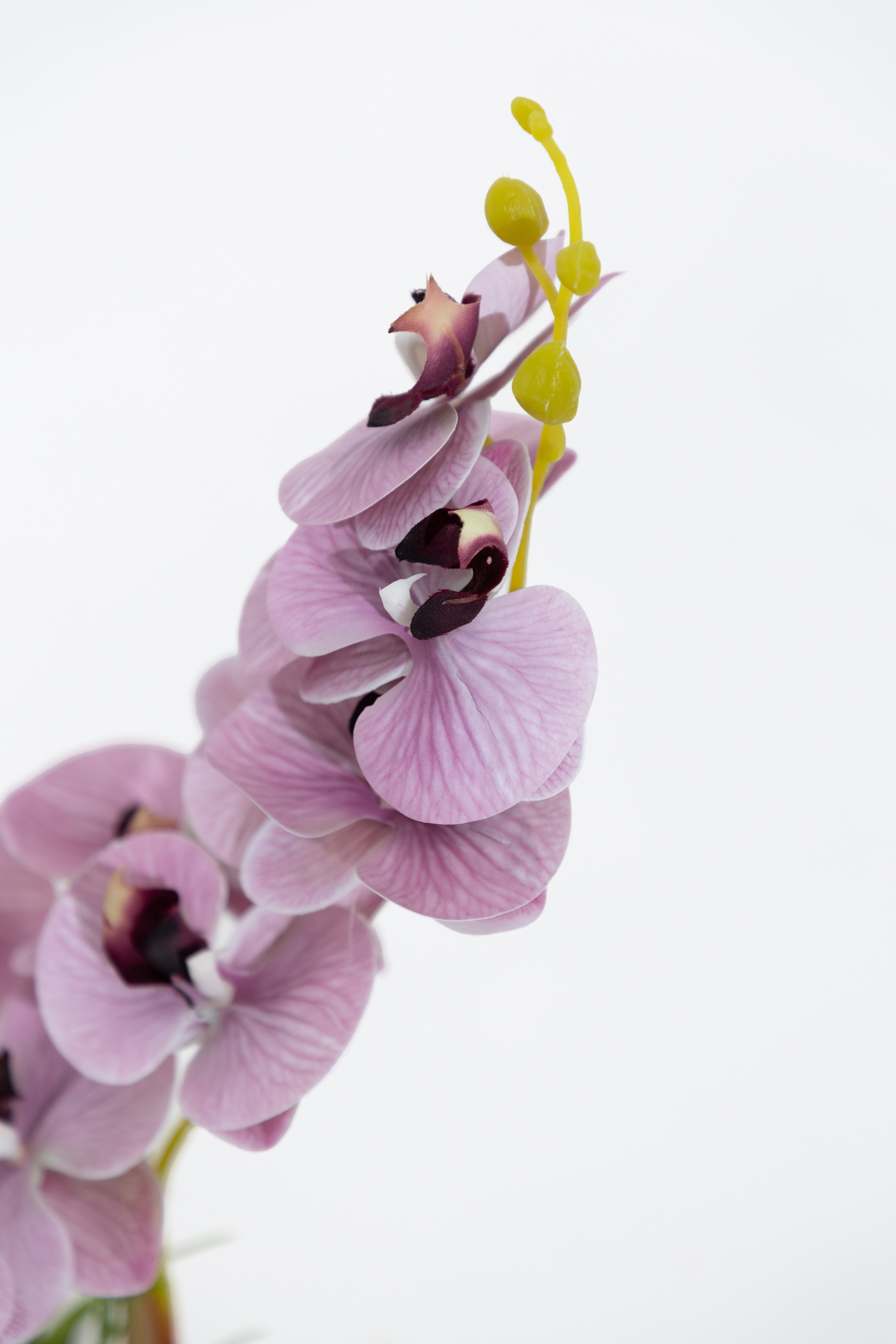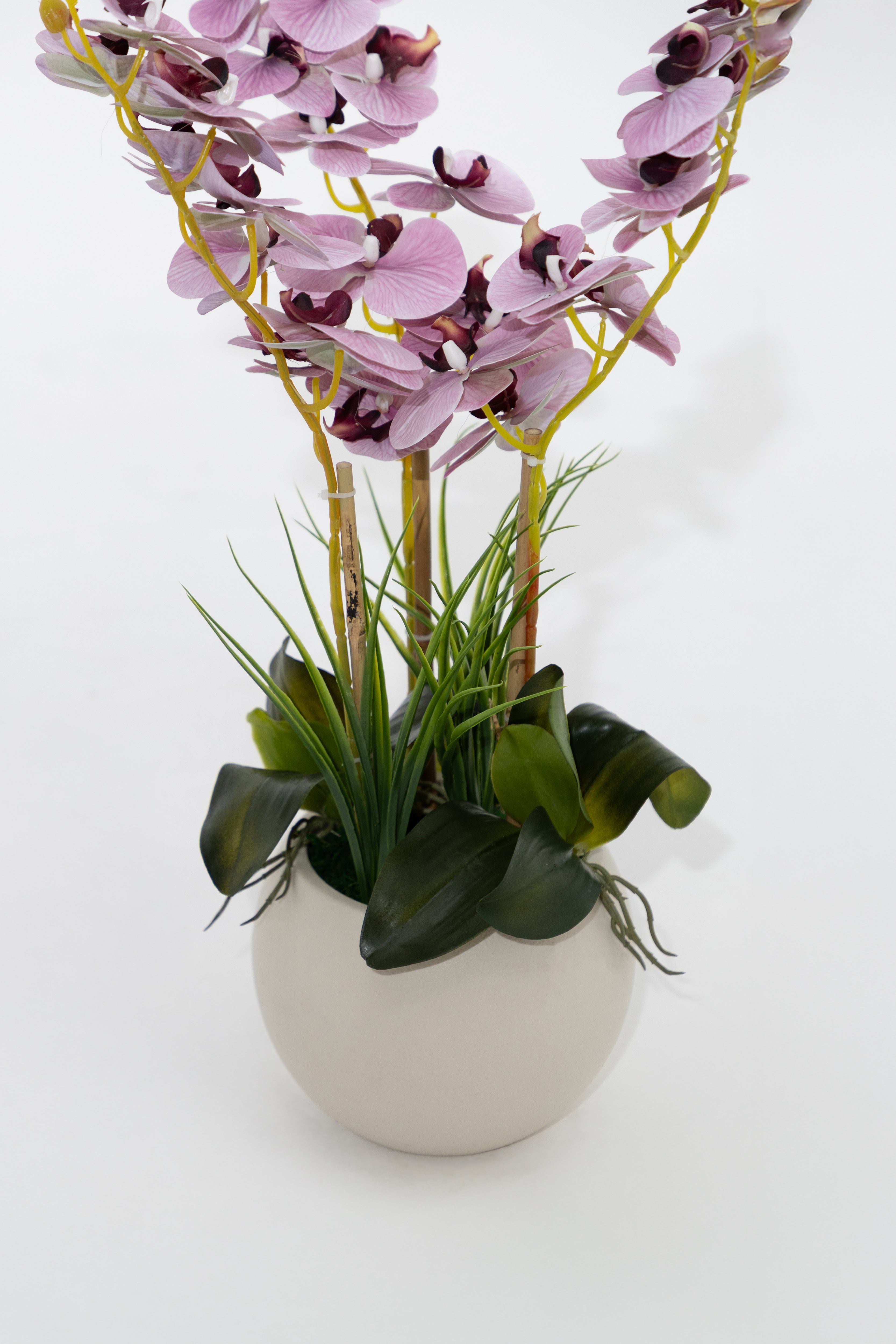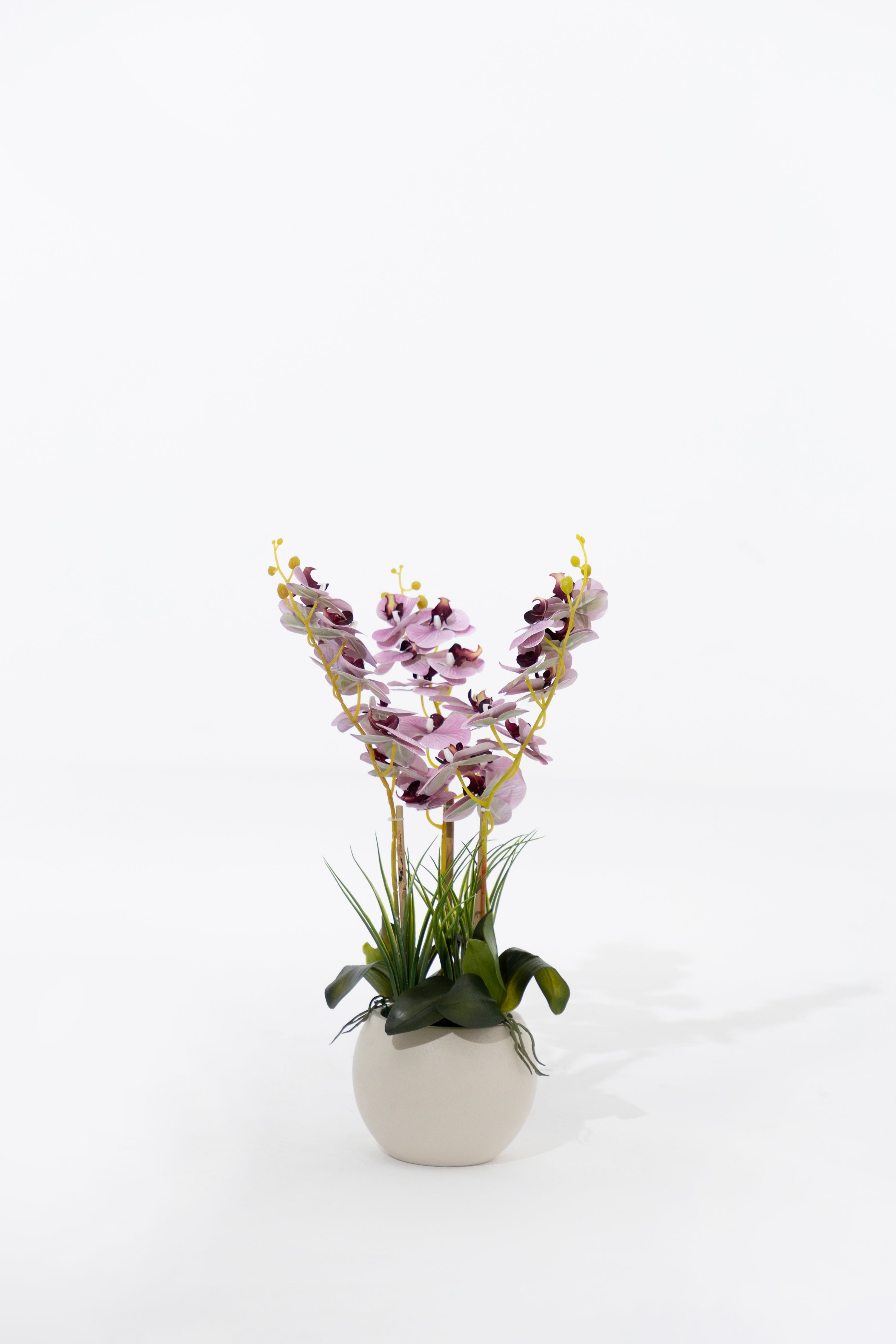 Add a touch of charm to your décor with these Artificial Pink Orchids with white pot, designed with gracefully arching branches that hold soft pink petals with subtle gradients for a lifelike finish. The slender stems rise from a compact base of lush green leaves and grass-like foliage, giving the arrangement a fresh and natural look. With its petite and elegant silhouette, this orchid arrangement brings a delicate pop of color and style, making you the heart of a cozy, sophisticated space. Ideal for desktops, side tables, or small corners, it’s a perfect accent for modern living.