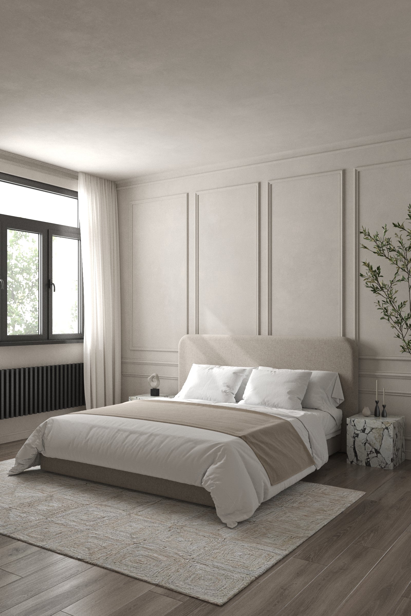 Upholstered in champagne beige fabric, this bed brings refined warmth and elegance to the bedroom. The headboard with softly rounded corners introduces a gentle, sculptural detail, while the streamlined frame creates a clean and modern silhouette. Smooth upholstery and fine stitching emphasize craftsmanship, making it a versatile piece that complements minimalist, contemporary, and transitional interiors.