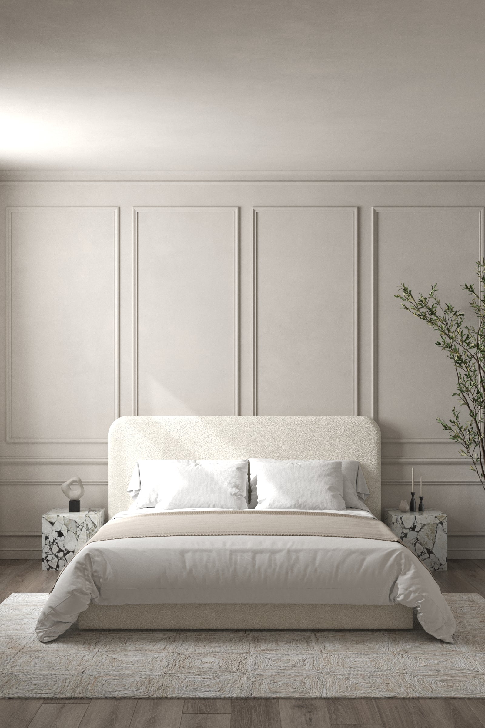 This bed is upholstered in soft cream Boucle fabric with a rounded corners headboard that offers a clean, gentle profile. The textured fabric enhances depth while the low frame provides a grounded base, creating a calm centerpiece for restful spaces. Balanced in design and comfort, it adapts effortlessly to contemporary and neutral interiors, making the bedroom feel both inviting and refined.
