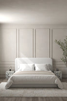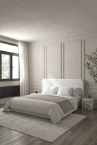 This bed is upholstered in soft frost line fabric and finished with a rounded corners headboard that introduces a calm, understated profile. The fabric’s subtle texture adds depth while the clean frame grounds the design, creating a centerpiece that pairs effortlessly with neutral or modern interiors. Its low platform style brings comfort and presence, making it a refined foundation for restful spaces.
