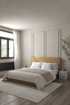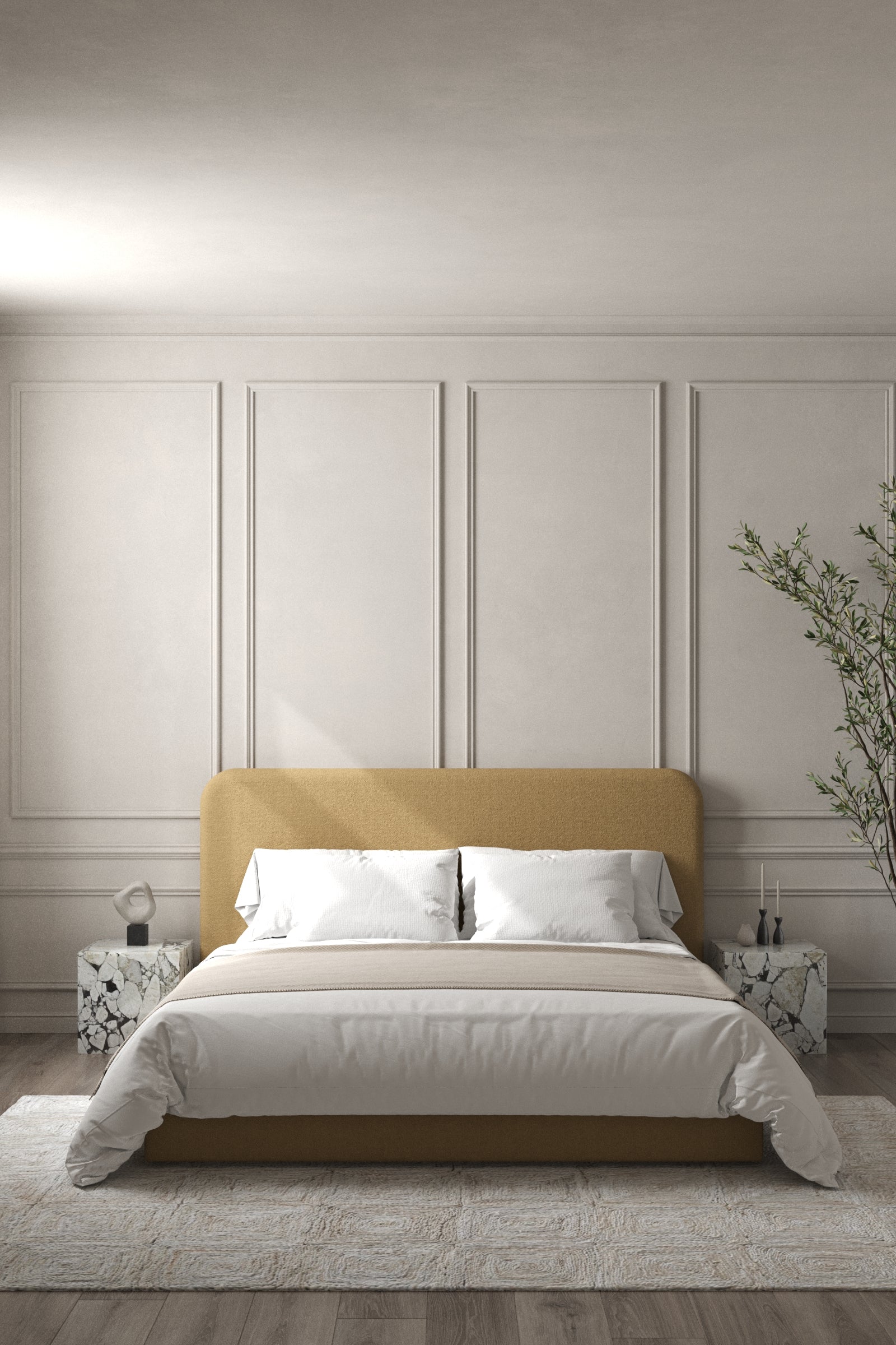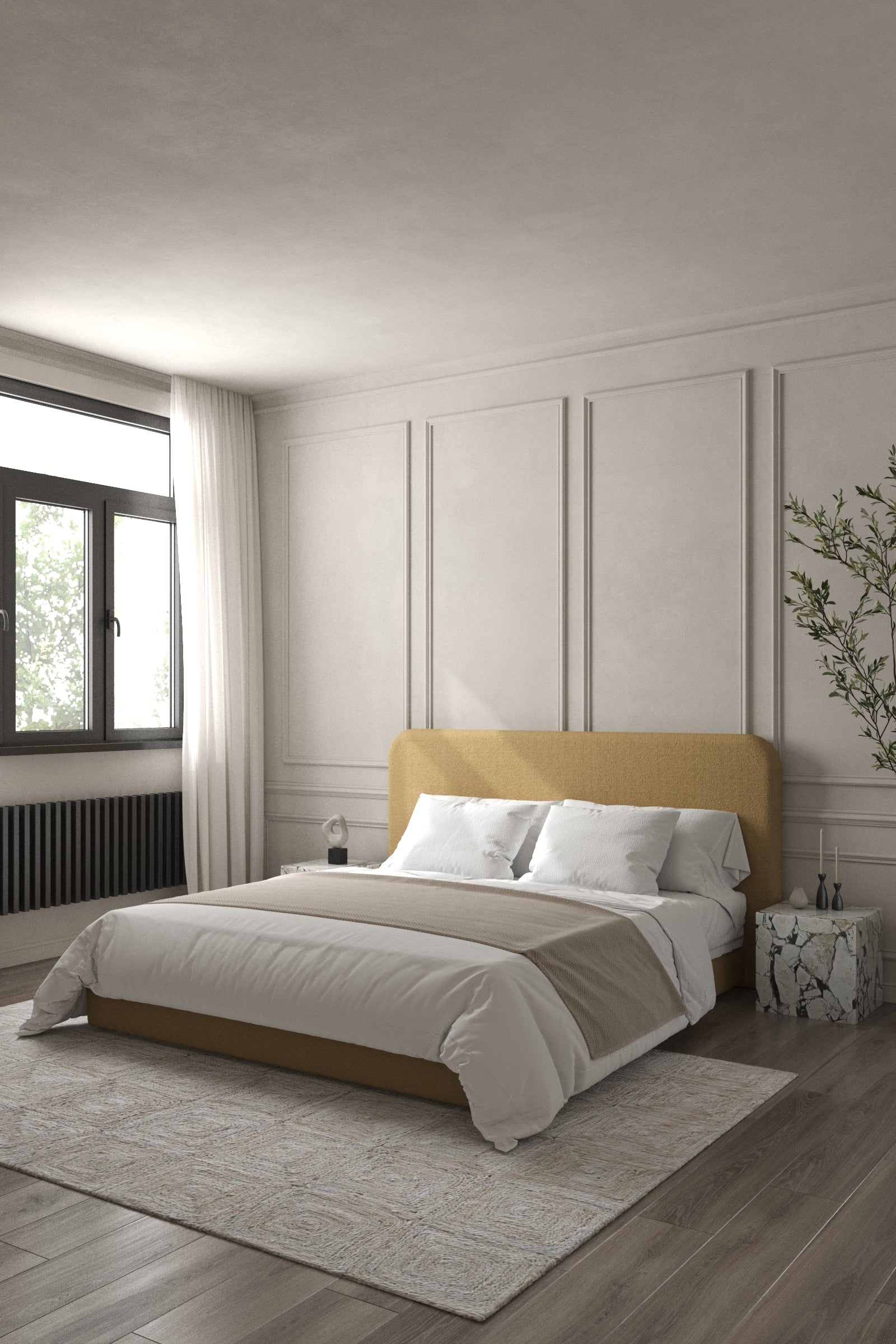 This bed is wrapped in mustard spice fabric with a rounded corners headboard that introduces warmth and character. The textured upholstery adds visual depth while the low-profile frame grounds the design, creating a balanced centerpiece for bedrooms. Combining comfort with style, it brings a refined yet inviting tone, making it well-suited for contemporary, neutral, and eclectic interiors.