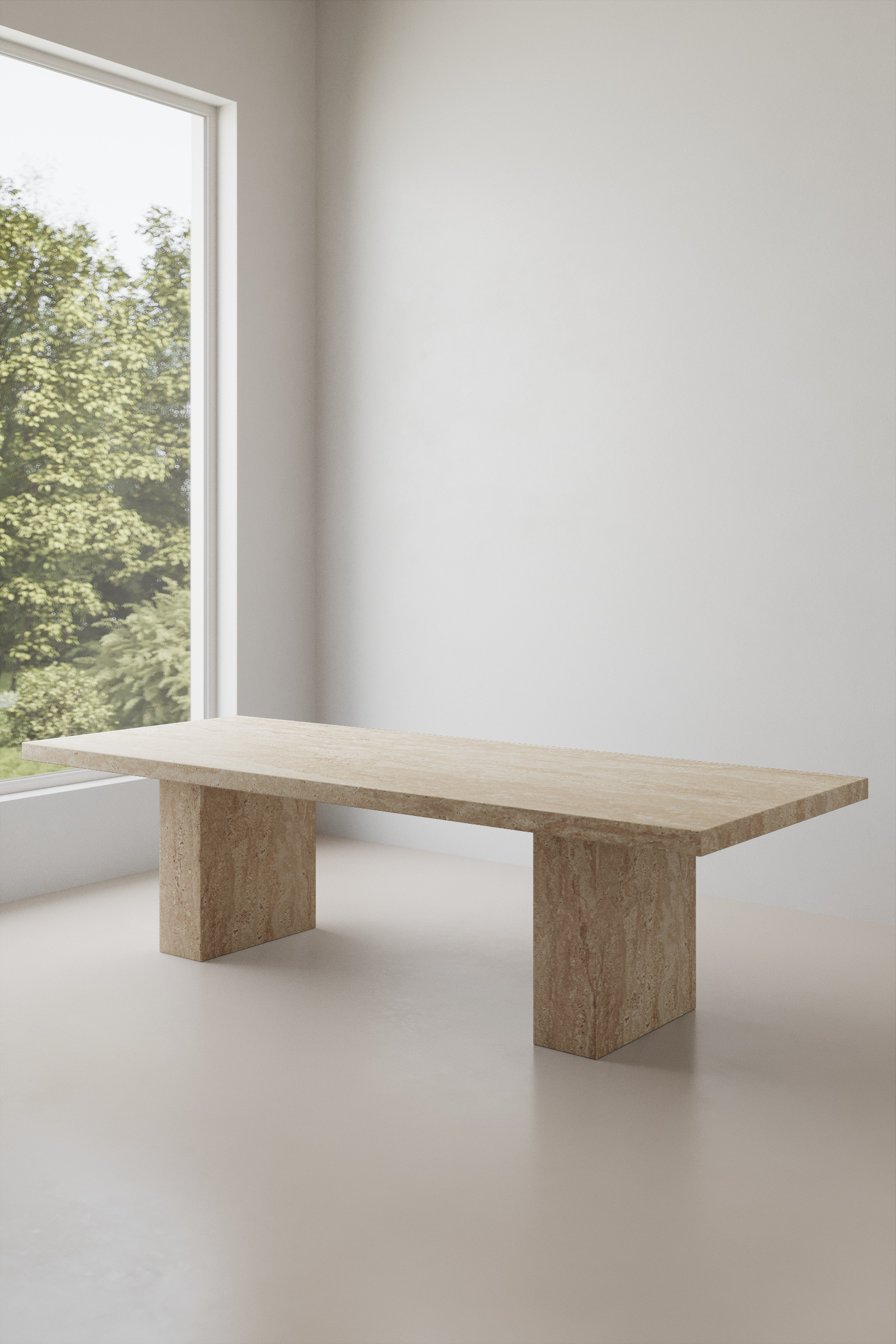 Crafted from premium travertine, this dining table showcases a sleek rectangular top supported by two sturdy block legs, offering a striking balance of minimalism and grandeur. The natural stone surface features distinctive textures and organic patterns, enhancing its timeless appeal. Designed to elevate modern, contemporary, and minimalist interiors, this statement piece seamlessly complements dining spaces, creating a refined focal point. Perfect for hosting gatherings or everyday dining, its durable construction ensures lasting elegance.
