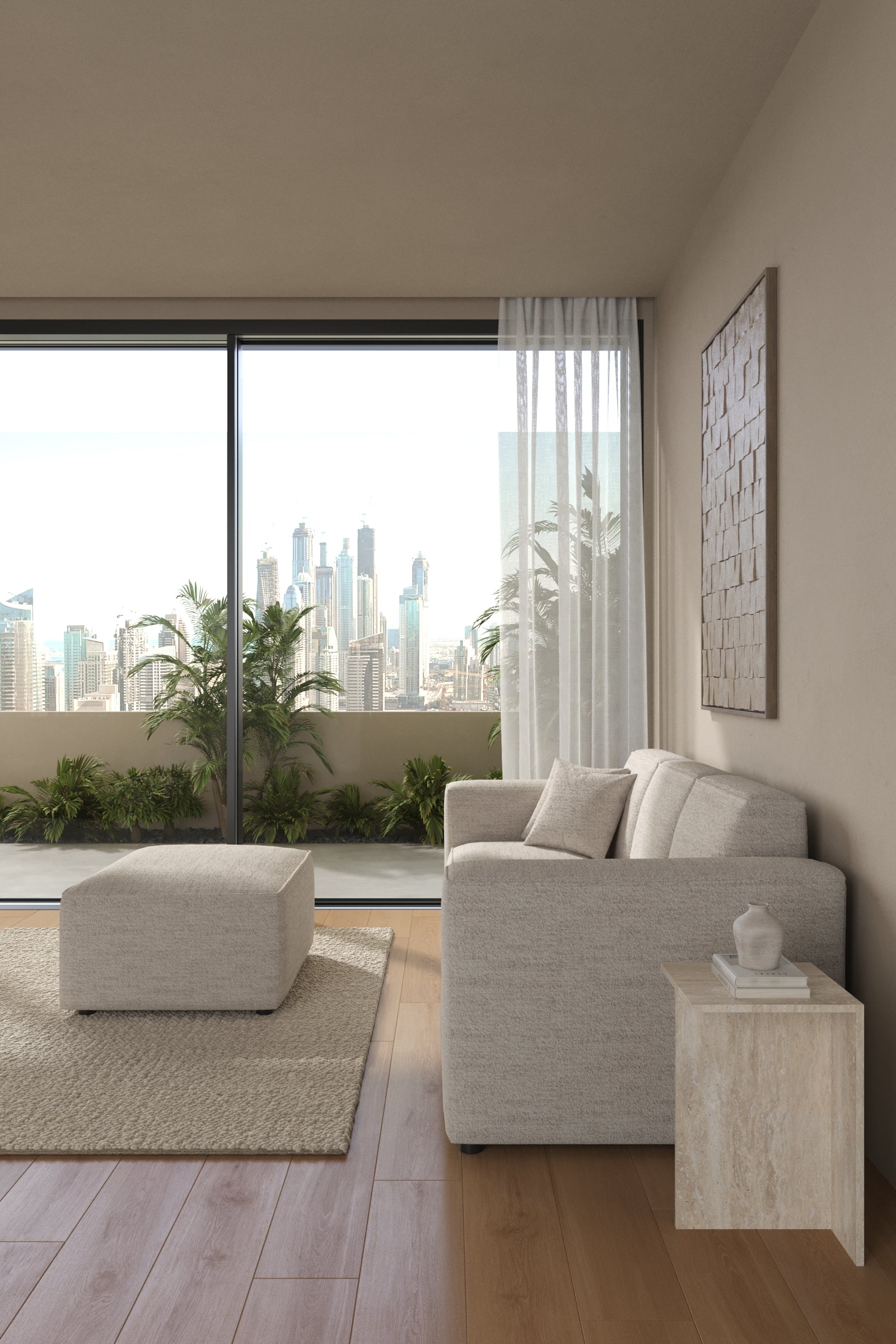 Brighten your interiors with the soft and airy oat cream fabric, creating a light, inviting atmosphere. The plush cushions and modular form offer maximum comfort, while the ottoman completes the set with versatile charm.