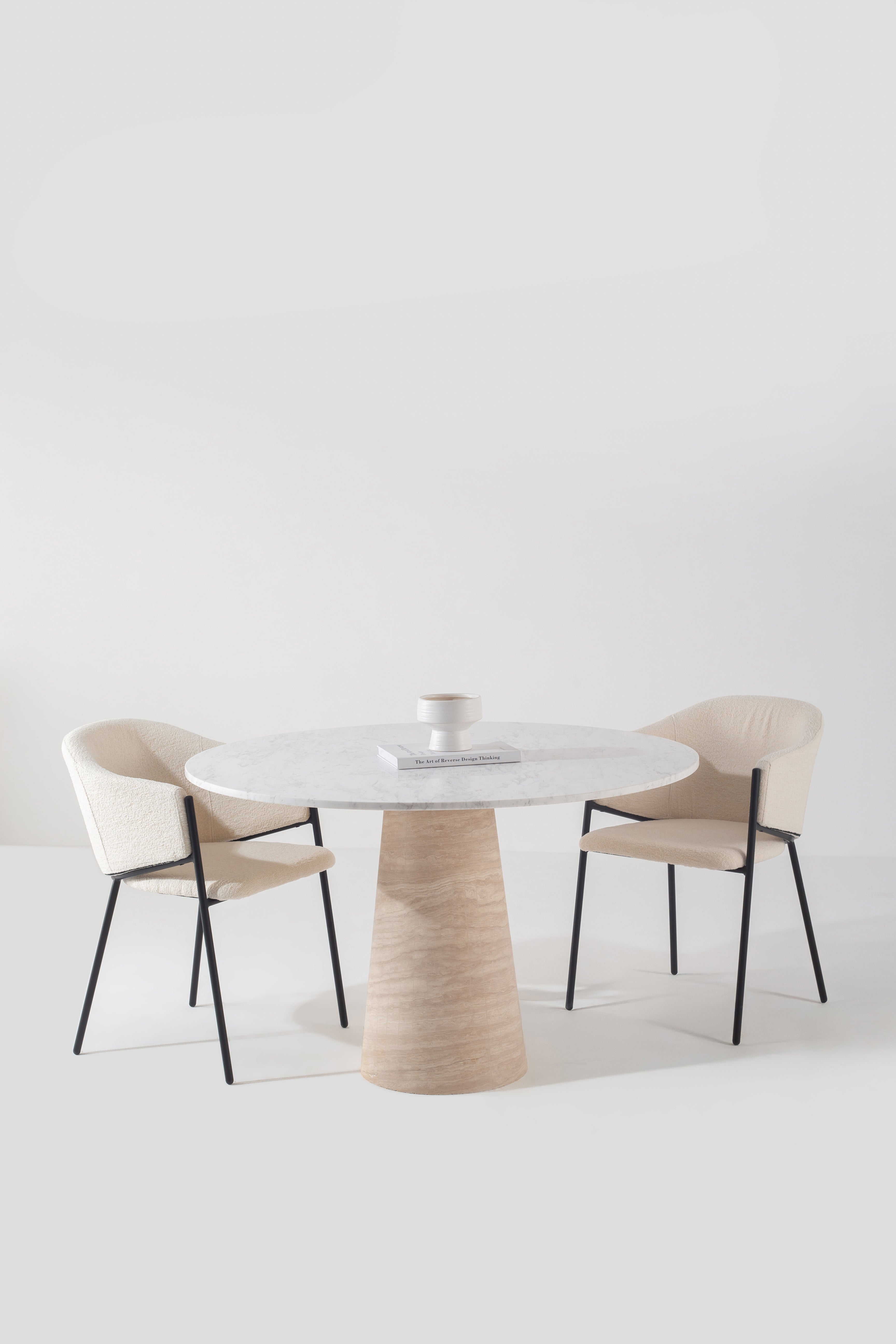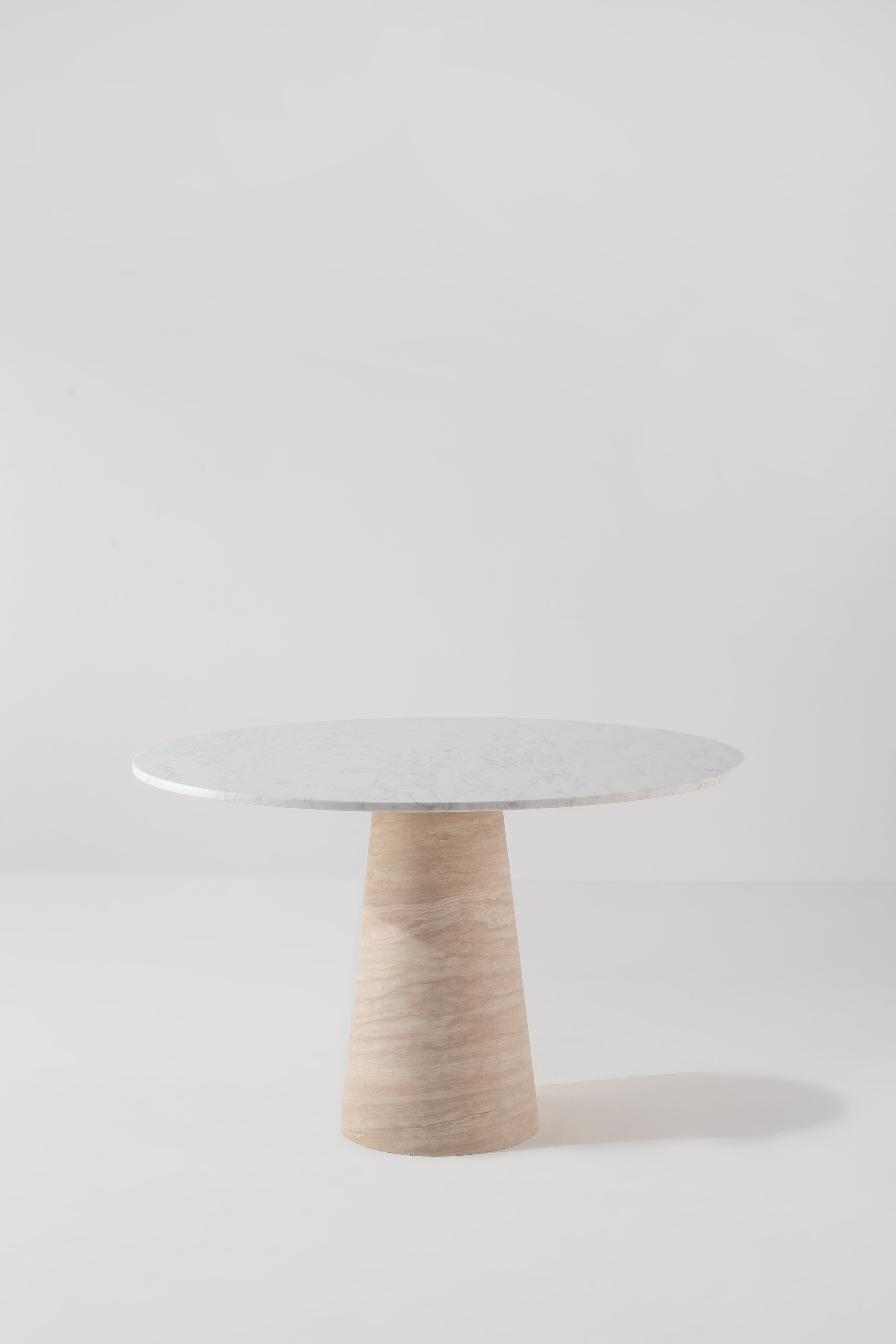 You gather around a statement piece that blends modern elegance with timeless craftsmanship. The round marble top, veined with soft greys, invites conversation, while the sculpted travertine base adds warmth and organic texture. Its conical shape provides stability without overwhelming your space, letting natural light dance across its surface. Whether styled for intimate dinners or artistic centerpieces, this dining table transforms your space into a refined haven, balancing contemporary design with raw, natural beauty.