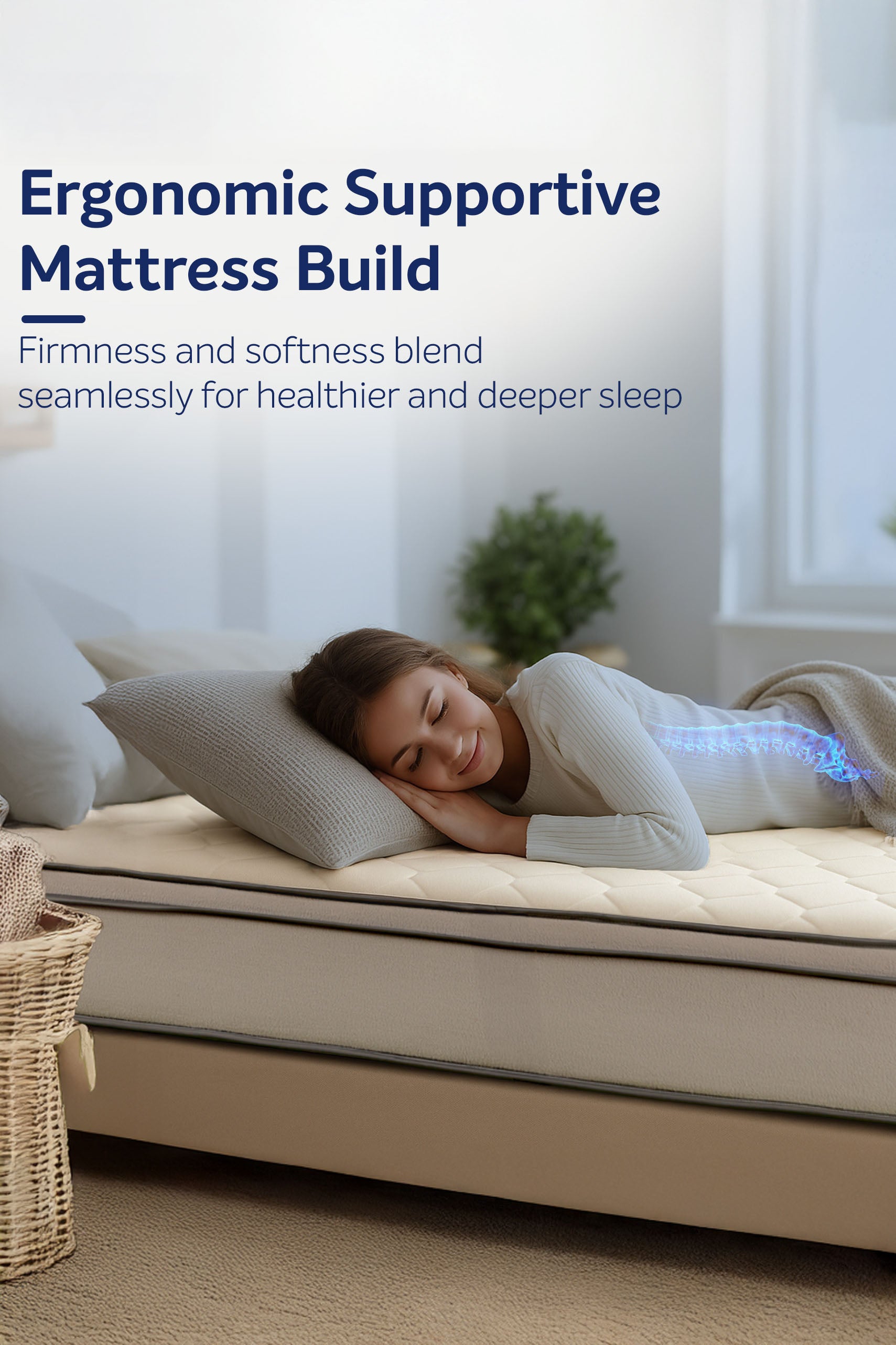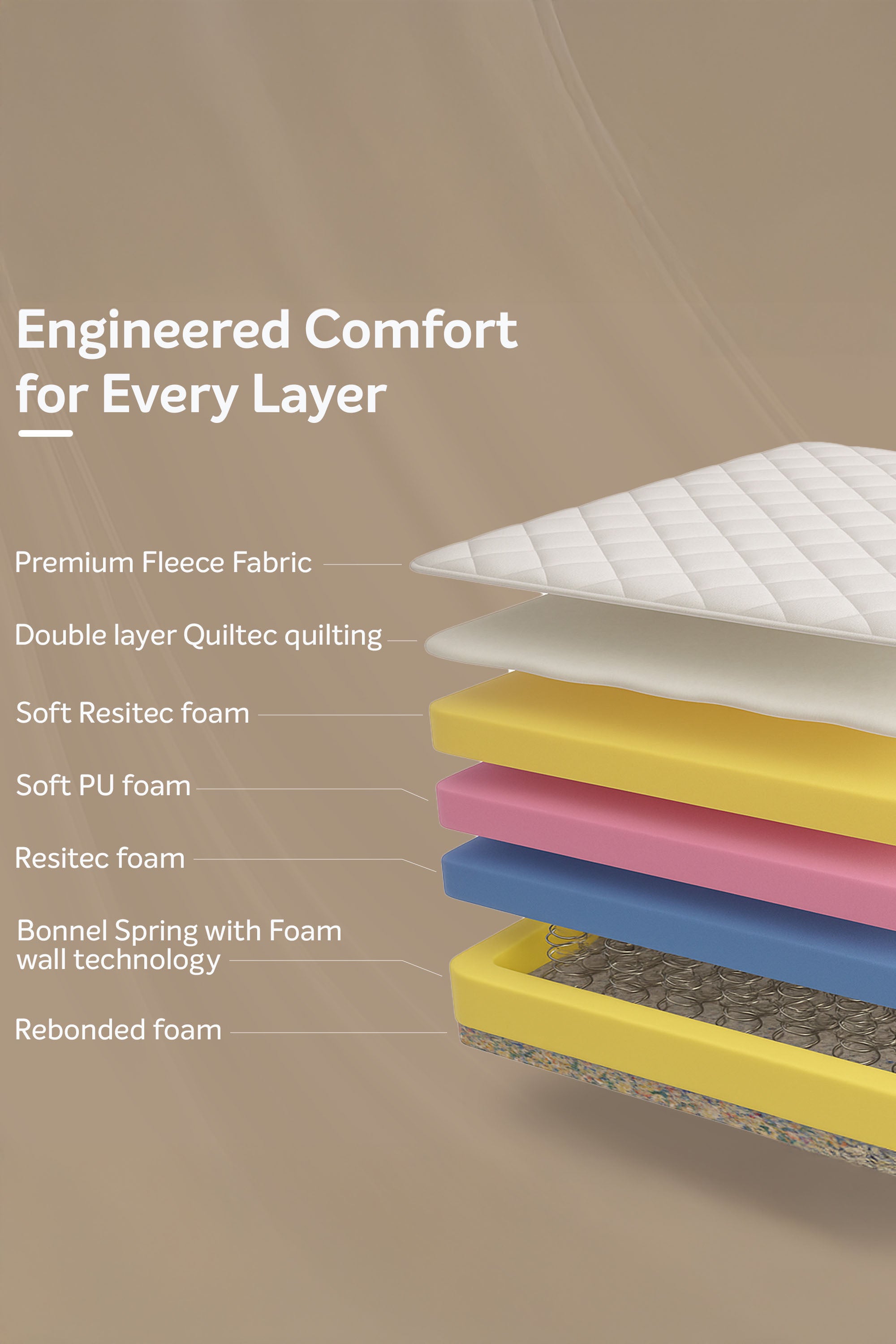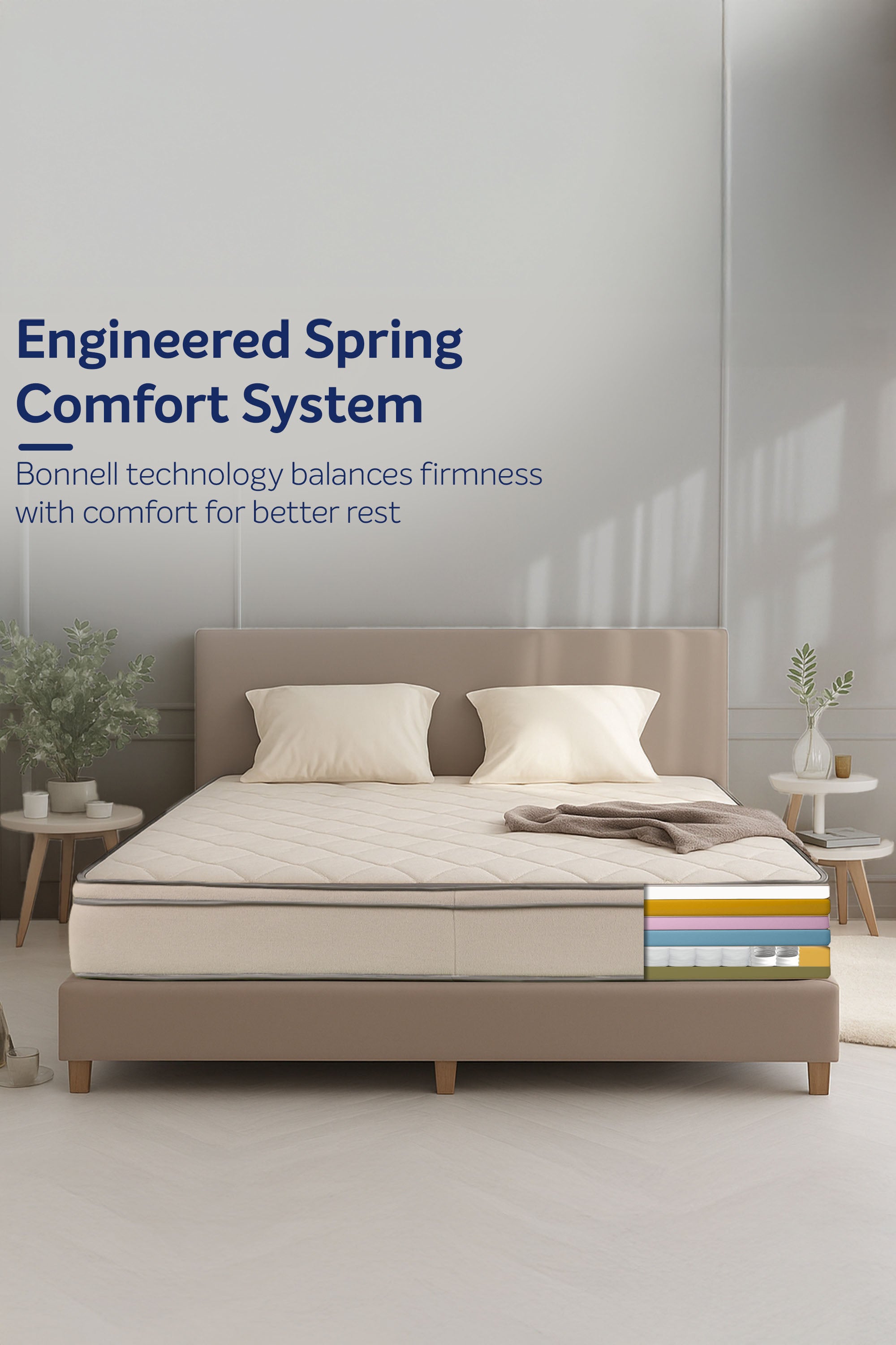 Discover dependable comfort with a Bonnell spring mattress crafted for support and resilience. Built with rebonded foam, it delivers firmness and bounce-free stability. The orthopedic design helps align the spine, while Neem Fresche Technology ensures freshness and hygiene. Ideal for sleepers who value durable comfort and reliable back care.