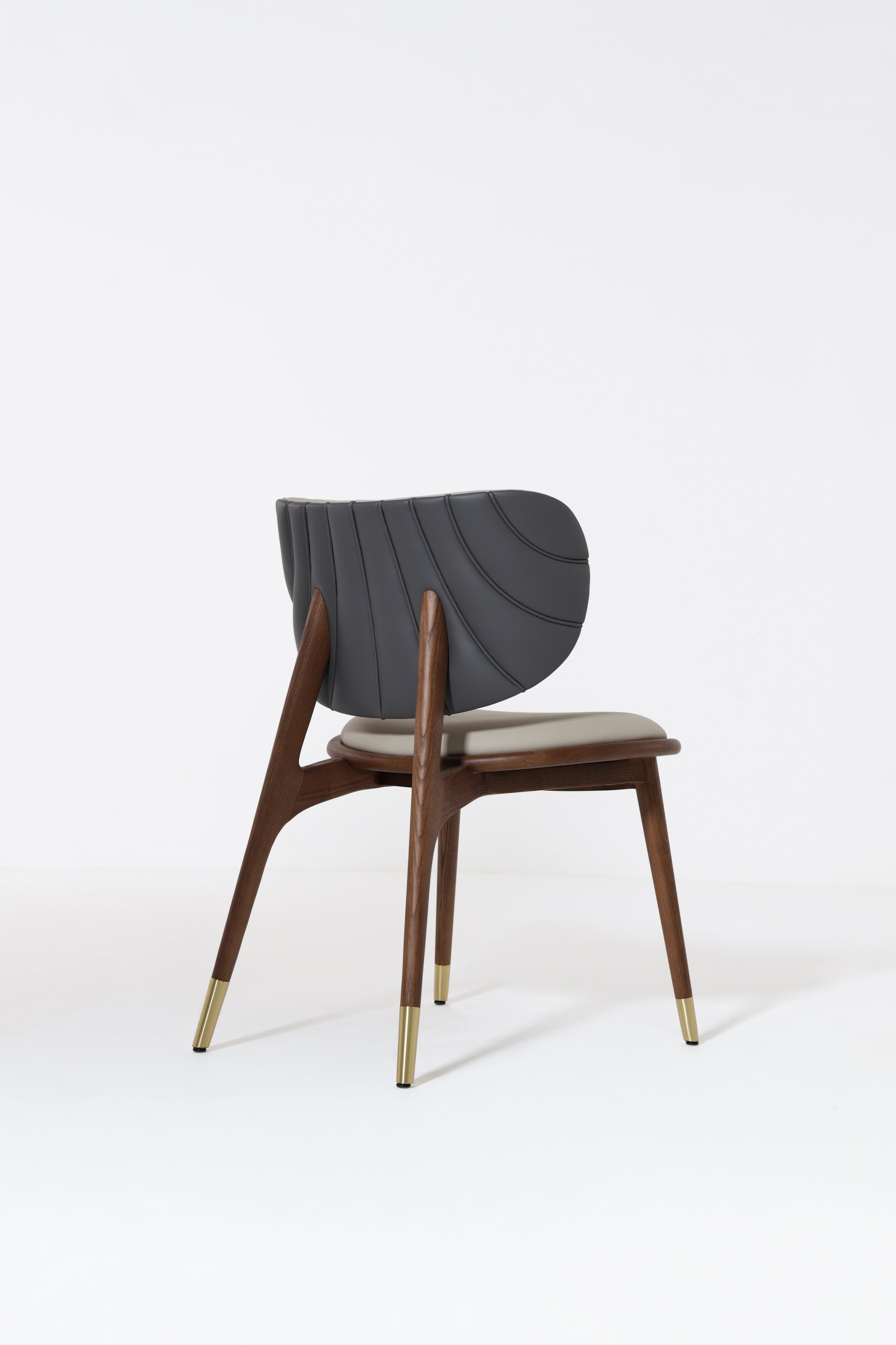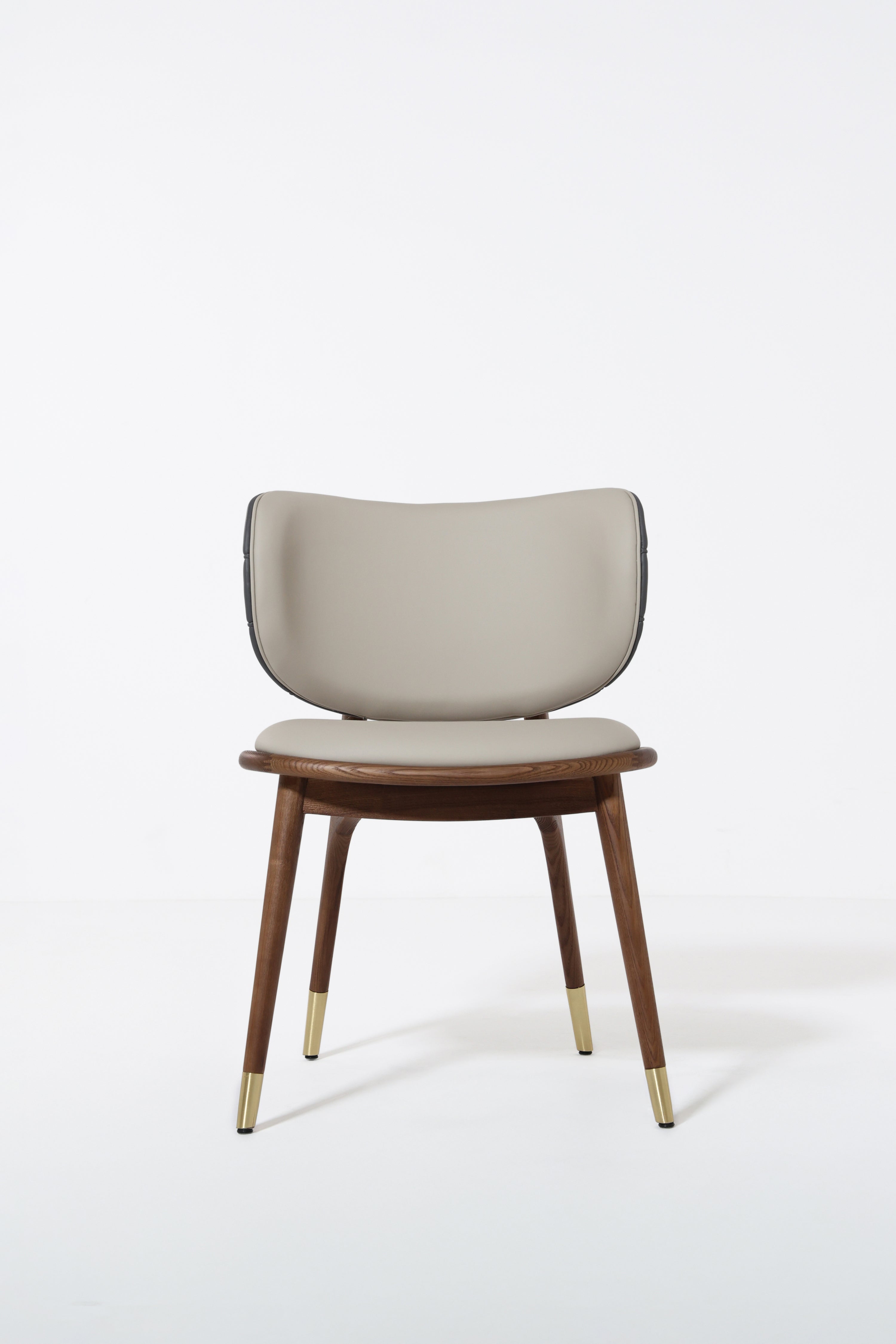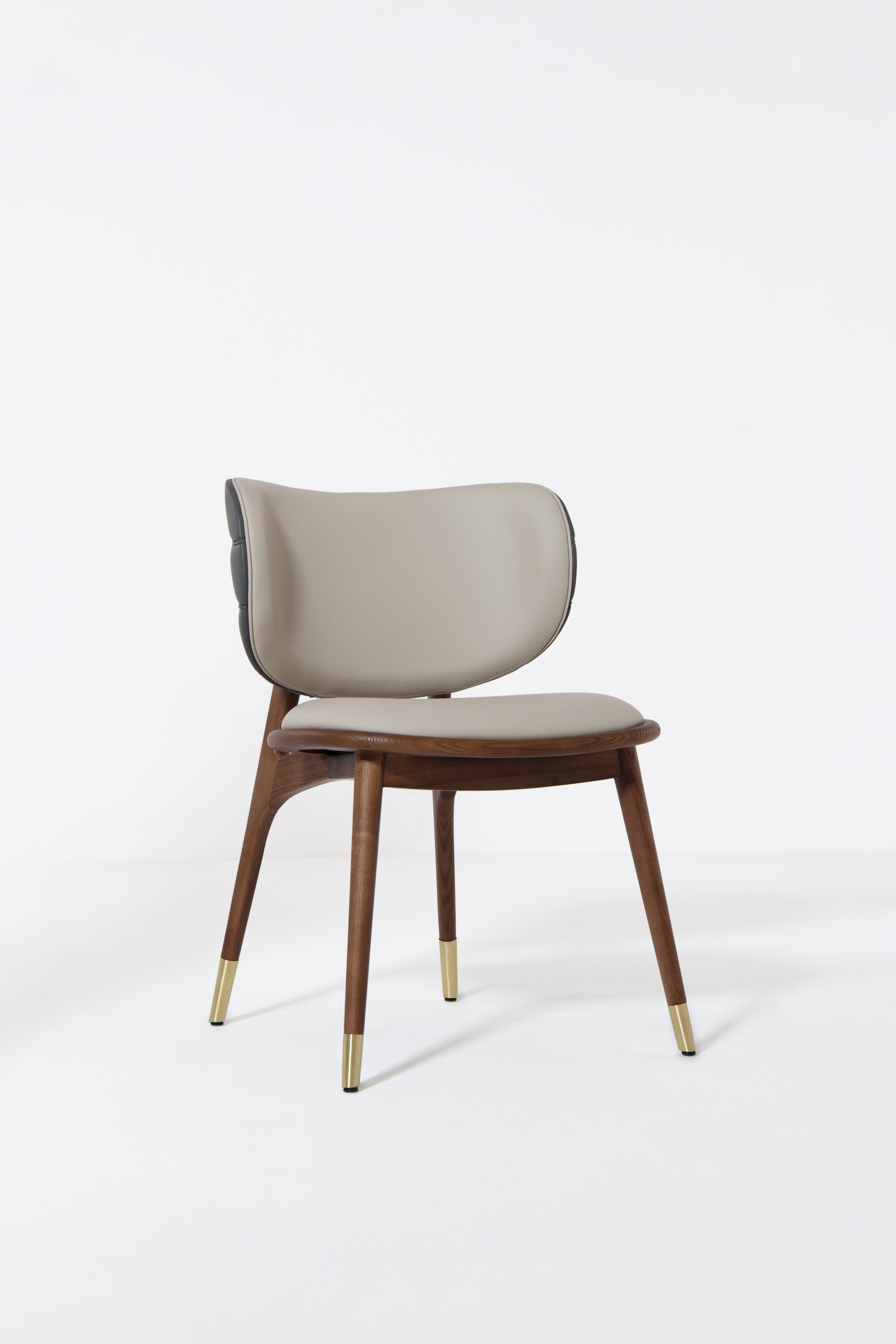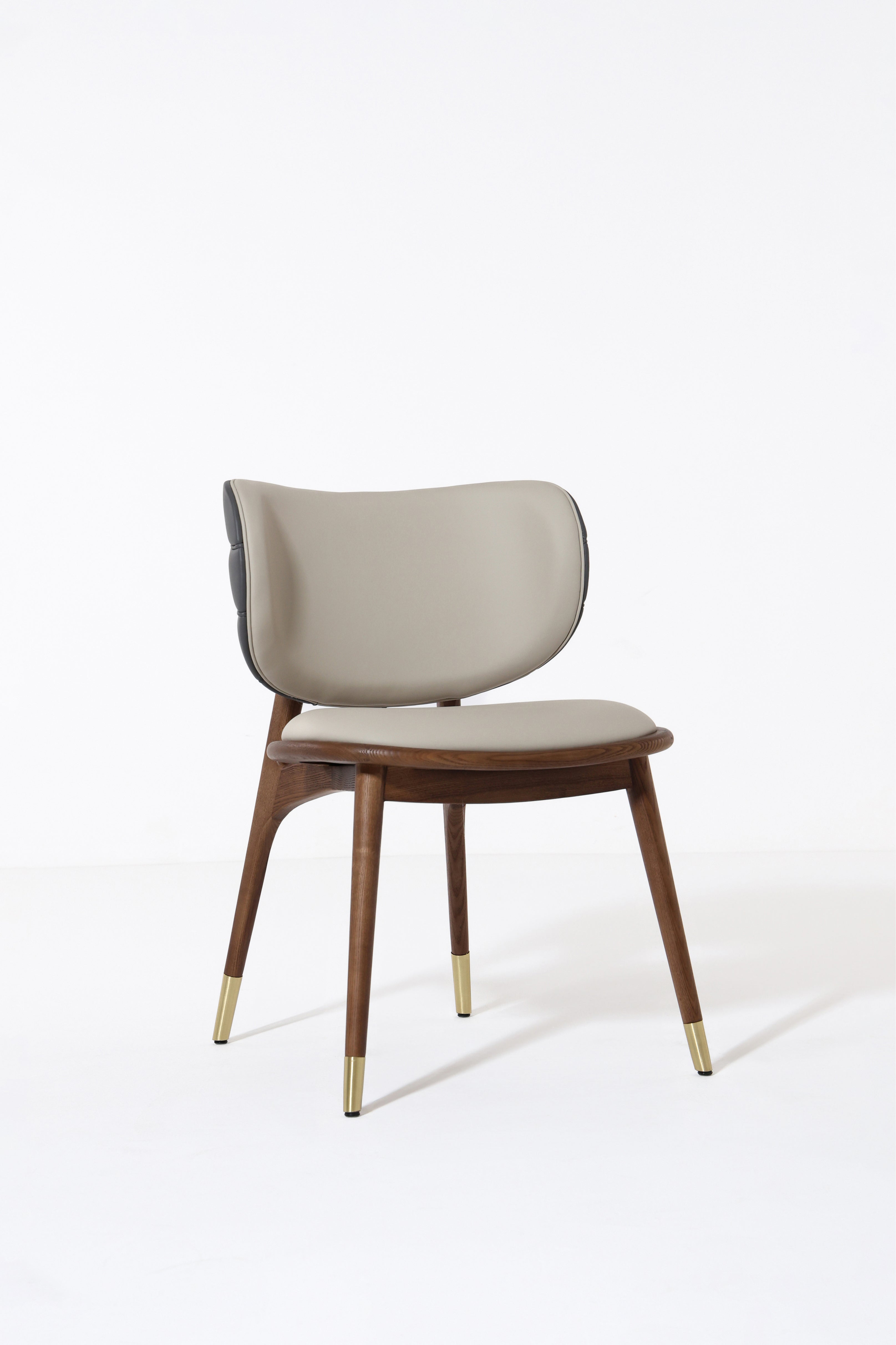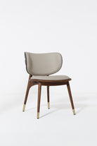 Redefine your dining space with a chair that merges mid-century sophistication and modern elegance. The walnut-finished wooden legs with brass-capped feet add a touch of luxury, while the smooth taupe upholstered seat and curved backrest deliver comfort and refinement. A contrasting back detail enhances its sculptural appeal, making it as stylish as it is supportive. Perfect for contemporary and classic interiors alike, this chair transforms everyday dining into a refined experience.