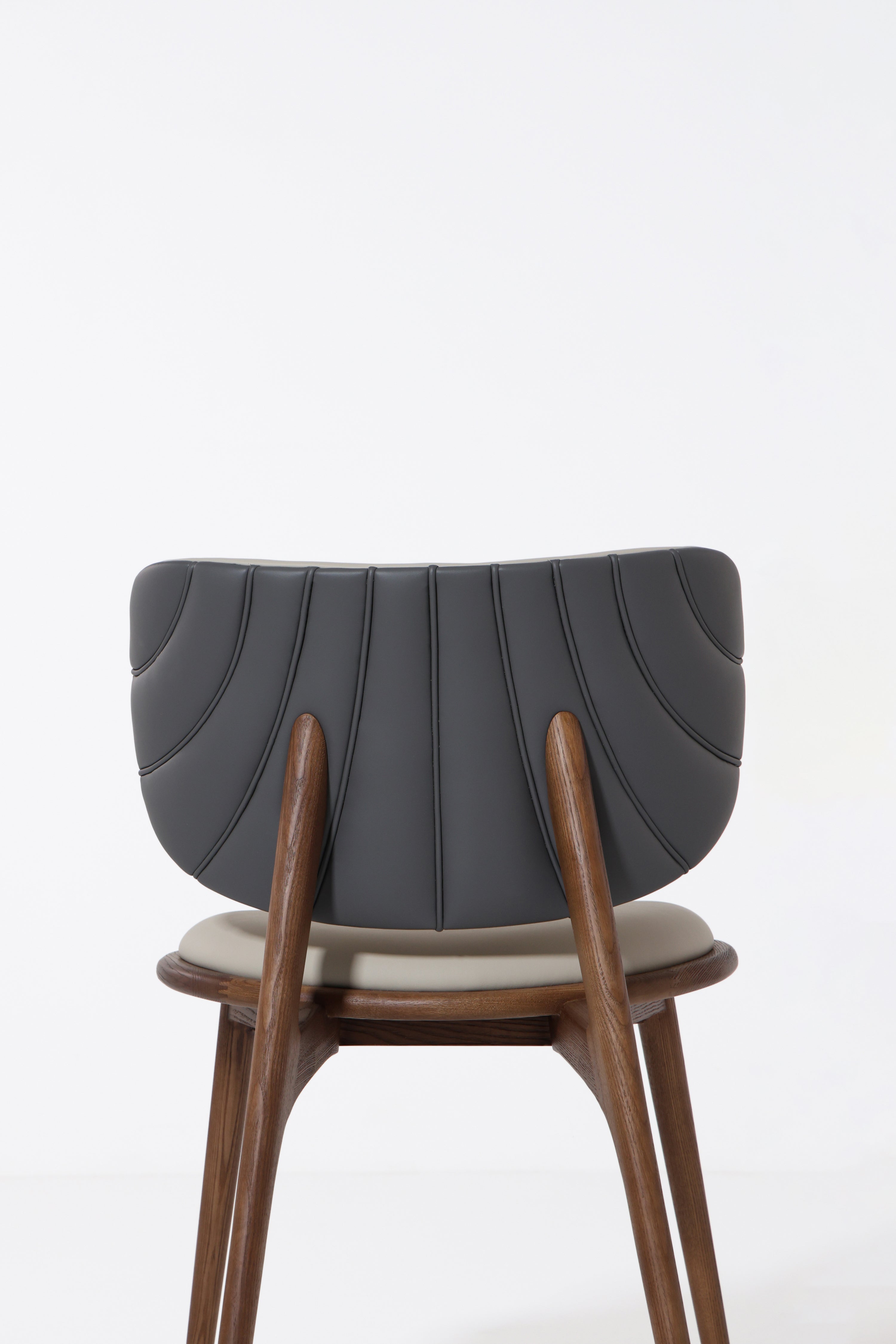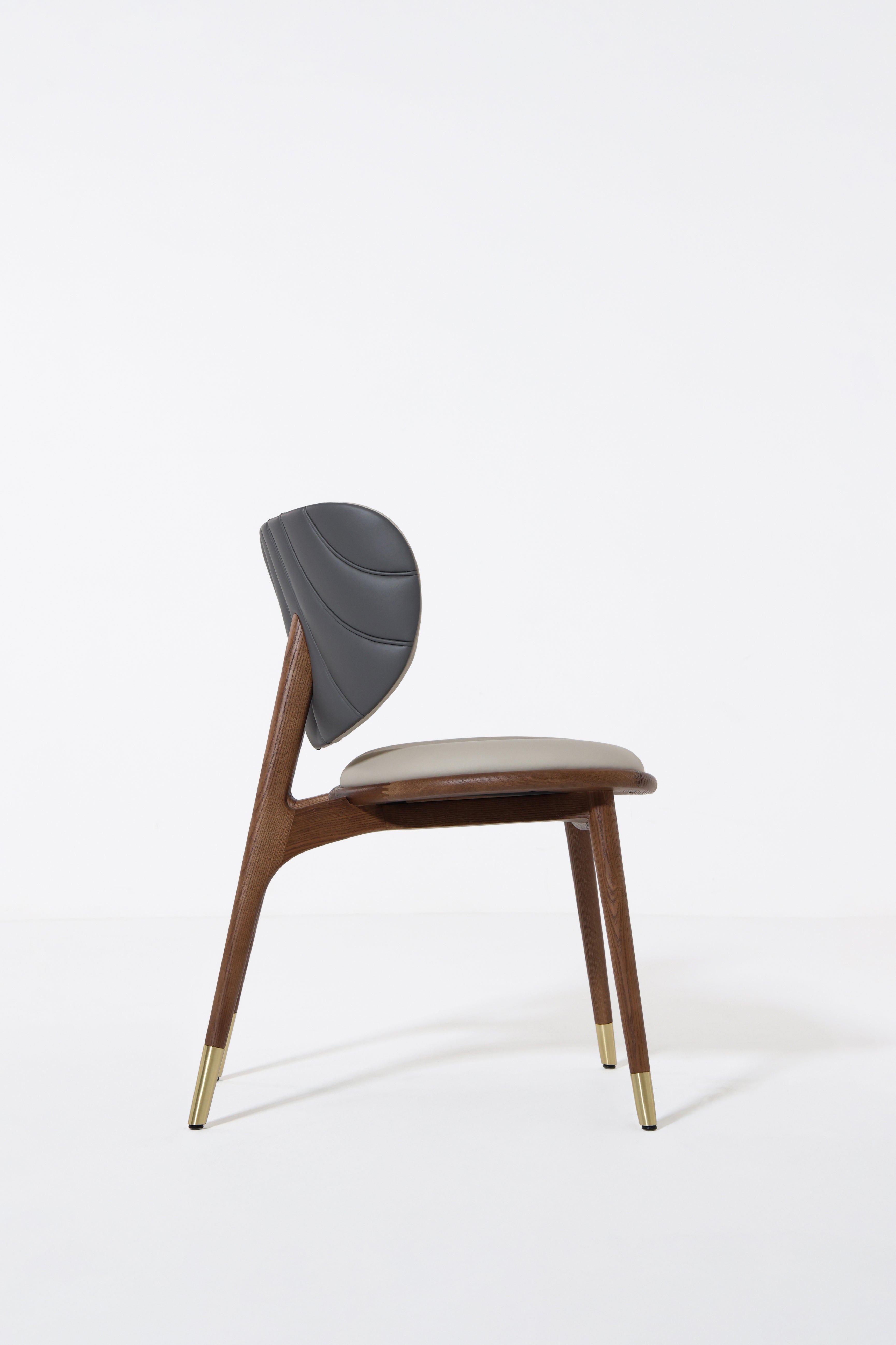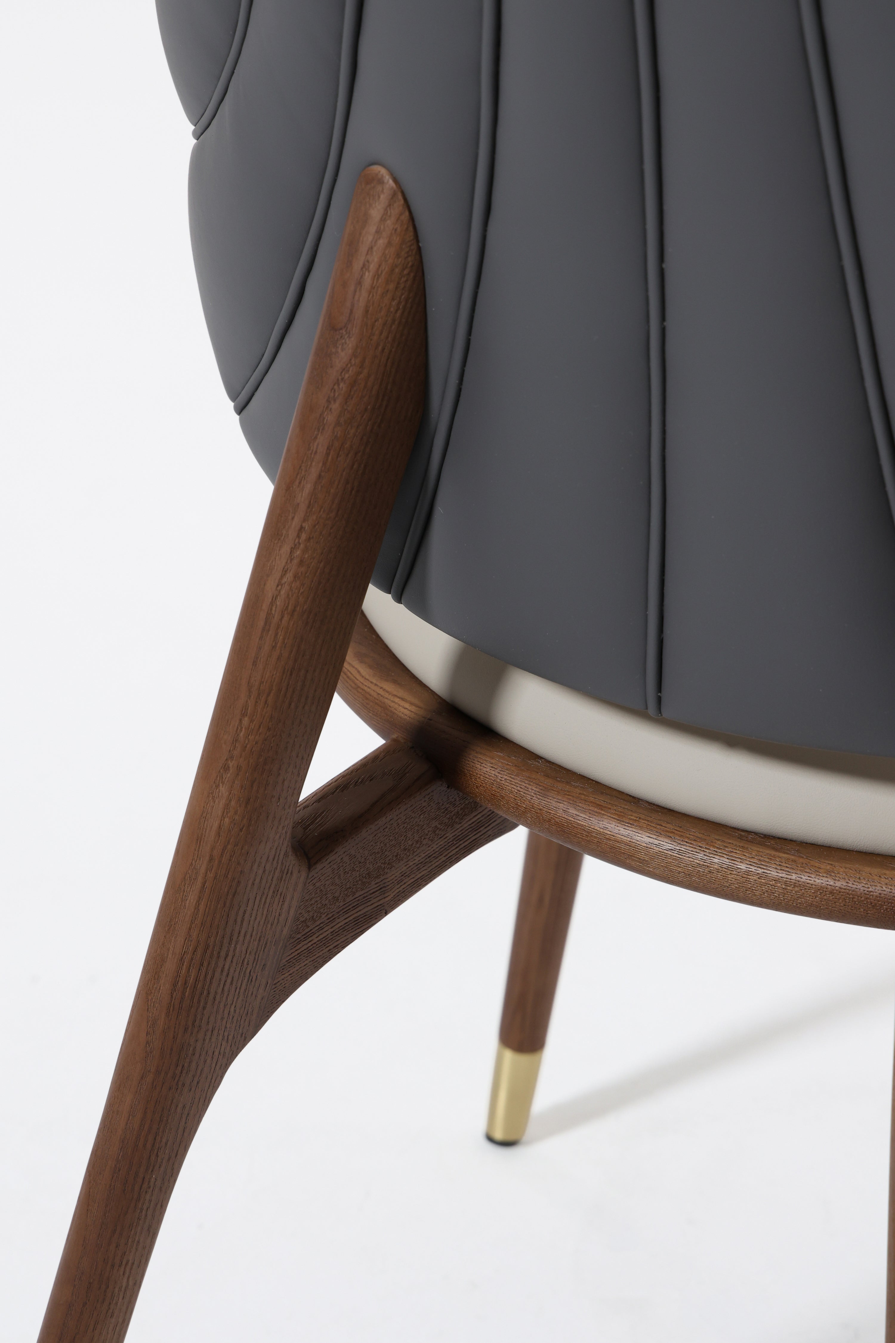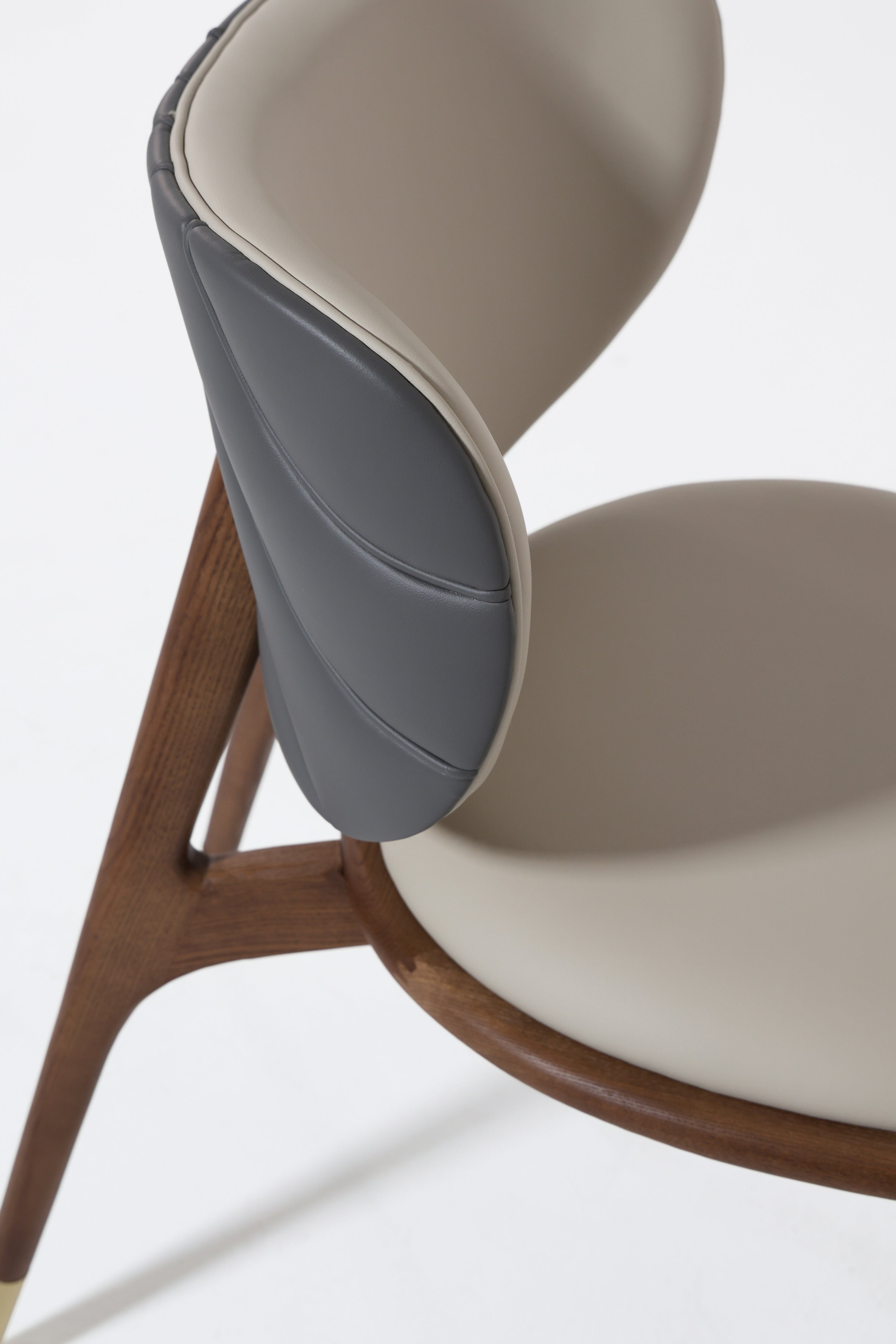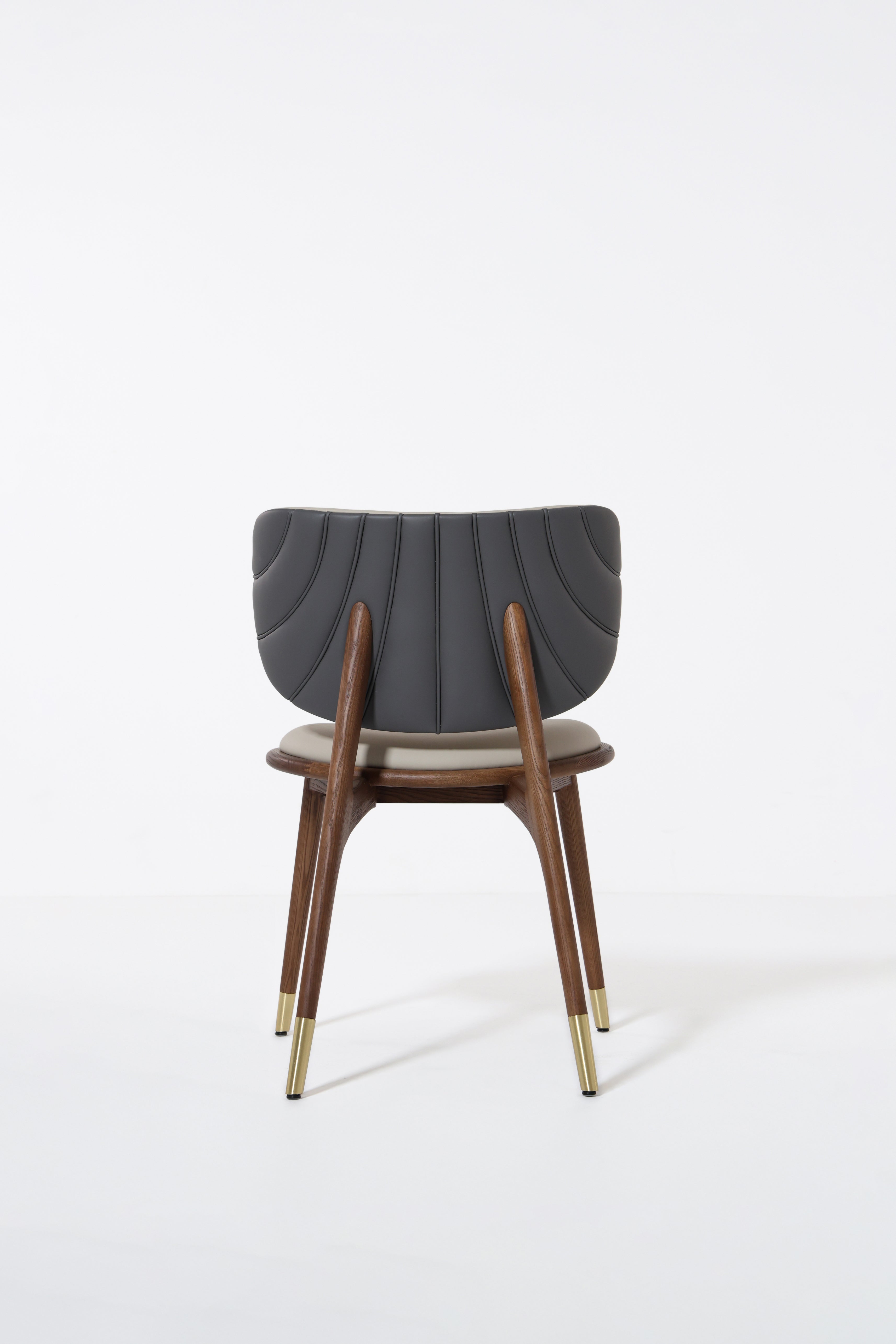 Redefine your dining space with a chair that merges mid-century sophistication and modern elegance. The walnut-finished wooden legs with brass-capped feet add a touch of luxury, while the smooth taupe upholstered seat and curved backrest deliver comfort and refinement. A contrasting back detail enhances its sculptural appeal, making it as stylish as it is supportive. Perfect for contemporary and classic interiors alike, this chair transforms everyday dining into a refined experience.