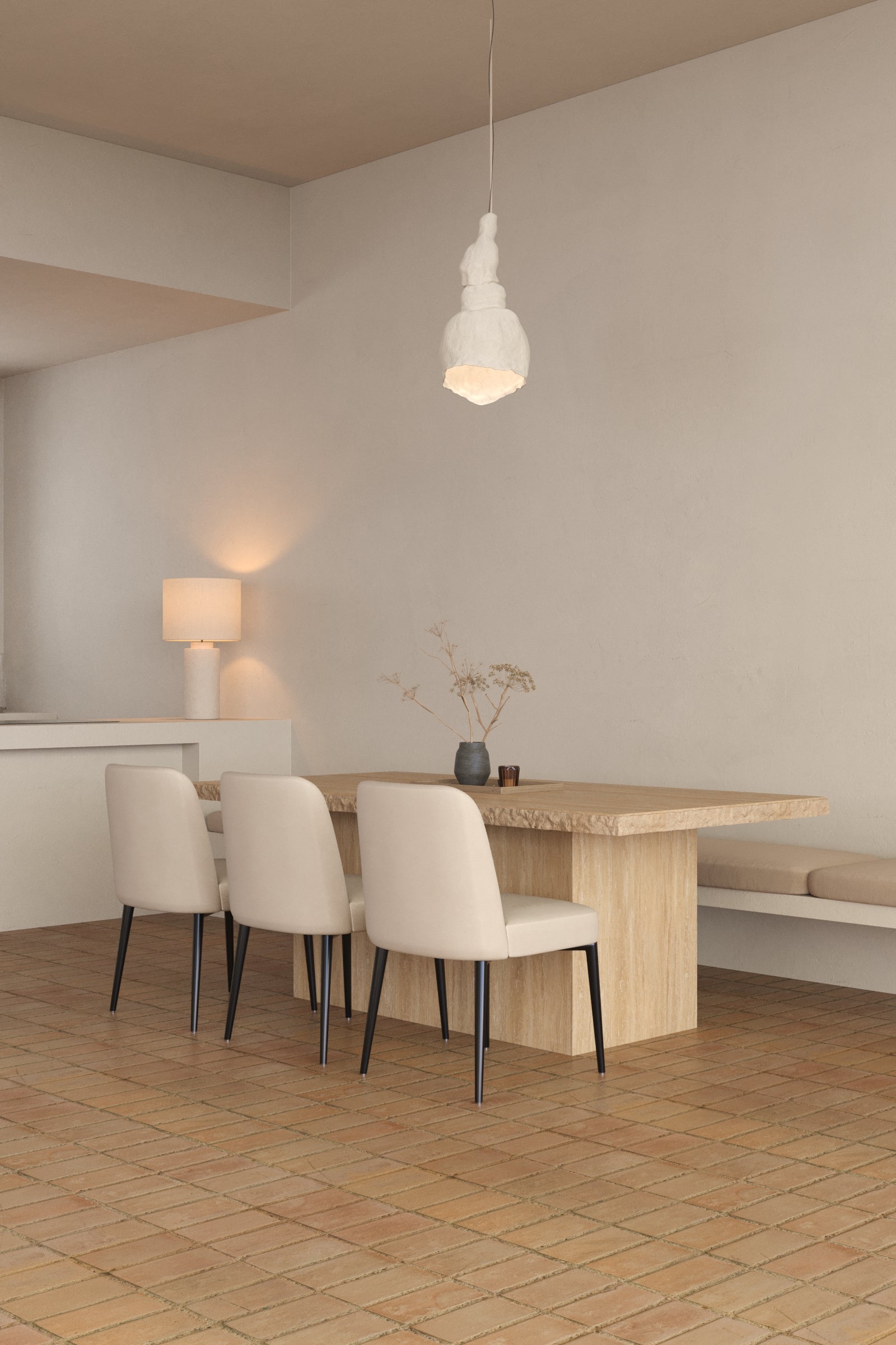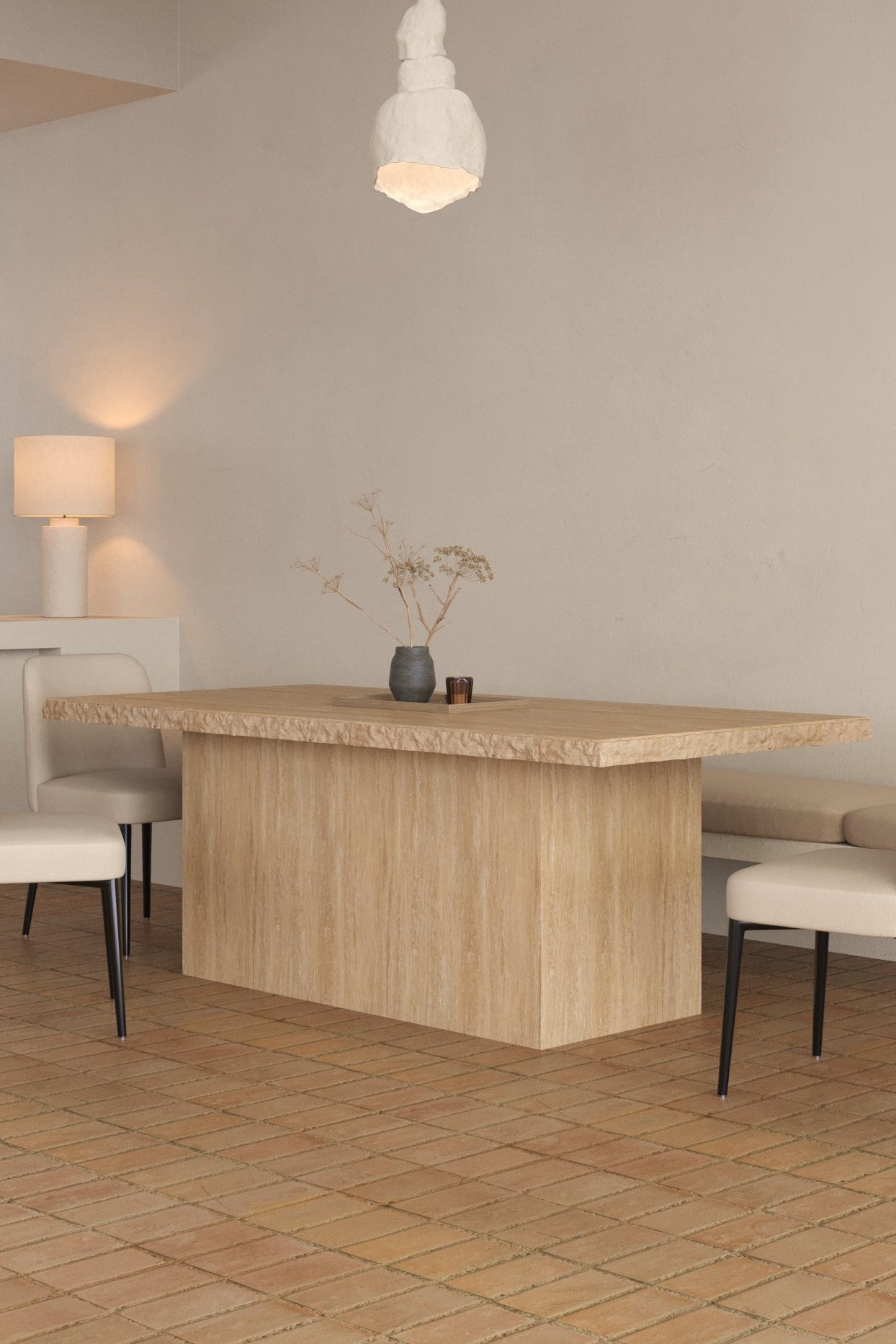 Step into a dining experience shaped around you, where natural artistry meets refined living. Crafted from honed travertine, this elegant centerpiece captures the essence of modern Mediterranean design. The soft beige and cream tones, enhanced by the stone’s subtle veining, evoke warmth and tranquility under natural light. Its rectangular silhouette and monolithic base ground your space in organic sophistication, while the matte finish highlights every unique texture of the travertine surface. Picture soft shadows dancing across the polished stone as you gather with loved ones, a tactile story of nature, light, and timeless craftsmanship.