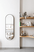 Upgrade your vanity area with our Black Oval Mirror Wall Mirror. The sleek oval shape adds a touch of elegance, while the black finish brings a modern aesthetic. This mirror is a perfect addition to any dressing room or bathroom, providing a stylish and functional reflection for your beauty routine.