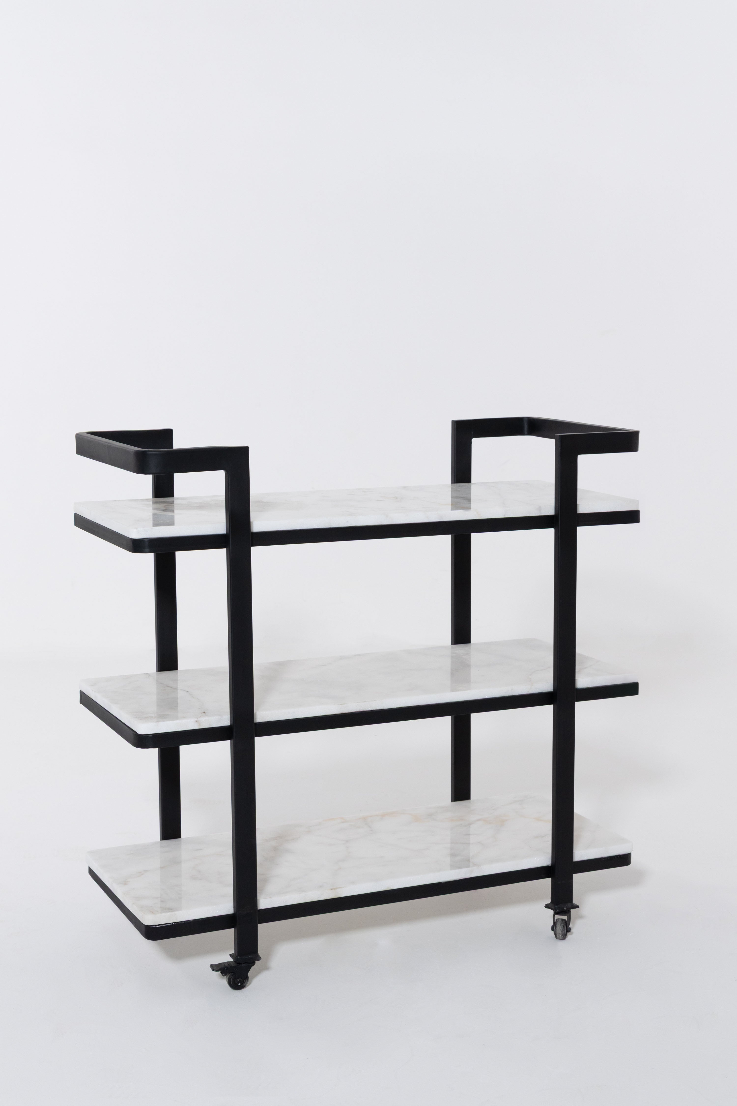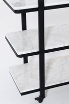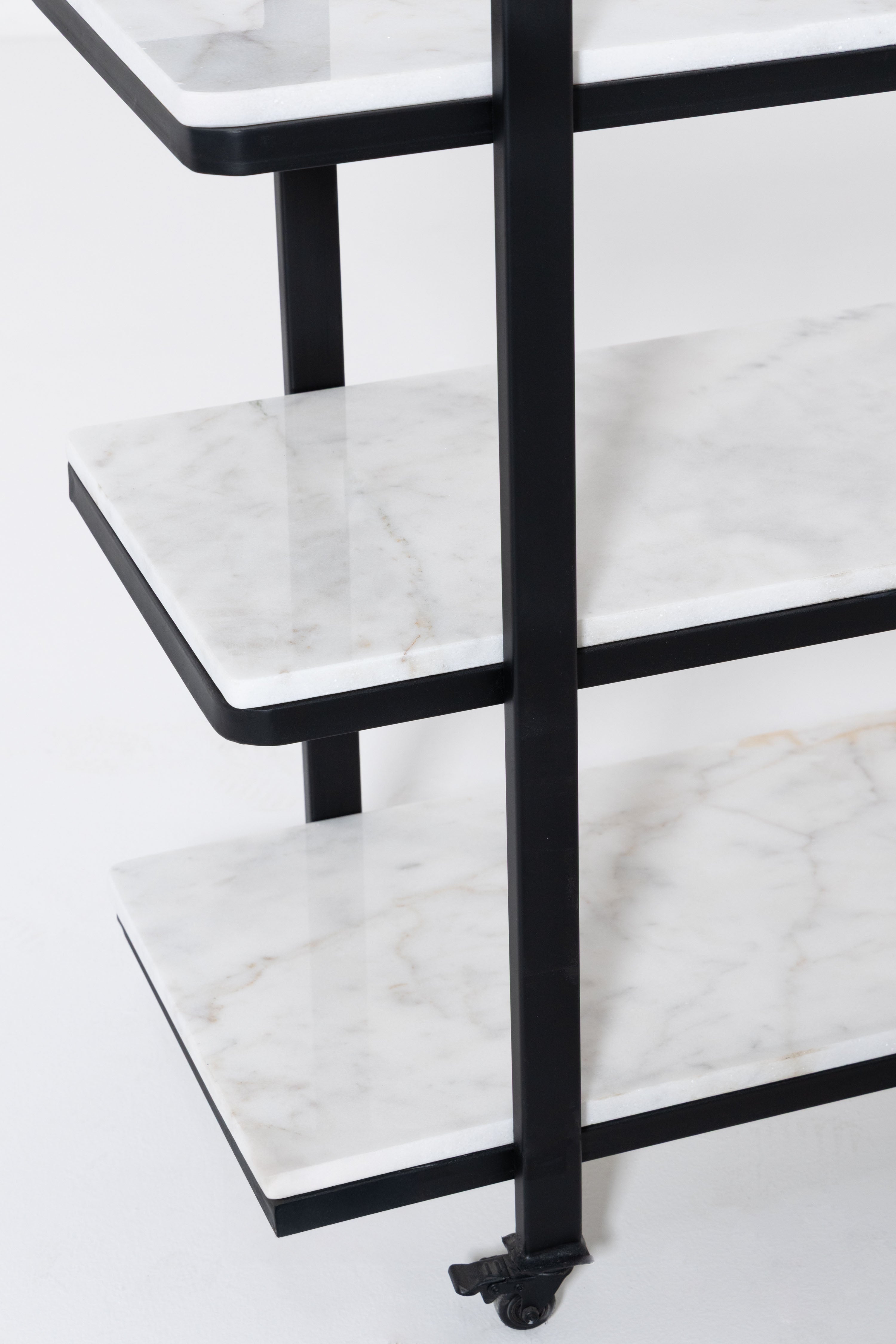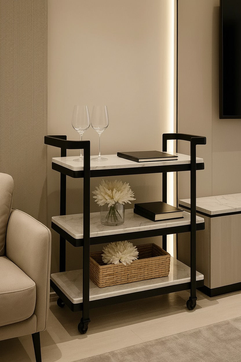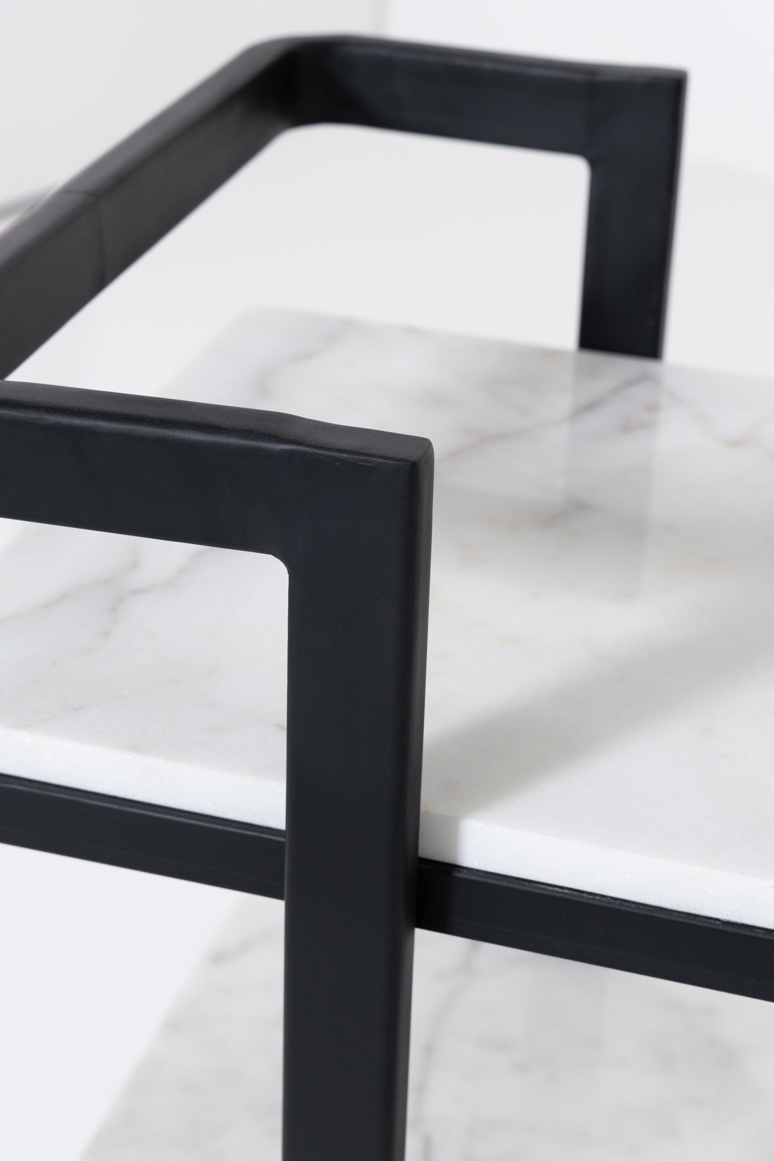 This three-tier trolley features Berche Nouvelle marble shelves with natural grey veining framed in a sleek black metal structure. The cool stone surfaces offer both durability and a refined look, while the open design keeps storage light and practical. Fitted with smooth-rolling castors, it moves easily between rooms, serving as a drinks station, display stand, or mobile shelving. Strong lines, marble detailing, and versatile proportions make it a functional accent that elevates daily living.