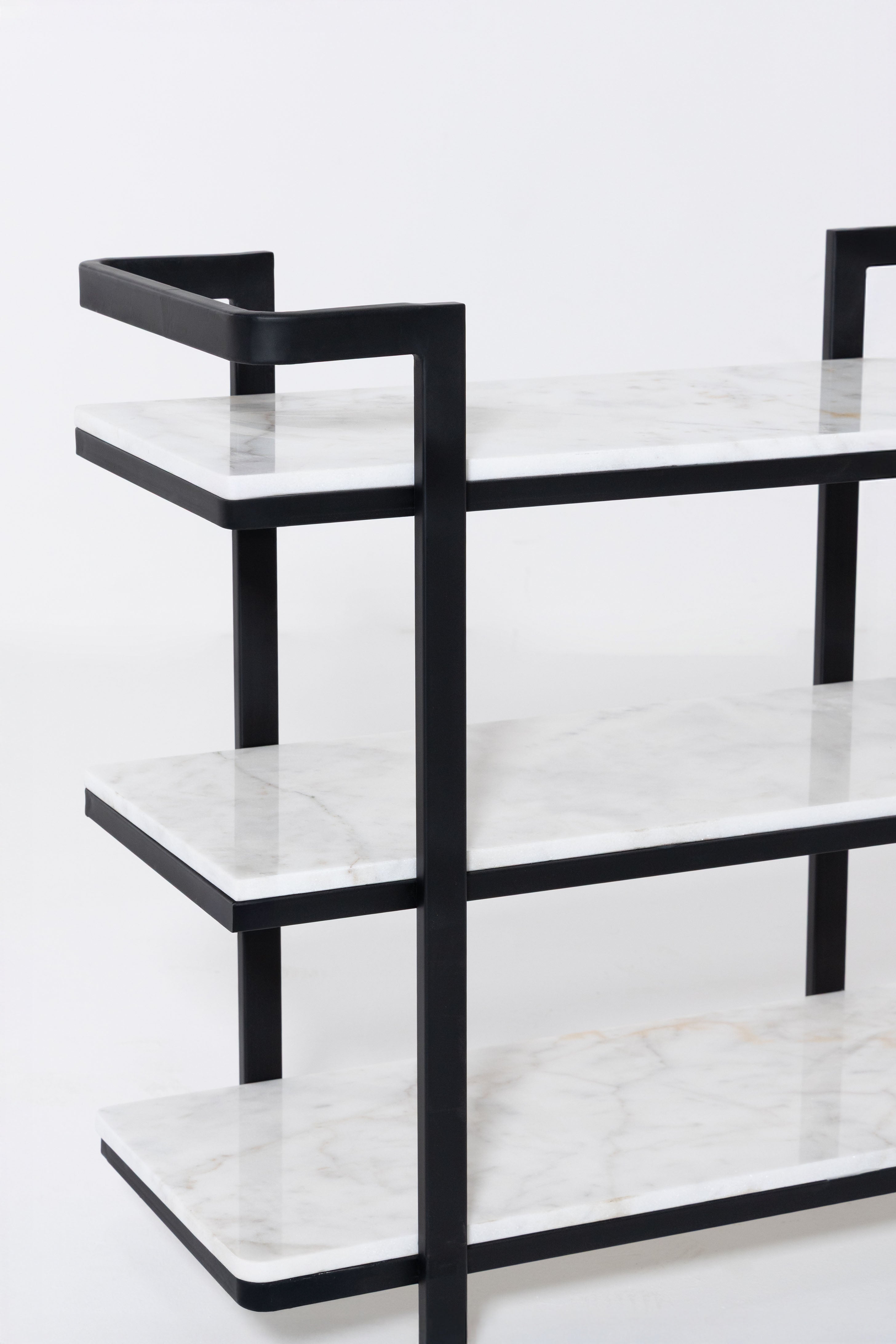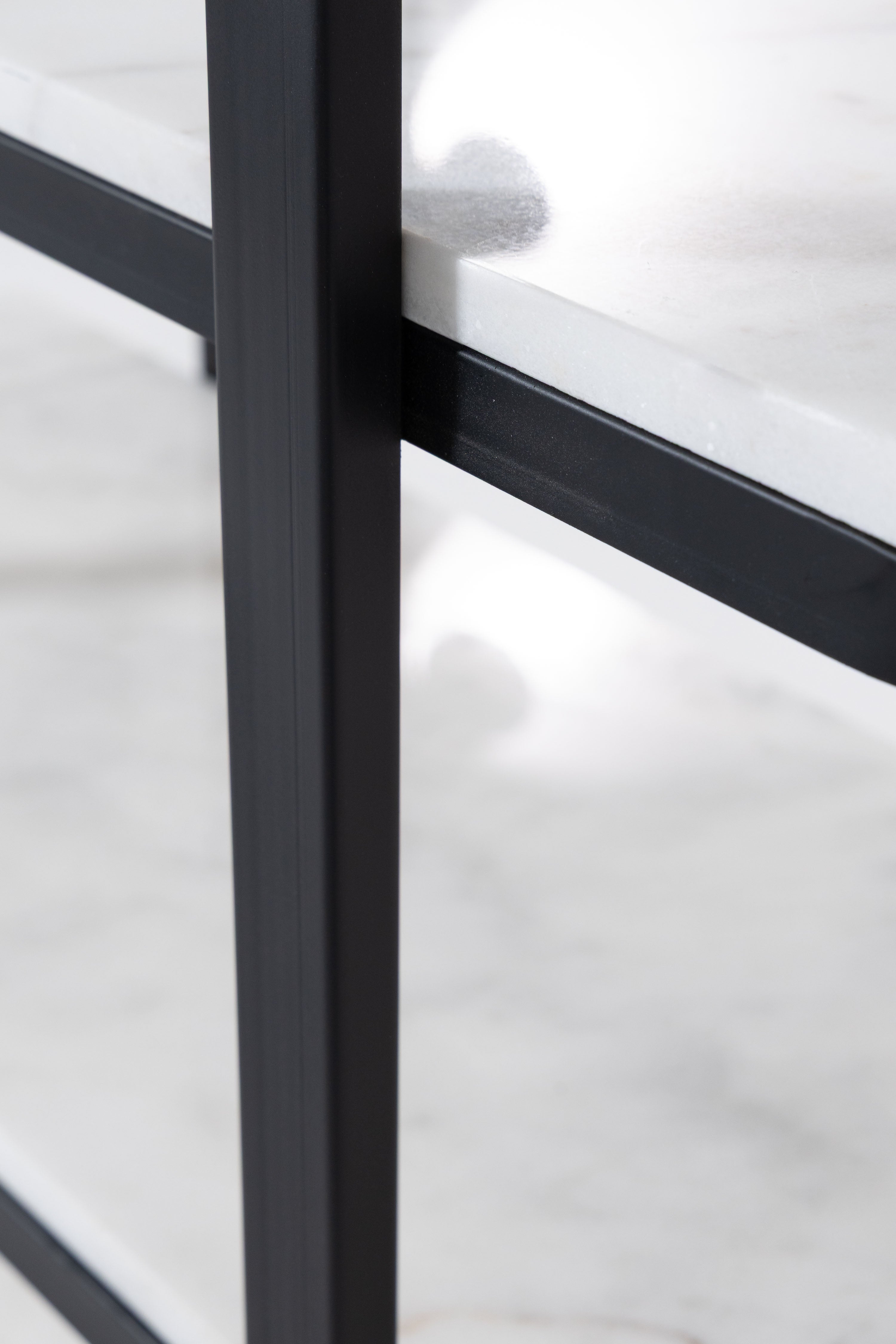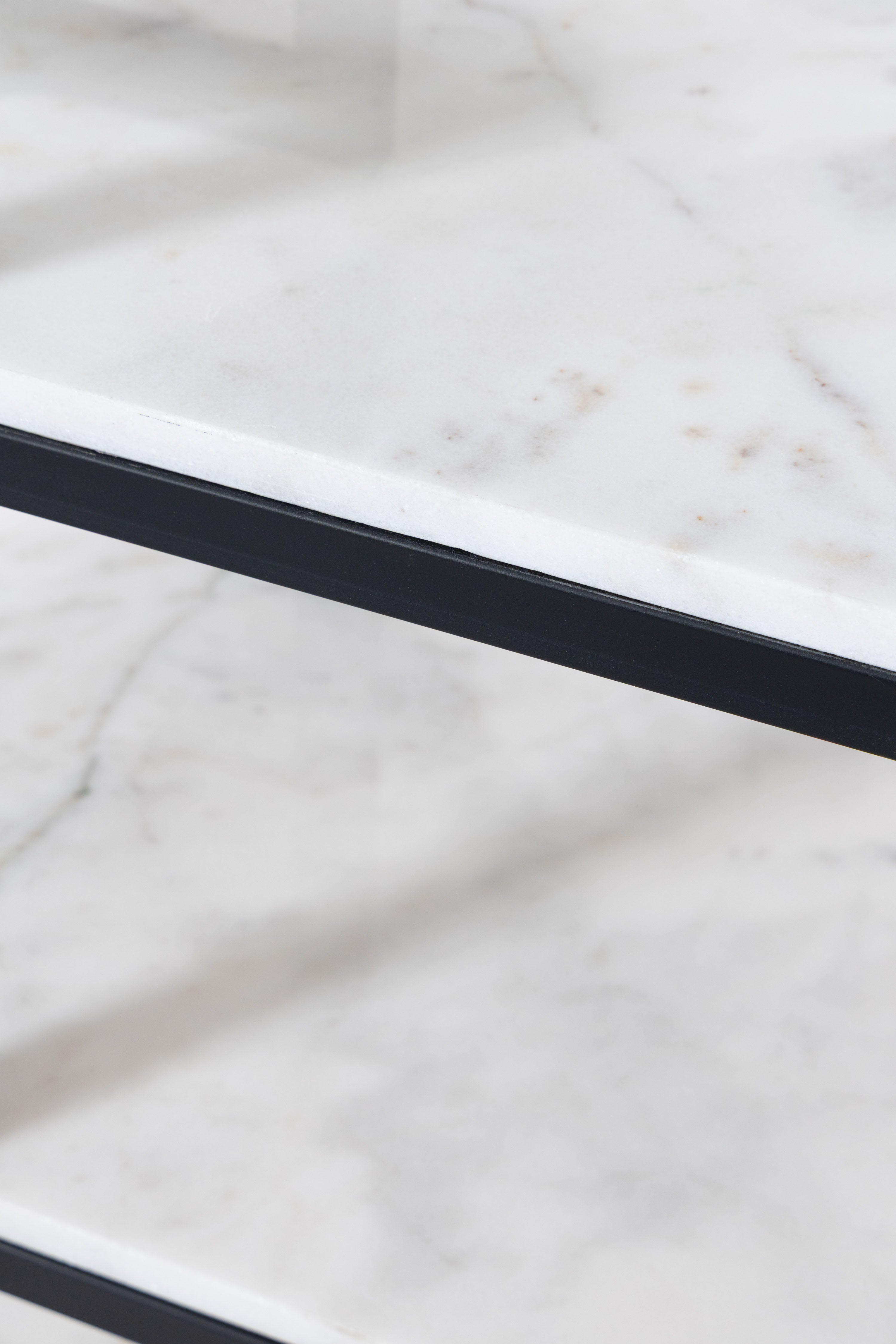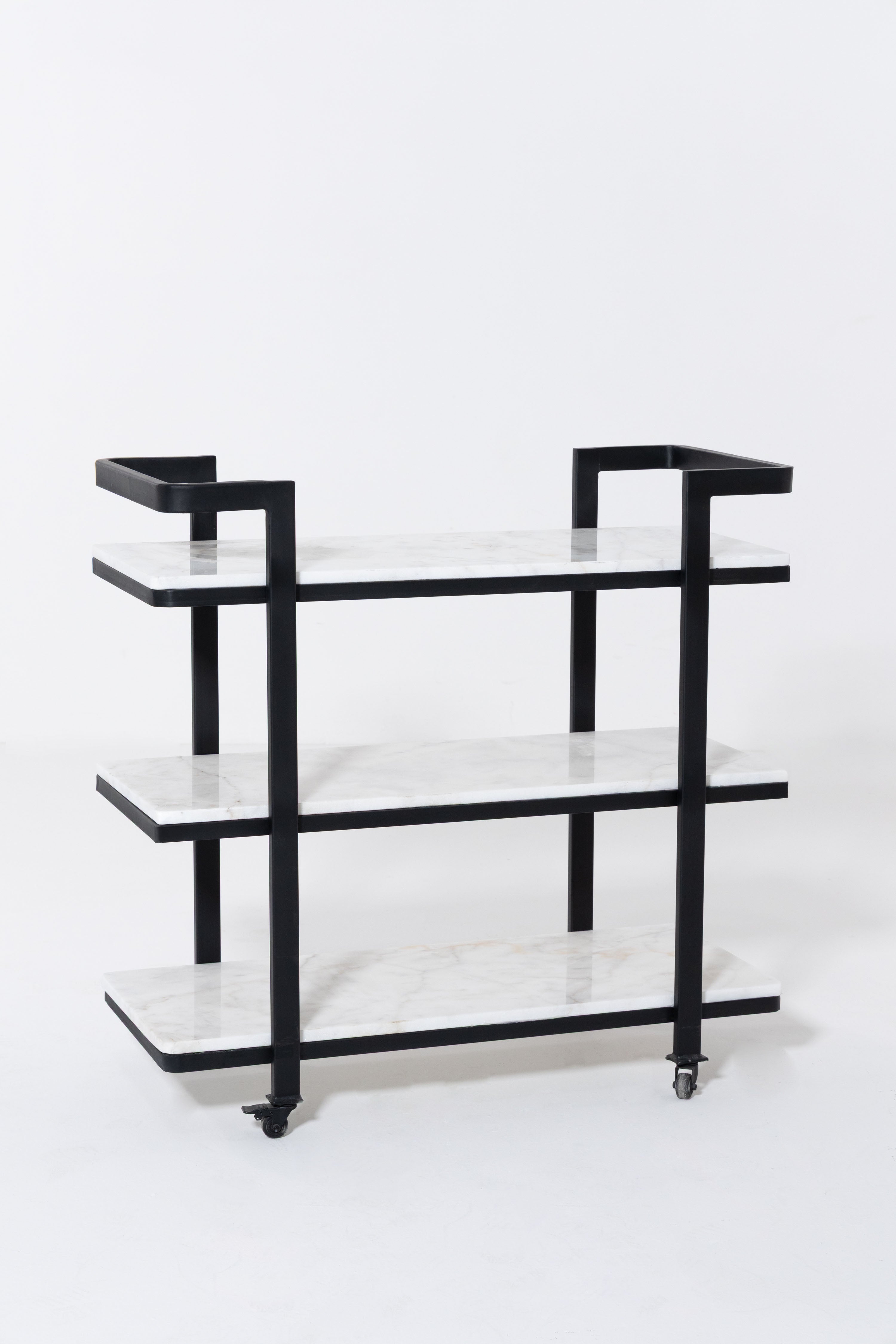 This three-tier trolley features Berche Nouvelle marble shelves with natural grey veining framed in a sleek black metal structure. The cool stone surfaces offer both durability and a refined look, while the open design keeps storage light and practical. Fitted with smooth-rolling castors, it moves easily between rooms, serving as a drinks station, display stand, or mobile shelving. Strong lines, marble detailing, and versatile proportions make it a functional accent that elevates daily living.