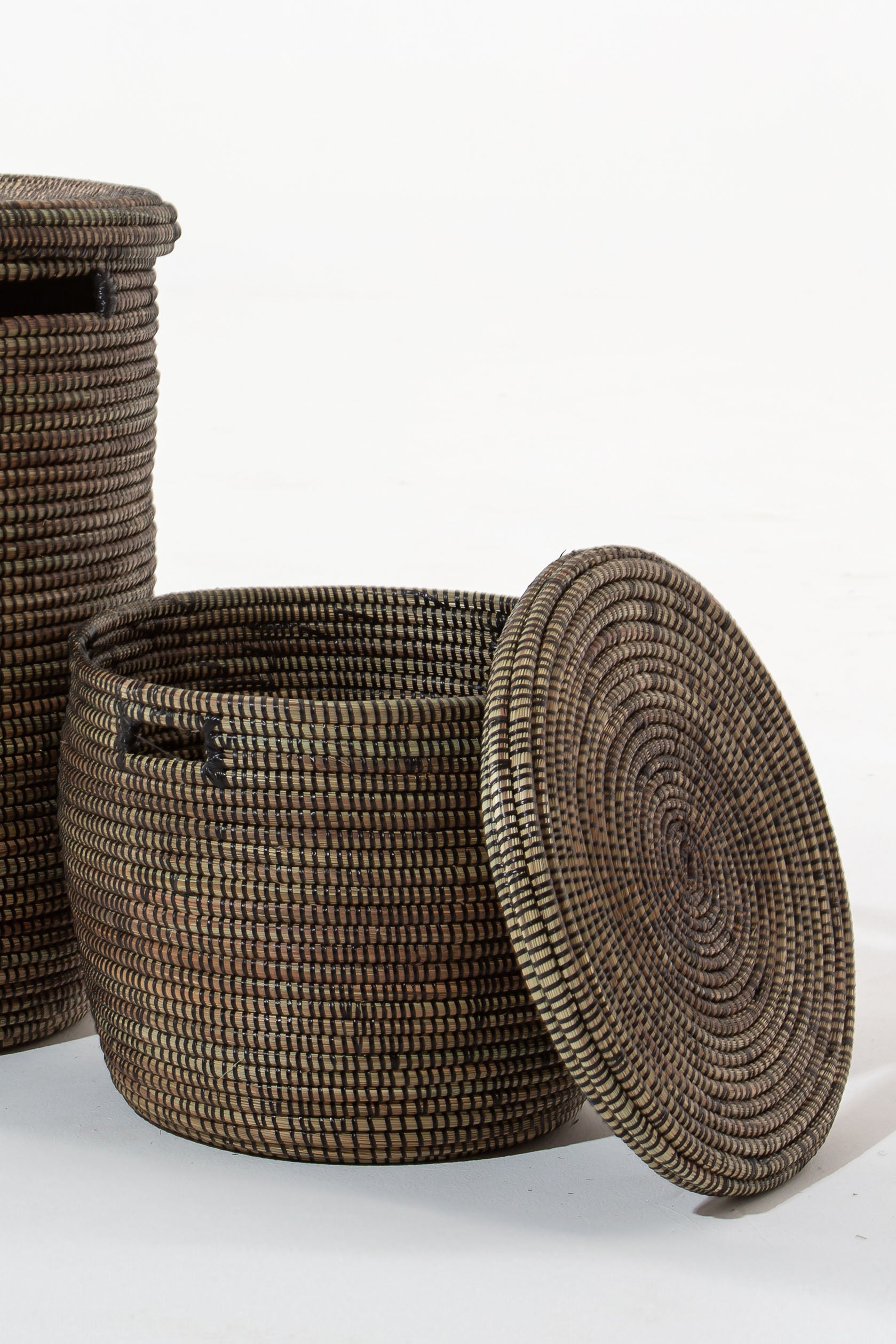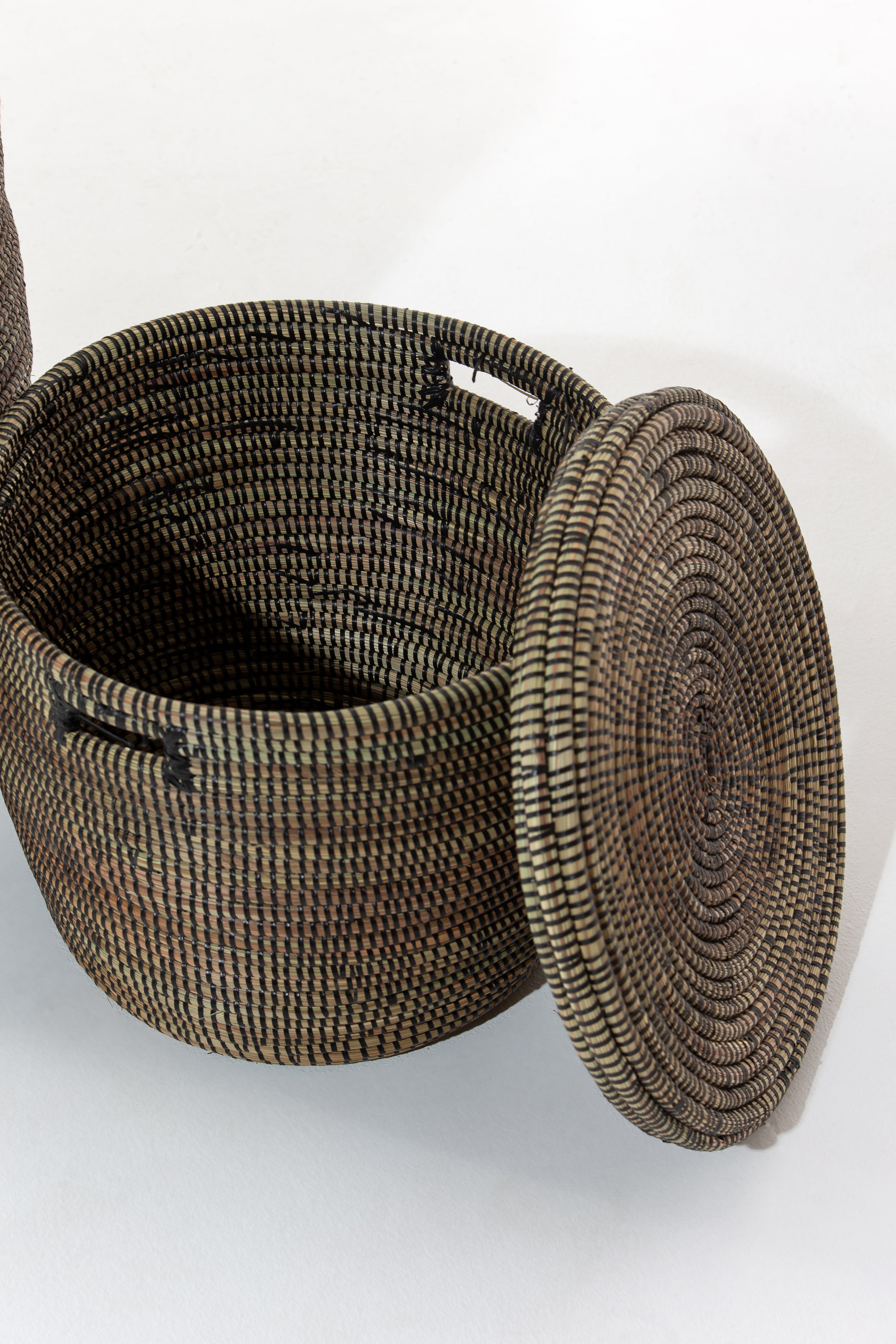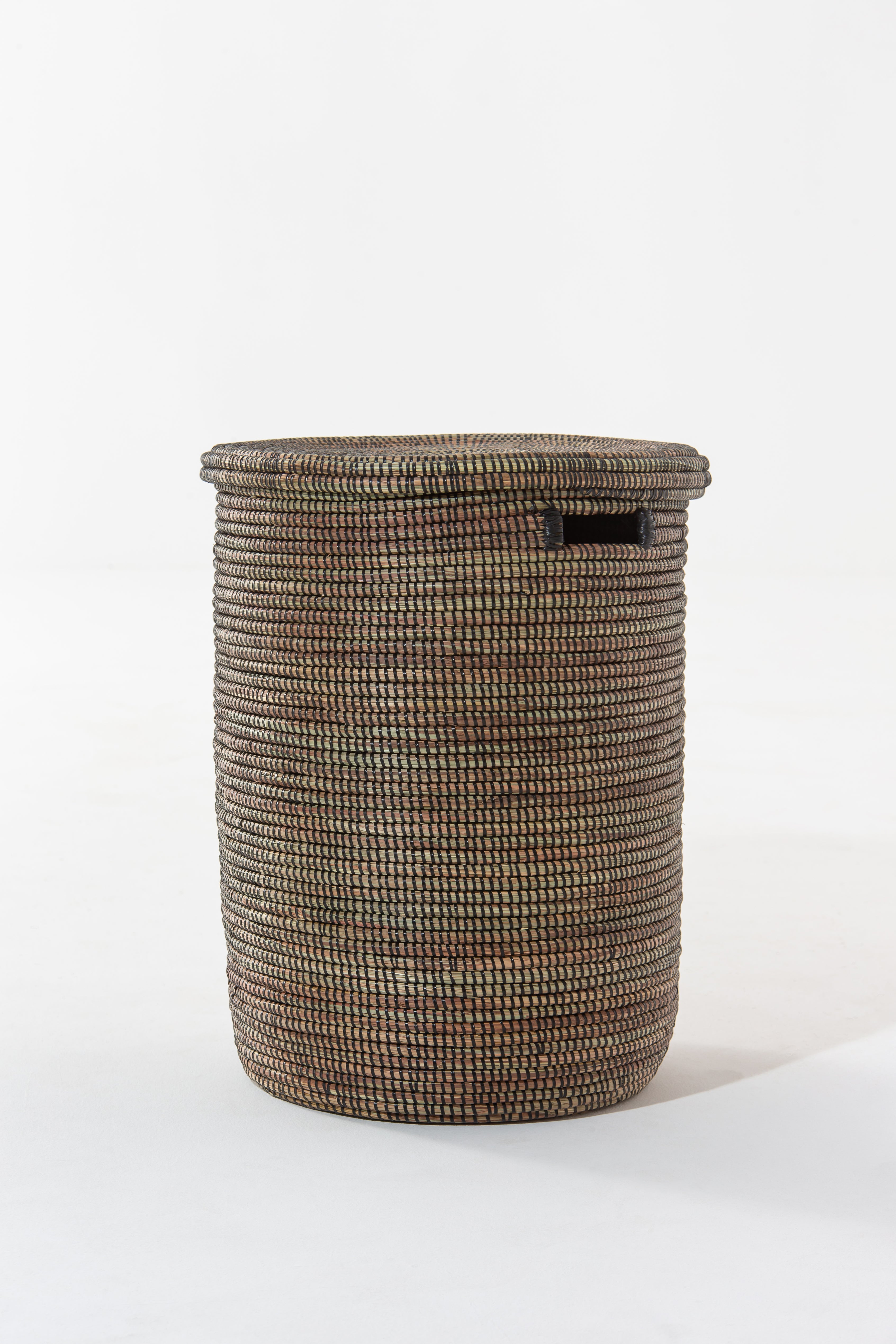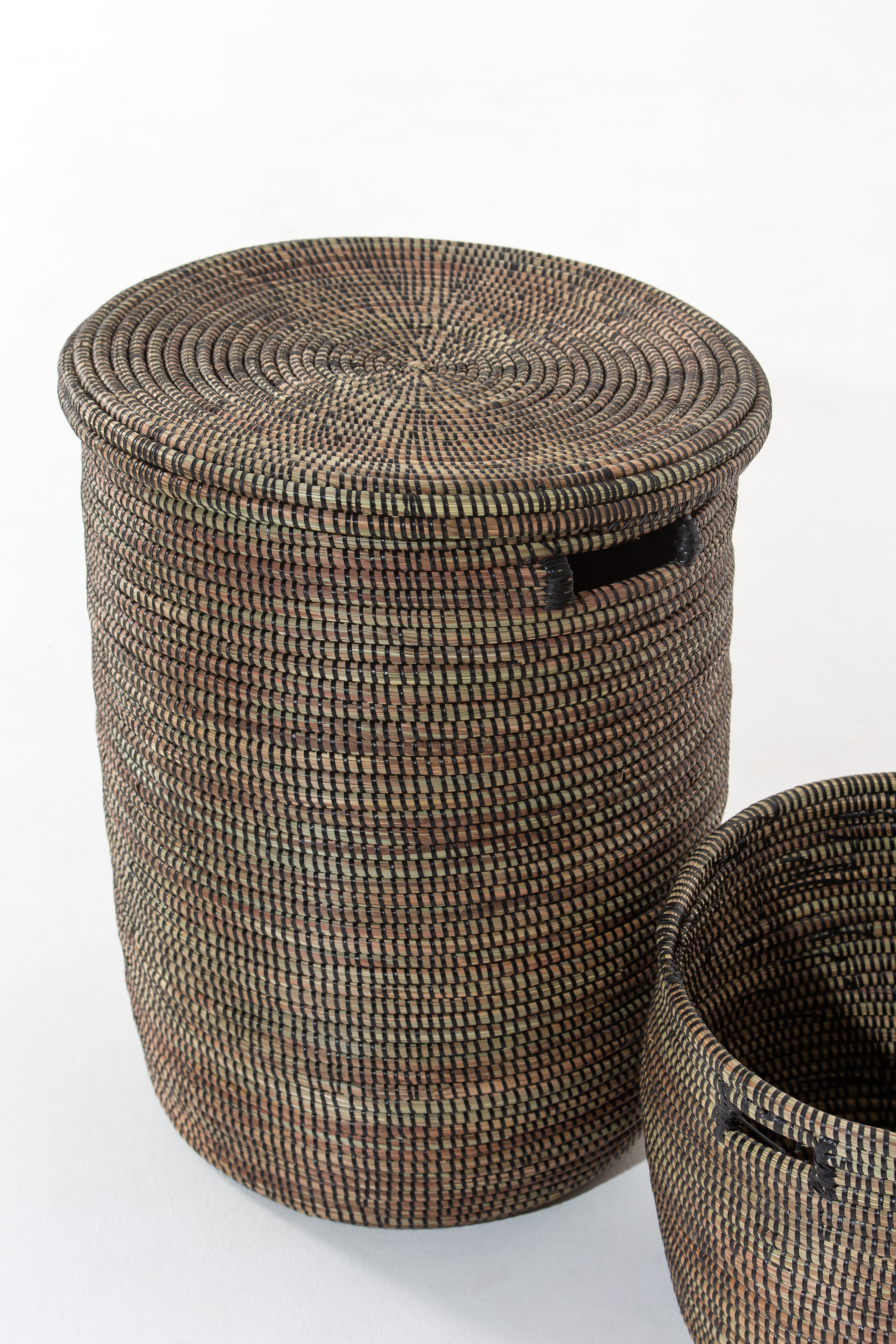 Elevate your space with a handcrafted black basket that blends traditional artistry with modern functionality. Woven from dried local grass and eco-friendly PP plastic, its intricate texture and deep black tones create a sophisticated yet earthy appeal. The cylindrical shape, reinforced with a sturdy base, makes it perfect for organizing laundry, blankets, or everyday essentials. Its removable lid and built-in handles add convenience, making storage seamless and stylish. Whether enhancing a minimalist aesthetic or adding contrast to rustic décor, this basket brings timeless charm and sustainable craftsmanship into your home.