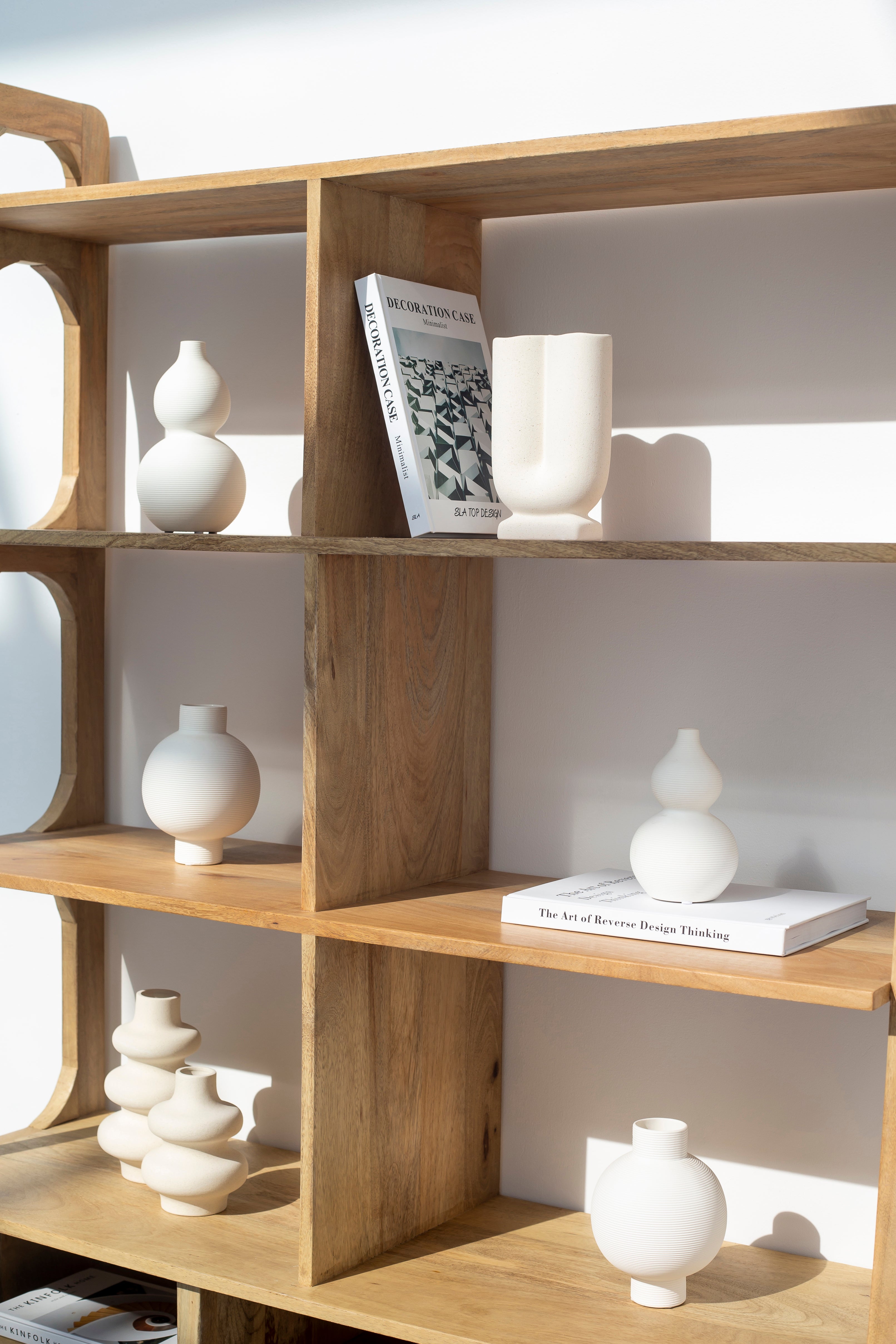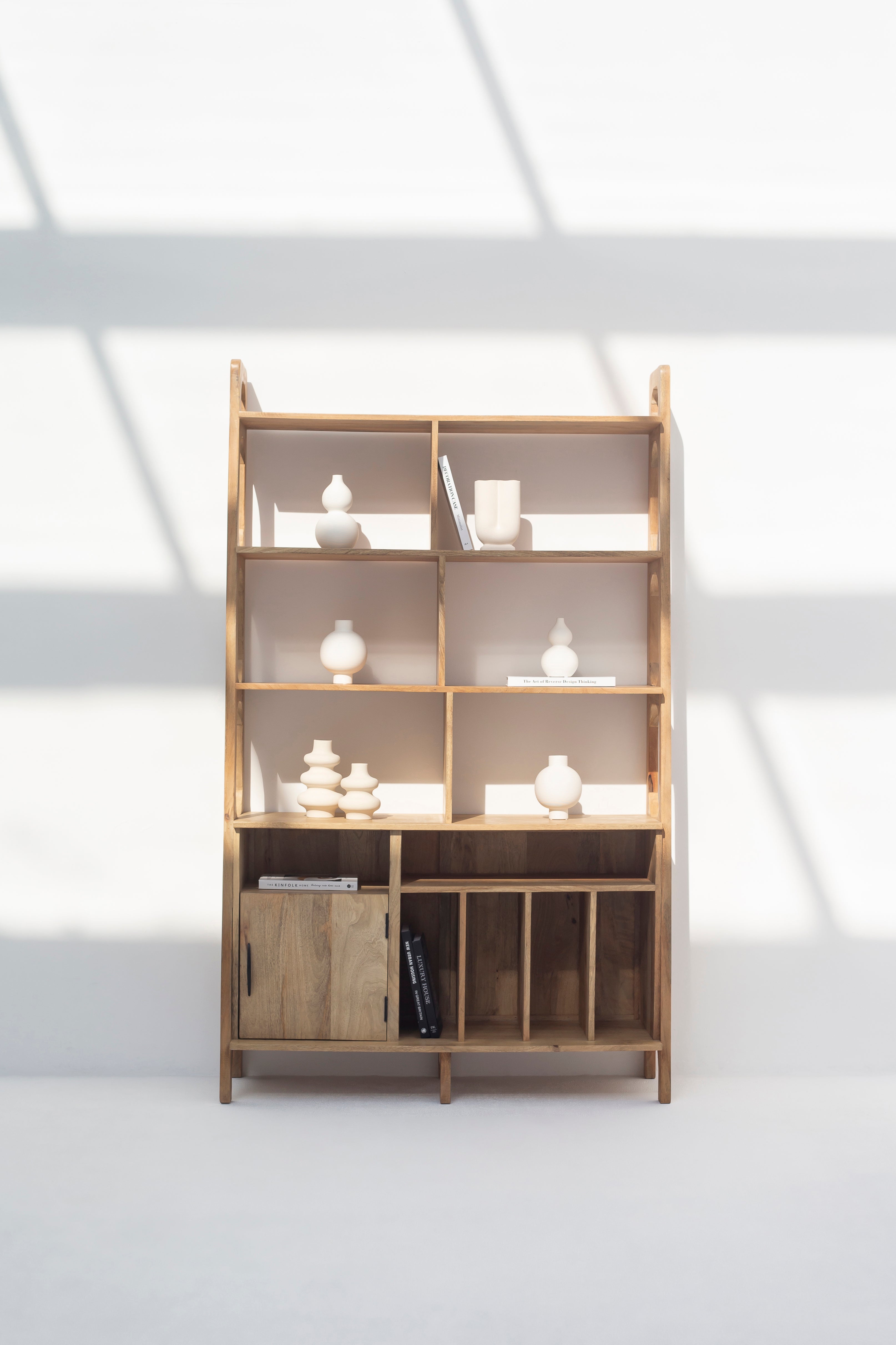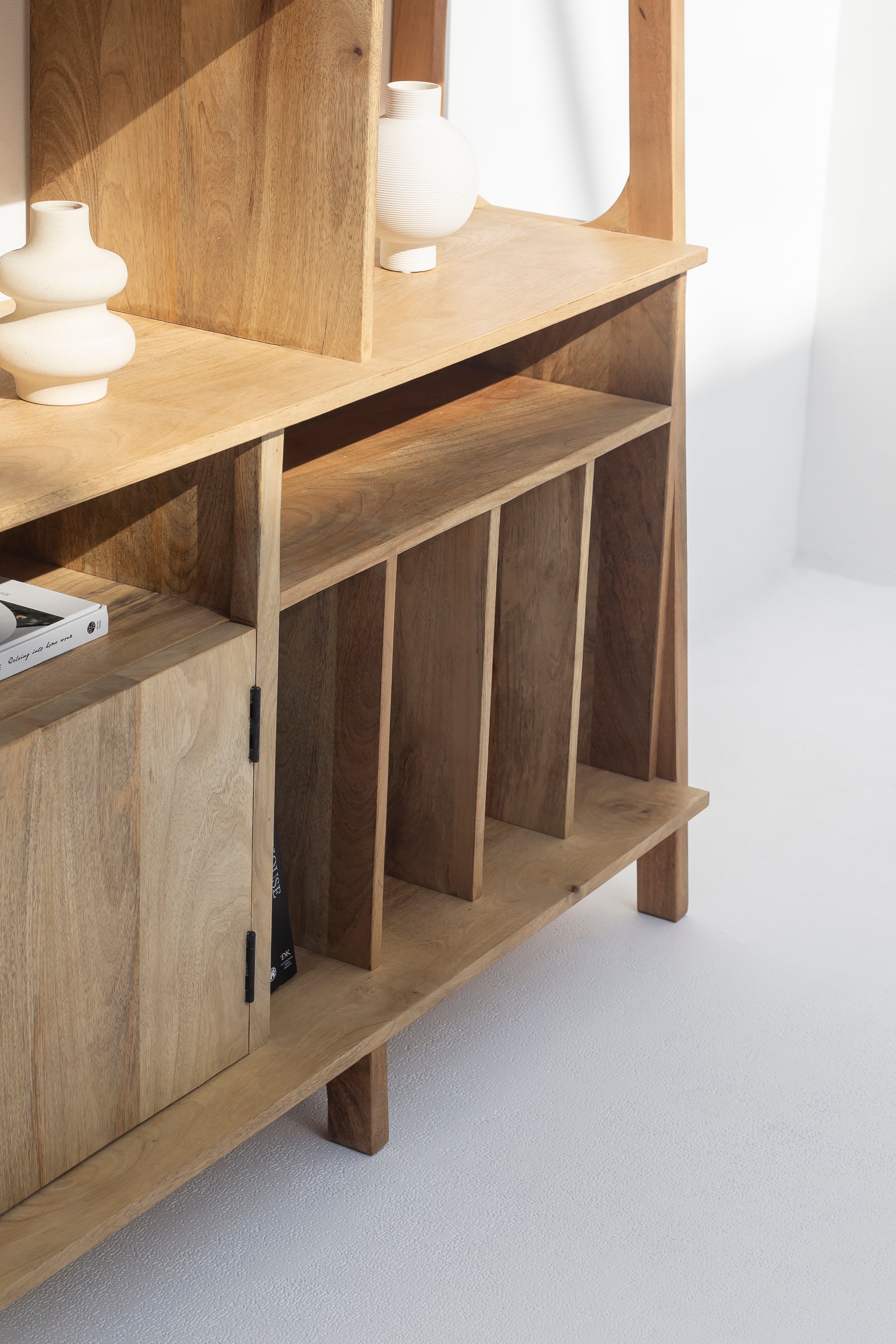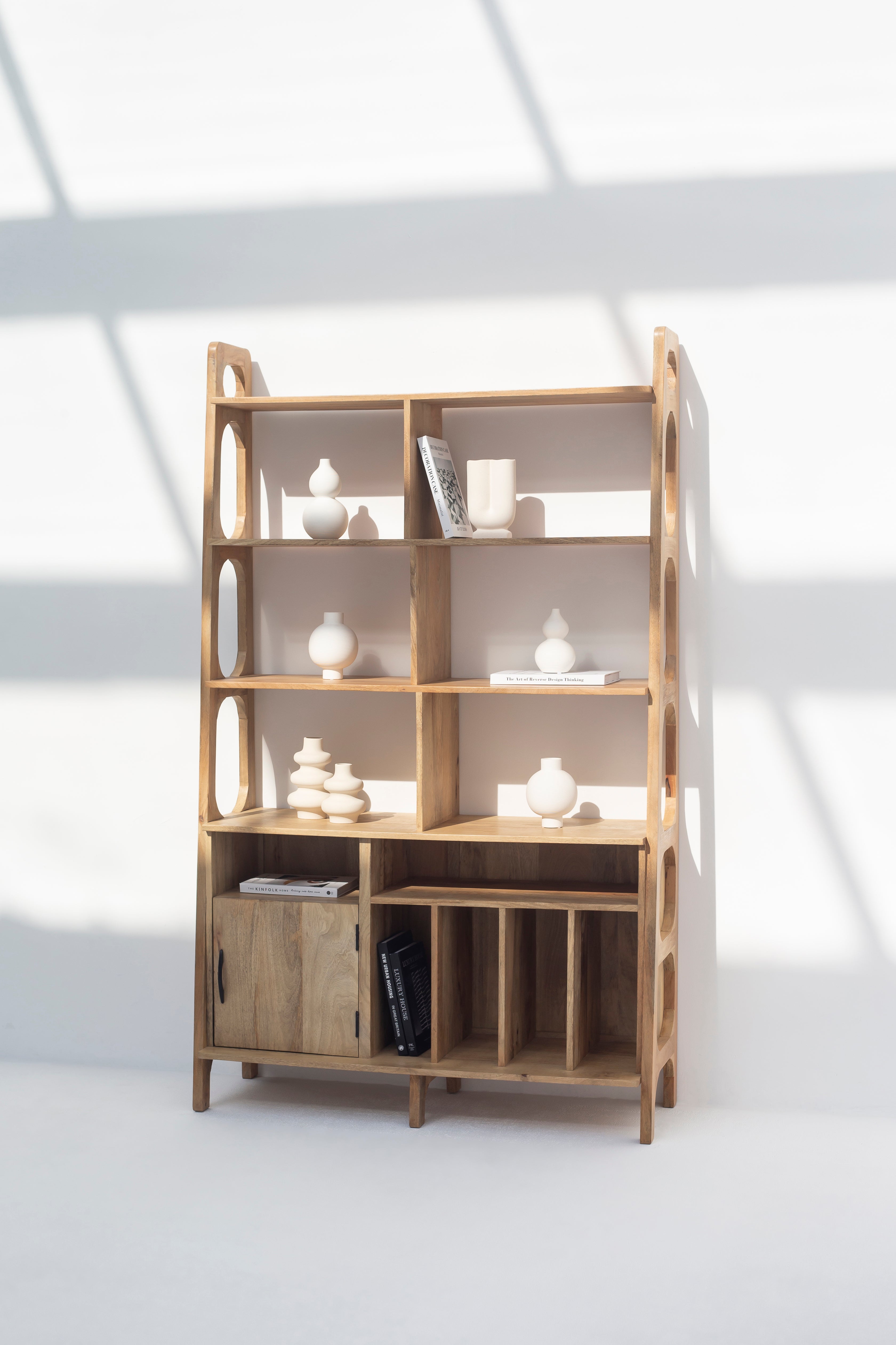 The Christelle Wooden Bookshelves add a perfect blend of style and practicality to any space. Handcrafted from premium mango wood, the design showcases natural grains and a rich, warm finish that enhances its organic appeal. The structure features an airy, open design with curved edges and cut-out accents on the sides, lending it a modern yet artistic look. Its versatile layout includes multiple shelves for displaying books, décor, or collectibles, while a compact lower storage section offers functionality with a minimalist touch. Durable and timeless, this piece seamlessly elevates both living and office spaces.