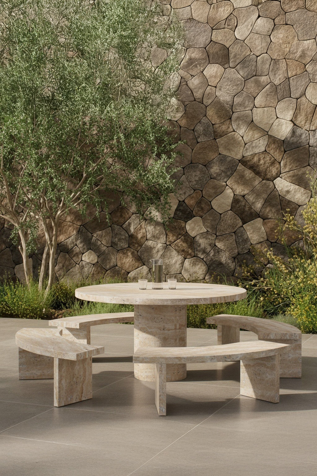 Imagine gathering outdoors around a dining set that feels sculptural and timeless. The round marble table, crafted in warm natural tones, becomes the focal point of your patio or garden, while the matching curved benches echo its form with balance and elegance. The polished stone texture and solid shape create a sense of permanence and sophistication, blending seamlessly with both modern and classic outdoor spaces. Designed to bring people together, it transforms every meal, from casual brunches to evening feasts, into an elegant experience with enduring style.