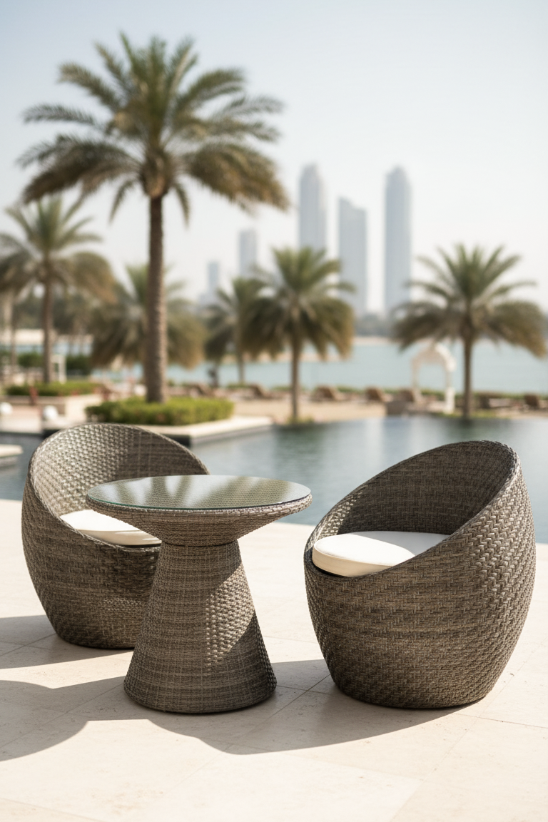 Create a cozy and stylish outdoor corner with this modern lounge set that blends smooth curves with a warm woven texture. The rounded chair design offers an inviting, cocoon-like feel, while the matching table with its glass top brings both function and visual balance to the setup. Ideal for balconies, patios, or garden nooks, this set makes it easy to unwind, enjoy conversations, or relax with a cup of coffee outdoors. With its compact shape and relaxed look, it adds a touch of contemporary charm to any outdoor space.