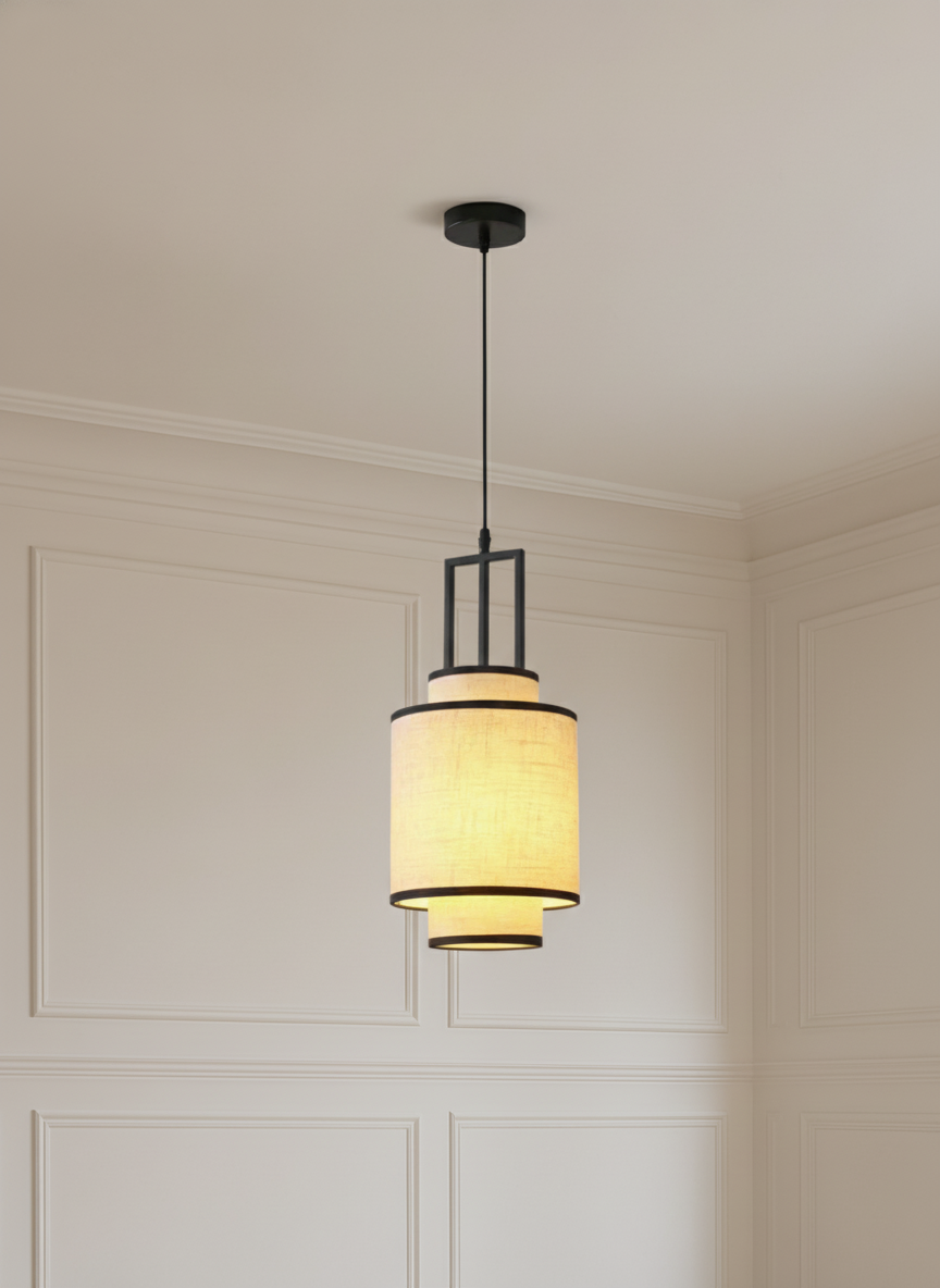 Envision a warm glow filling your room through layered cylindrical fabric shades, each trimmed in bold black edges for striking contrast. The tall, sculptural shape hangs gracefully from a sleek rod, combining soft linen texture with modern geometric design. Whether above a dining table or in a cozy corner, it creates an inviting atmosphere that reflects your unique style.