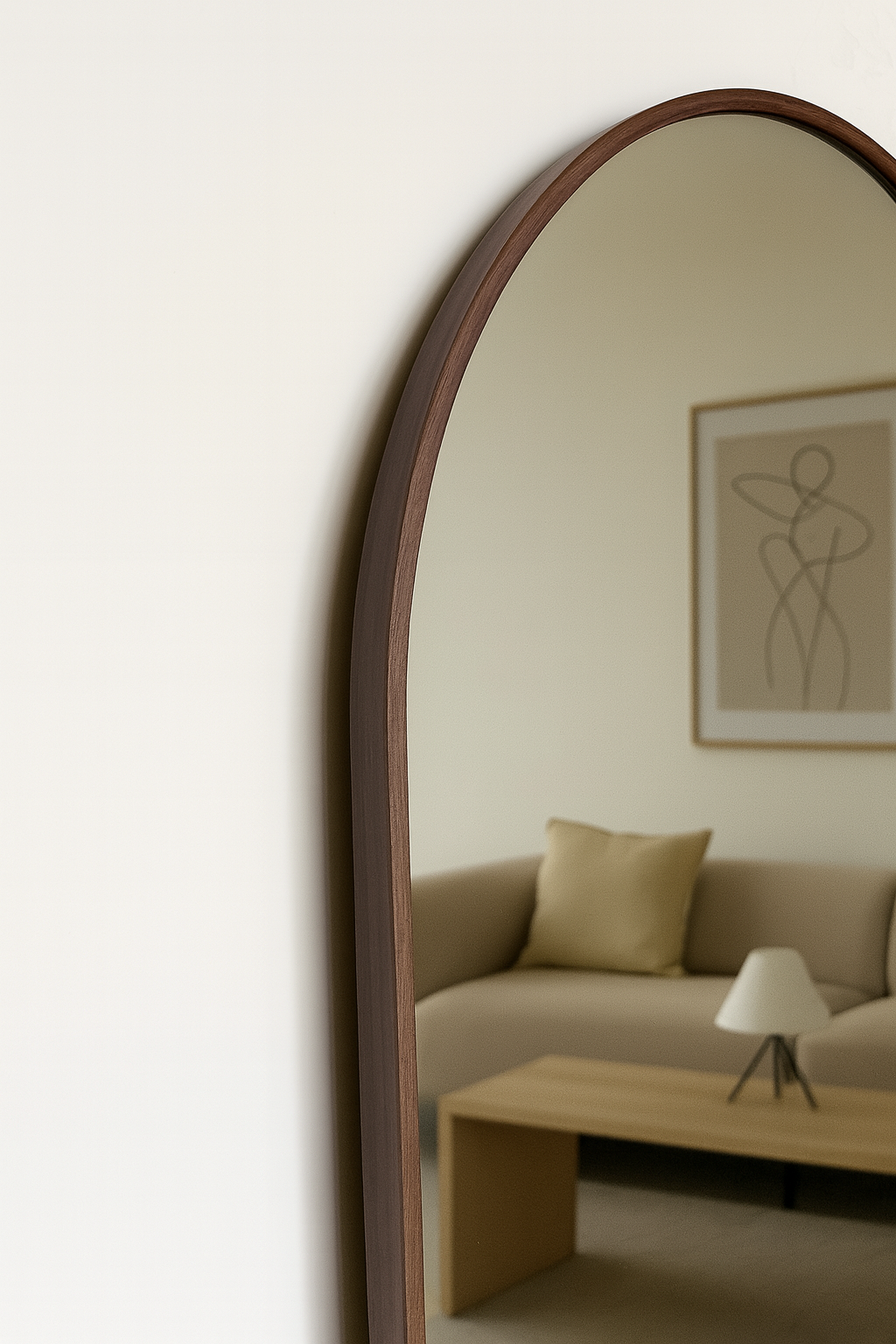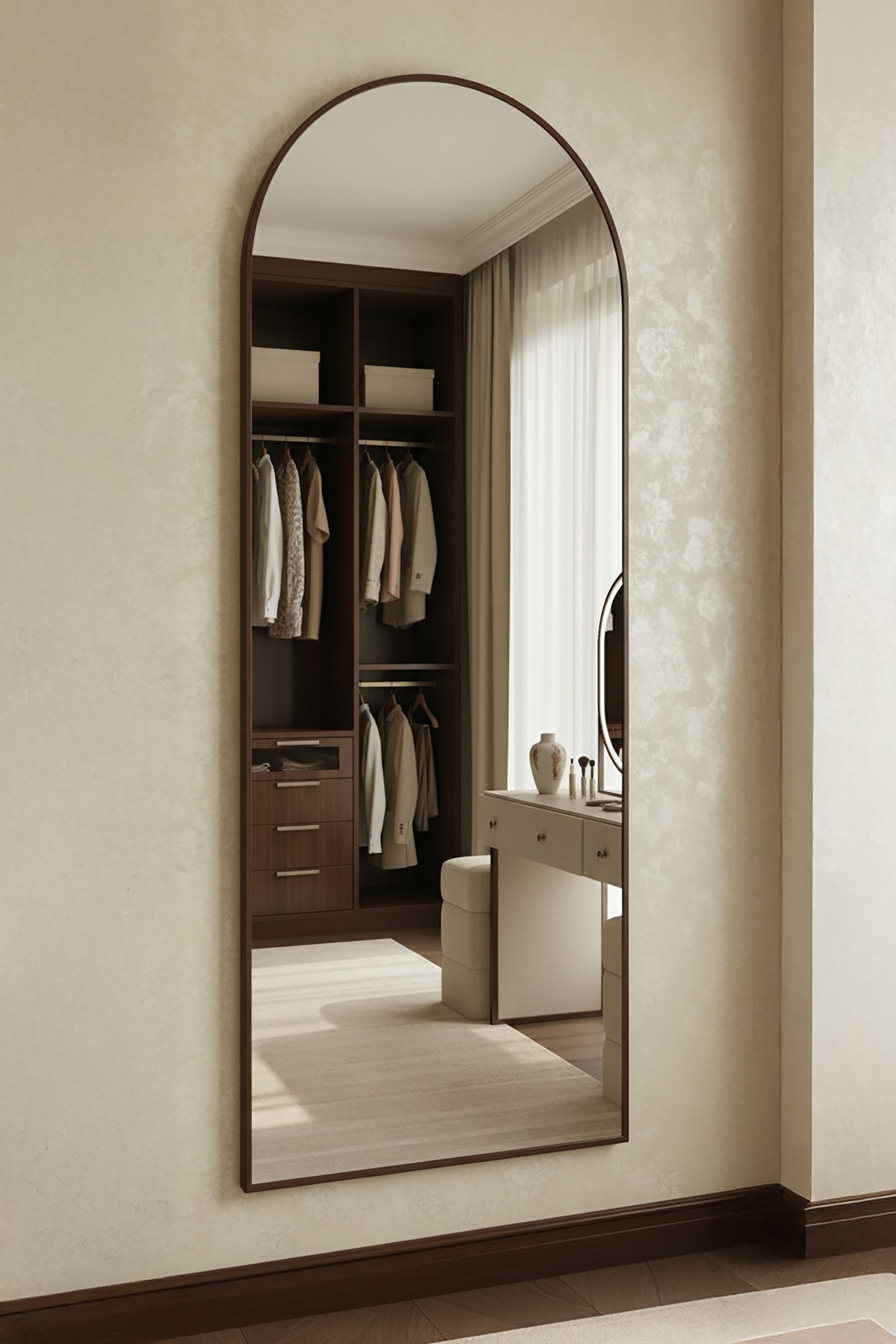 This wall mirror features a graceful arched form bordered by a slim dark brown PVC frame that grounds the reflective surface with subtle depth. Its elongated design amplifies natural light and creates a sense of height, making it well-suited for bedrooms, hallways, or living areas. The warm-toned edging introduces a refined contrast against the glass, offering both utility and visual balance in contemporary and transitional interiors.