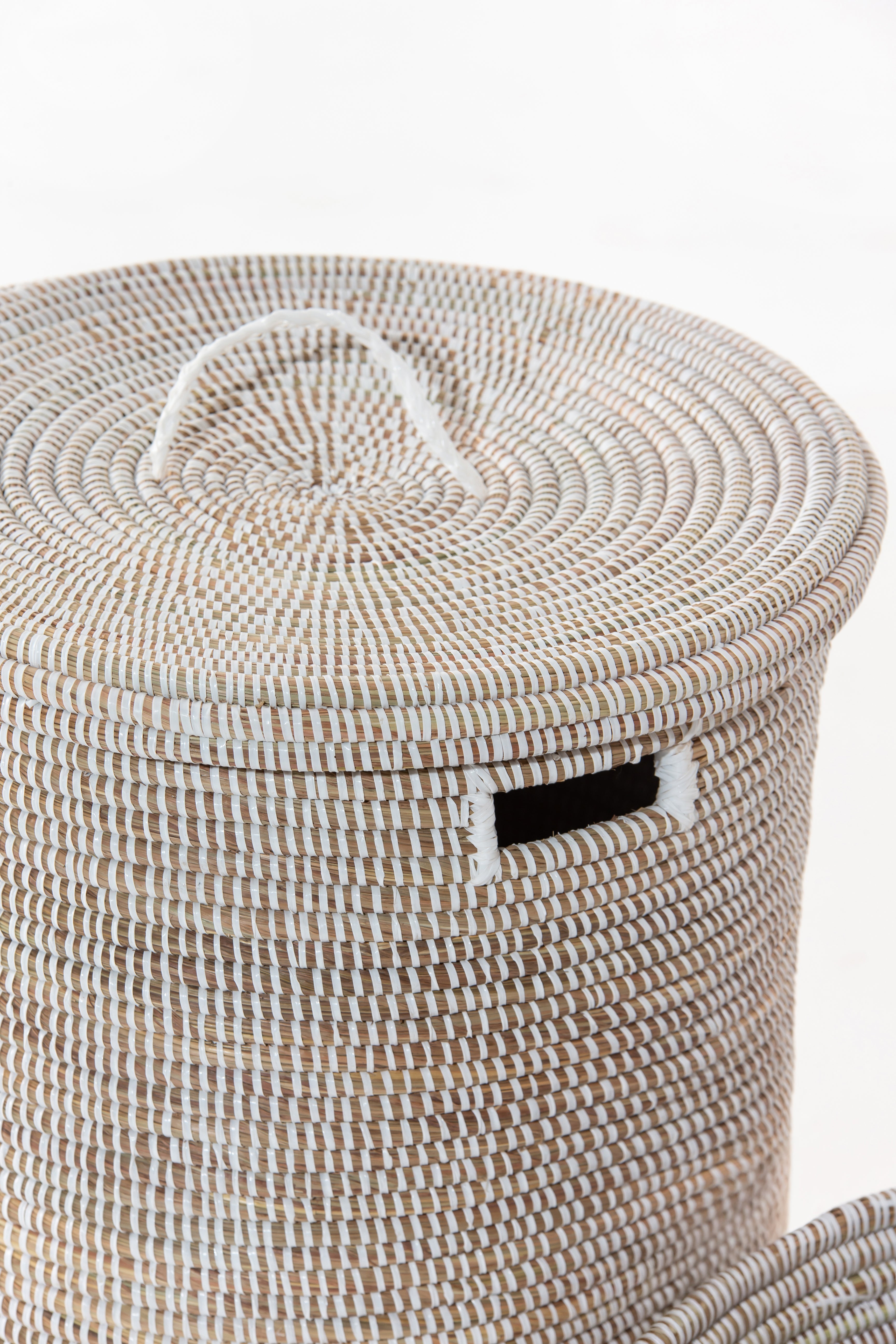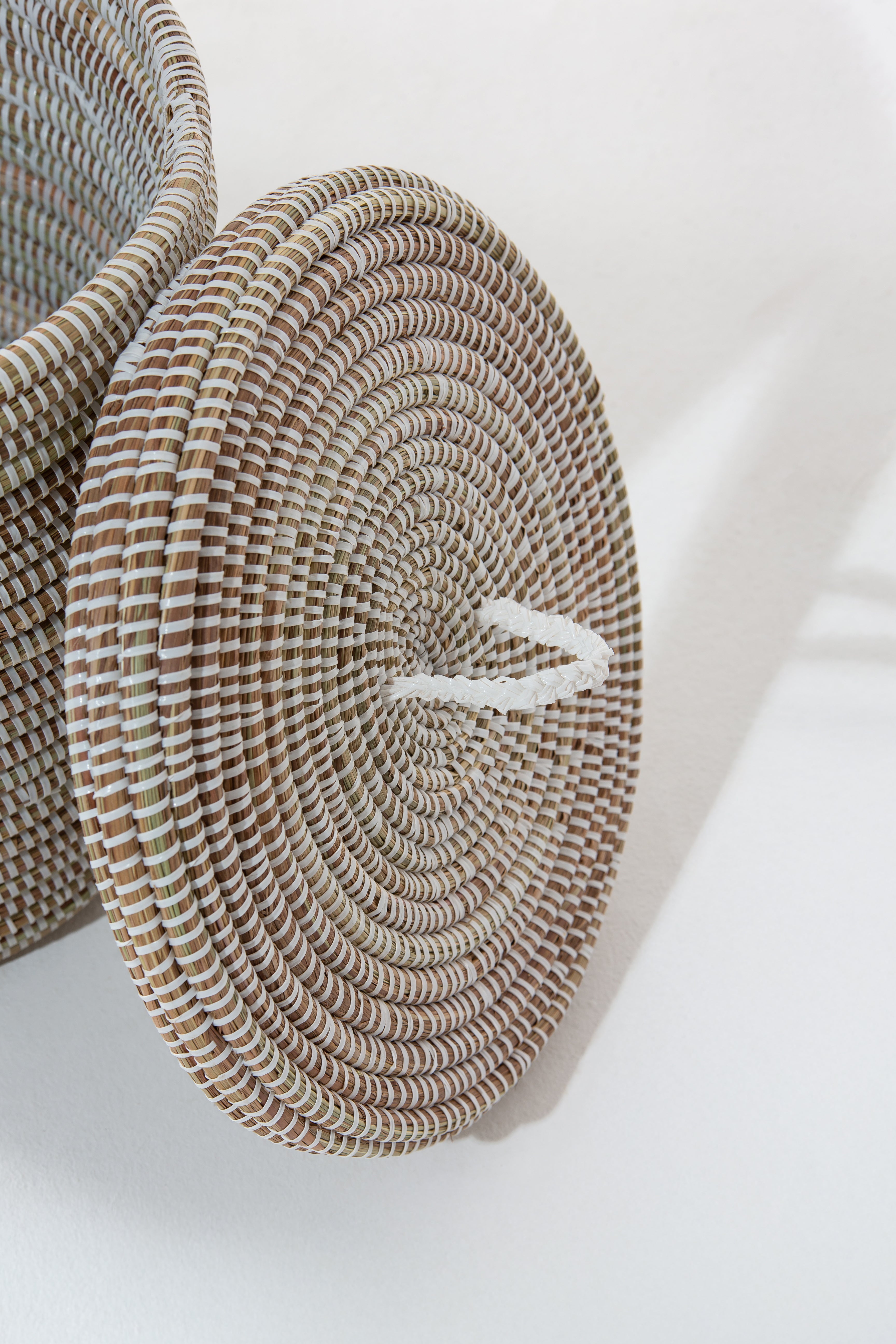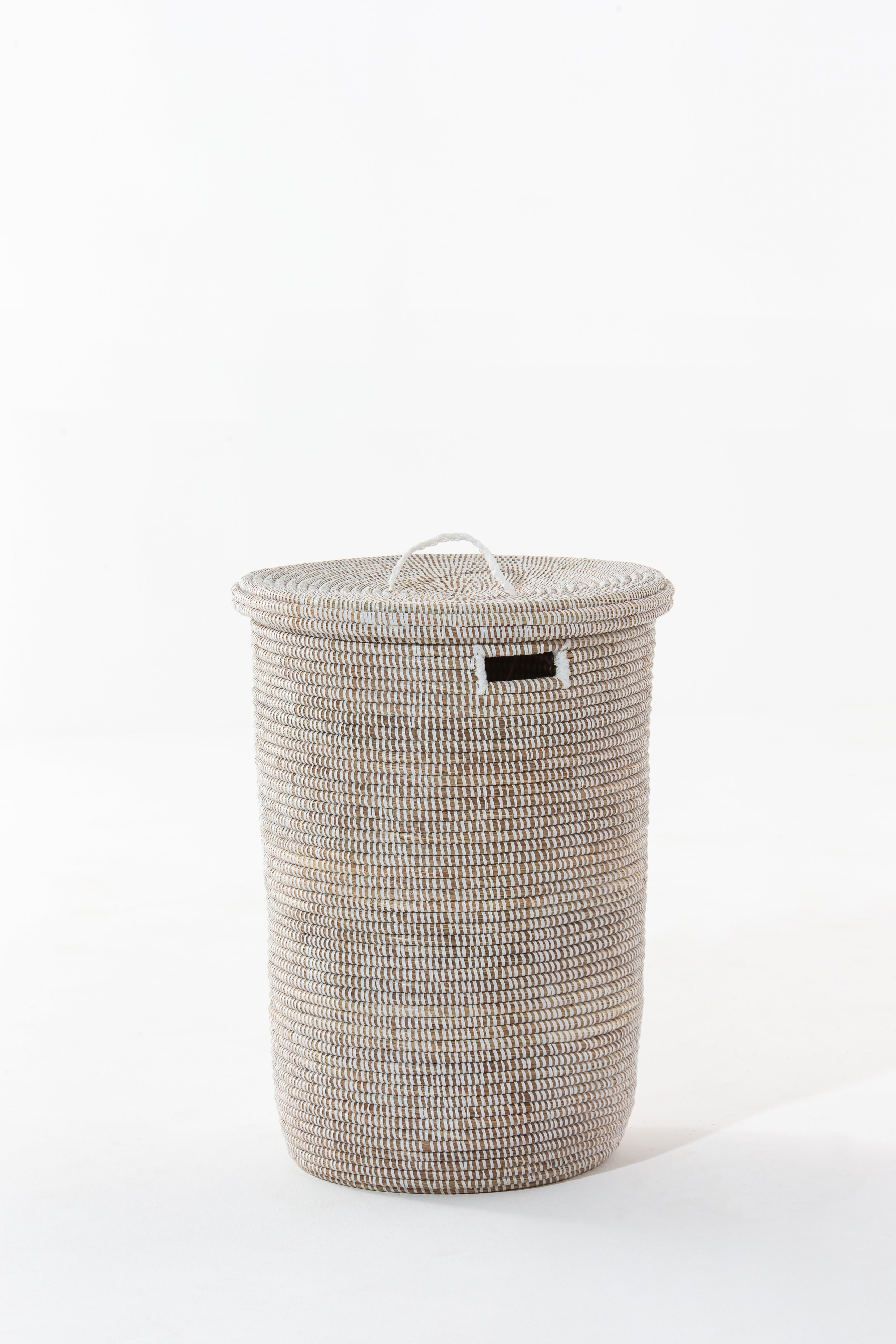 Transform your home with the perfect blend of style and sustainability. This exquisite handmade white basket, crafted from locally sourced dried grass and eco-friendly PP plastic, brings a natural touch to your décor. The intricate weaving creates a visually stunning texture, while the neutral white hue complements any space, from modern to bohemian. Its sturdy, lightweight structure makes it ideal for organizing laundry, blankets, or everyday essentials. The conical lid adds a unique silhouette, ensuring both beauty and functionality. Whether as a decorative accent or practical storage, this artisanal basket enhances your home with charm and eco-conscious elegance.