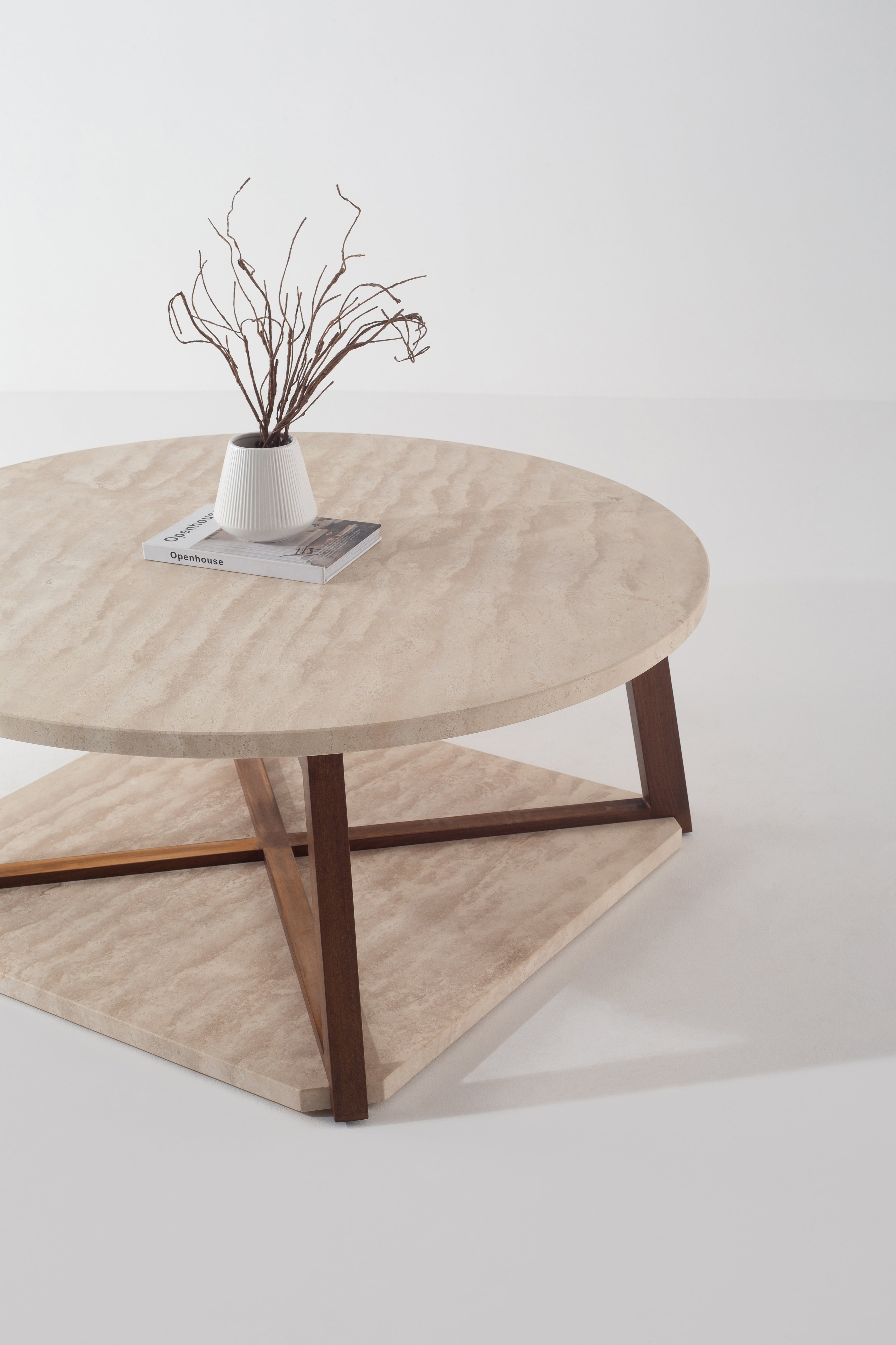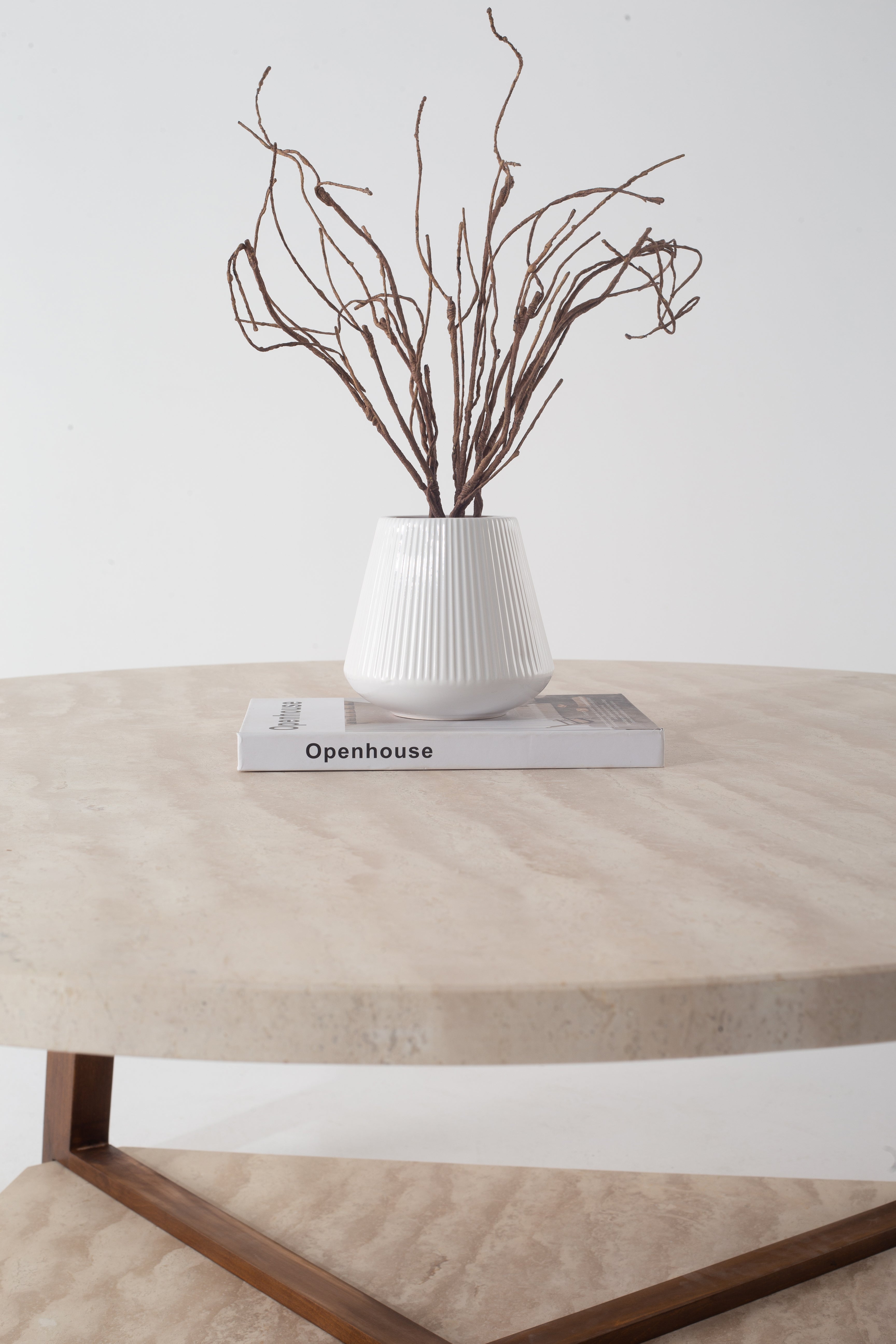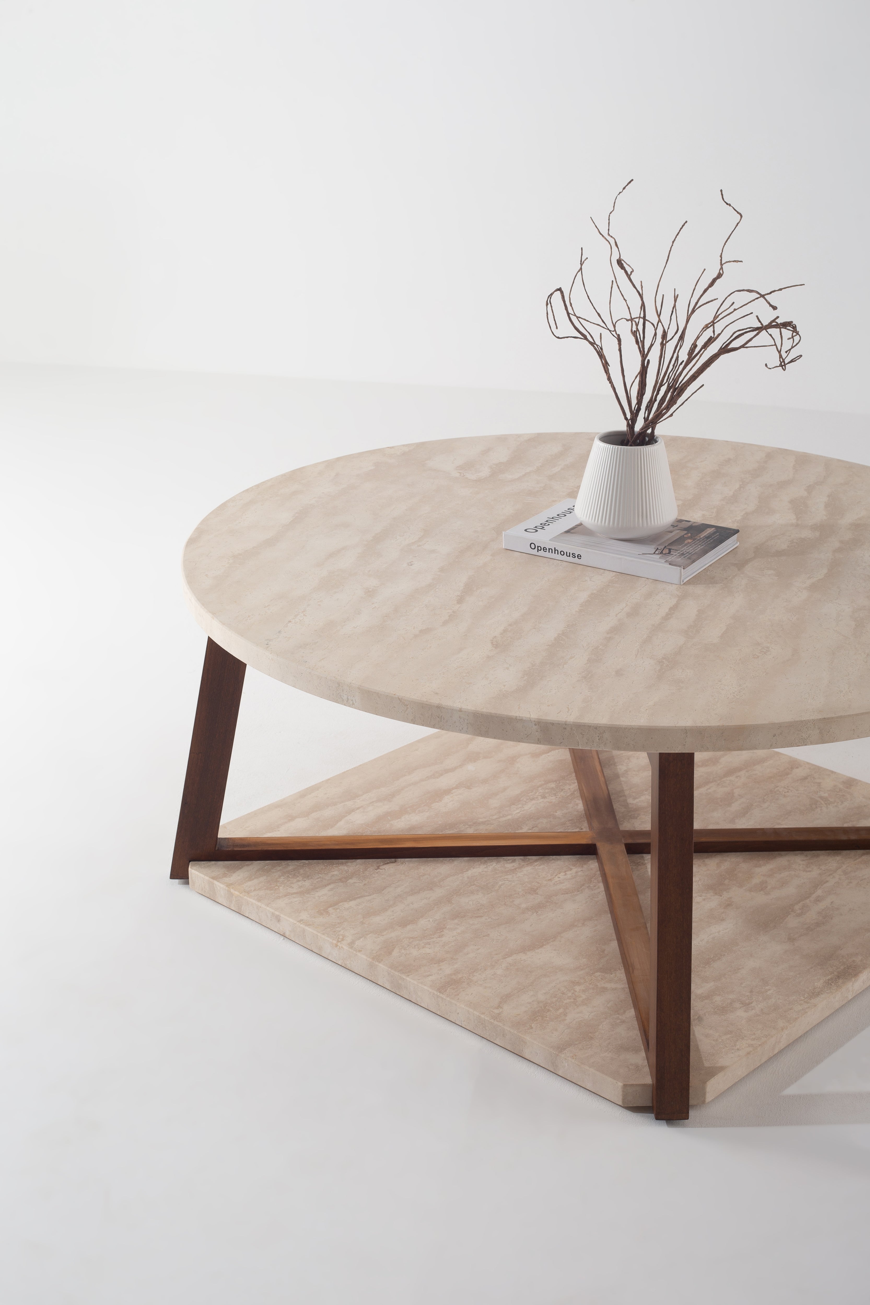 Ground your space with a statement of sculptural beauty and timeless craftsmanship. This round travertine coffee table features a richly textured stone top, exuding natural warmth in soft beige tones. Elevated on a walnut-finished wooden base, its geometric framework creates depth while incorporating a lower travertine shelf for functional elegance. The open, airy design enhances your living space, effortlessly blending modern, organic, and contemporary aesthetics. Whether styled minimally or layered with decor, this luxury coffee table transforms your home with sophisticated charm and practical refinement.