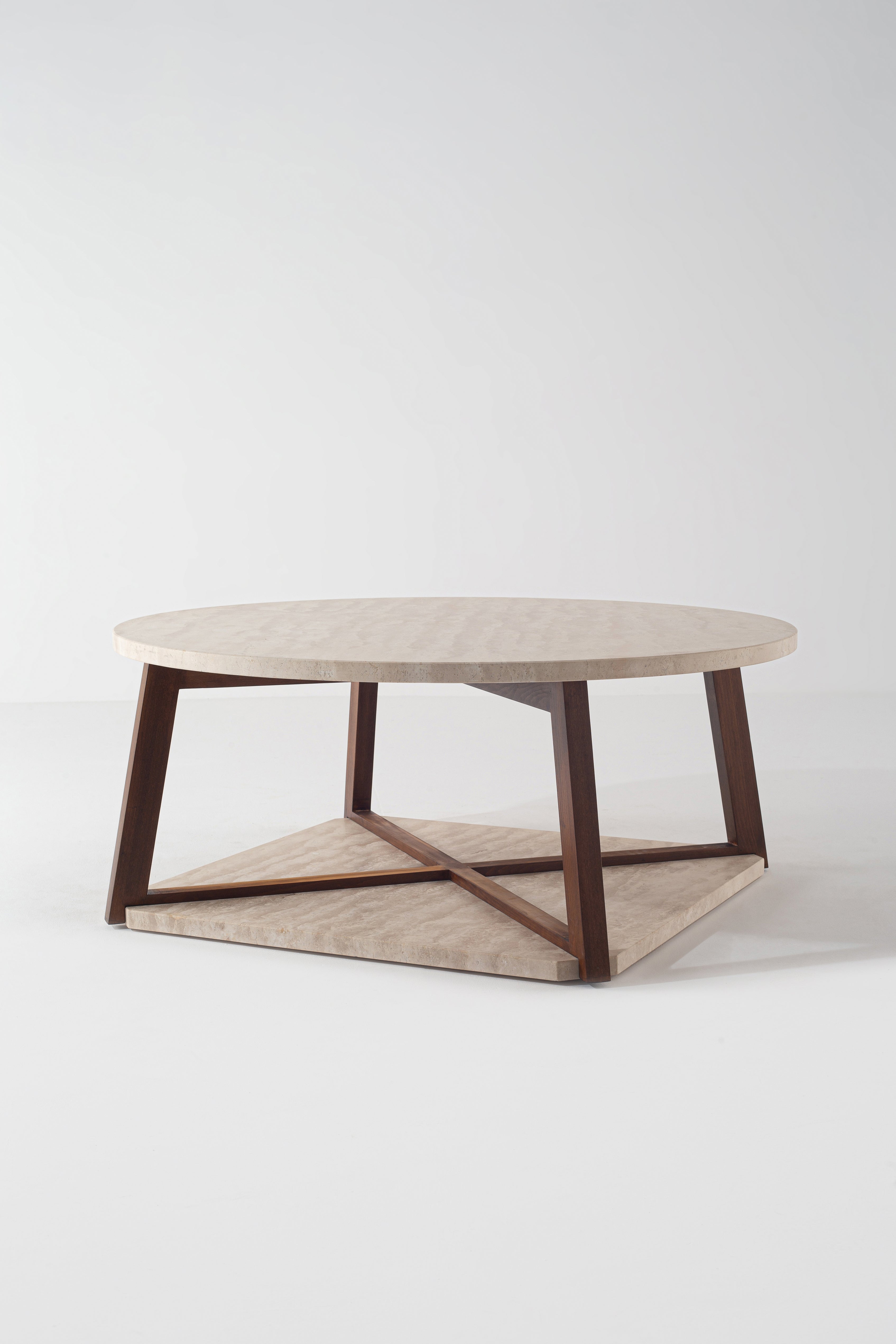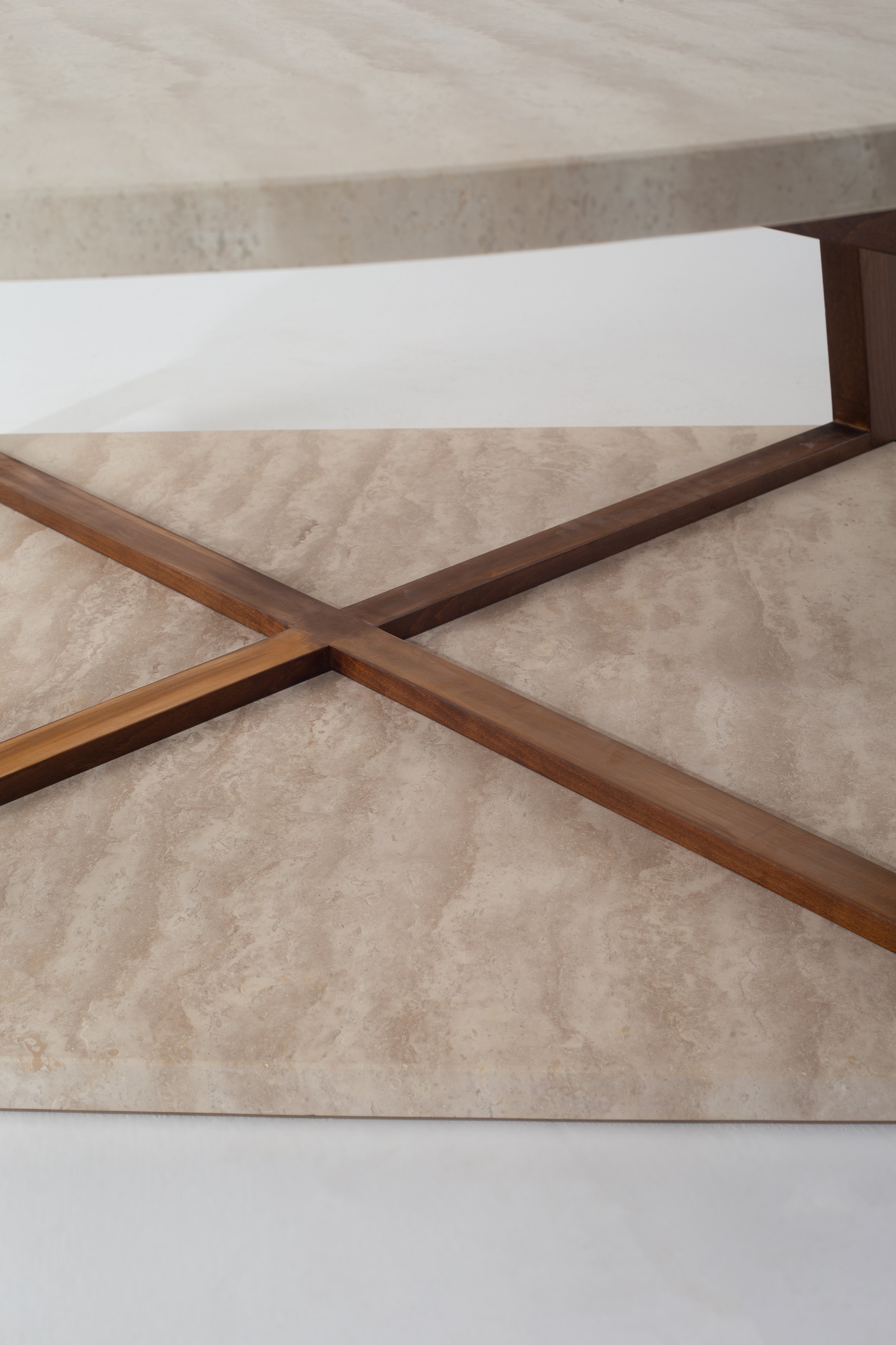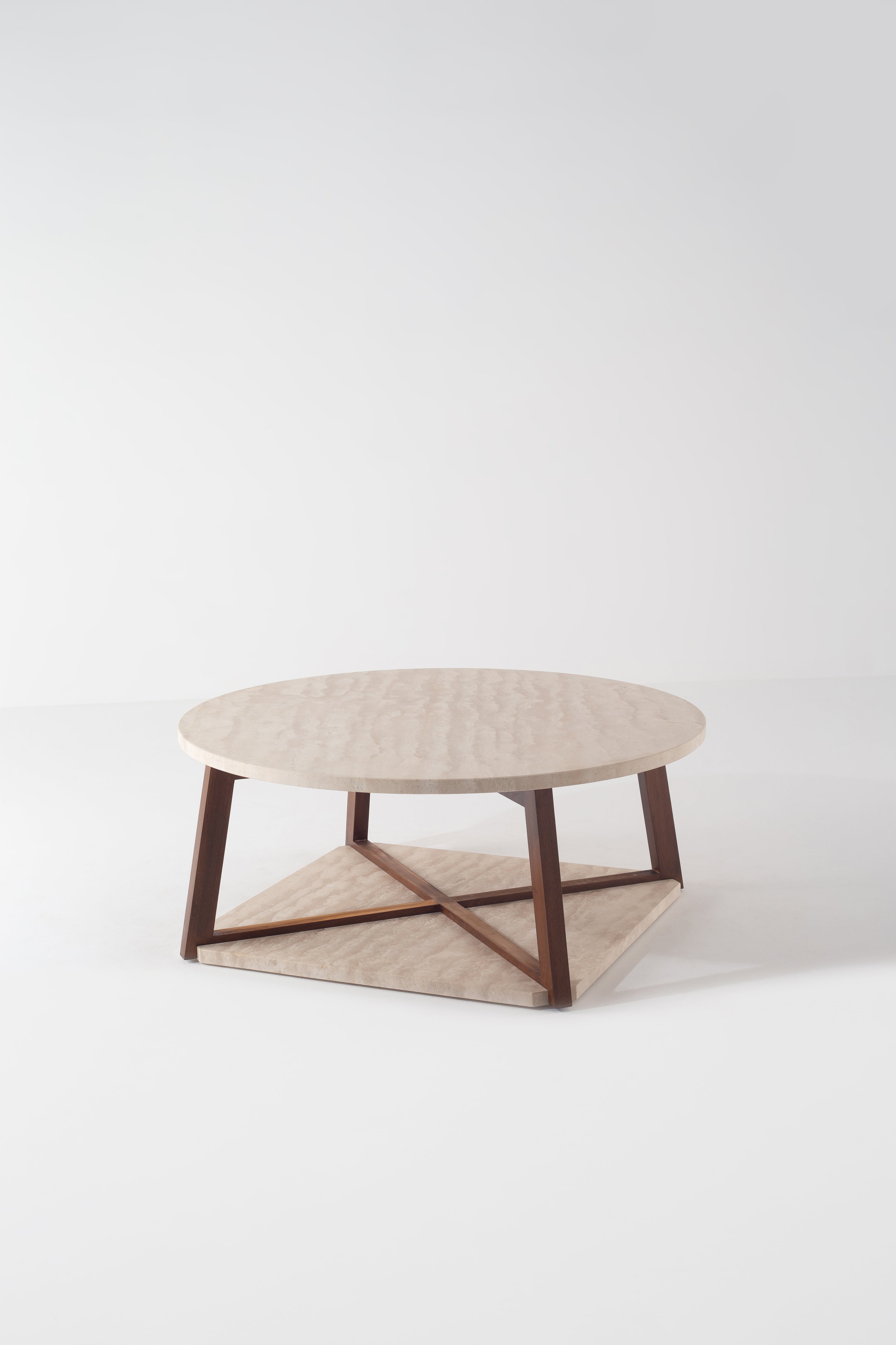Ground your space with a statement of sculptural beauty and timeless craftsmanship. This round travertine coffee table features a richly textured stone top, exuding natural warmth in soft beige tones. Elevated on a walnut-finished wooden base, its geometric framework creates depth while incorporating a lower travertine shelf for functional elegance. The open, airy design enhances your living space, effortlessly blending modern, organic, and contemporary aesthetics. Whether styled minimally or layered with decor, this luxury coffee table transforms your home with sophisticated charm and practical refinement.