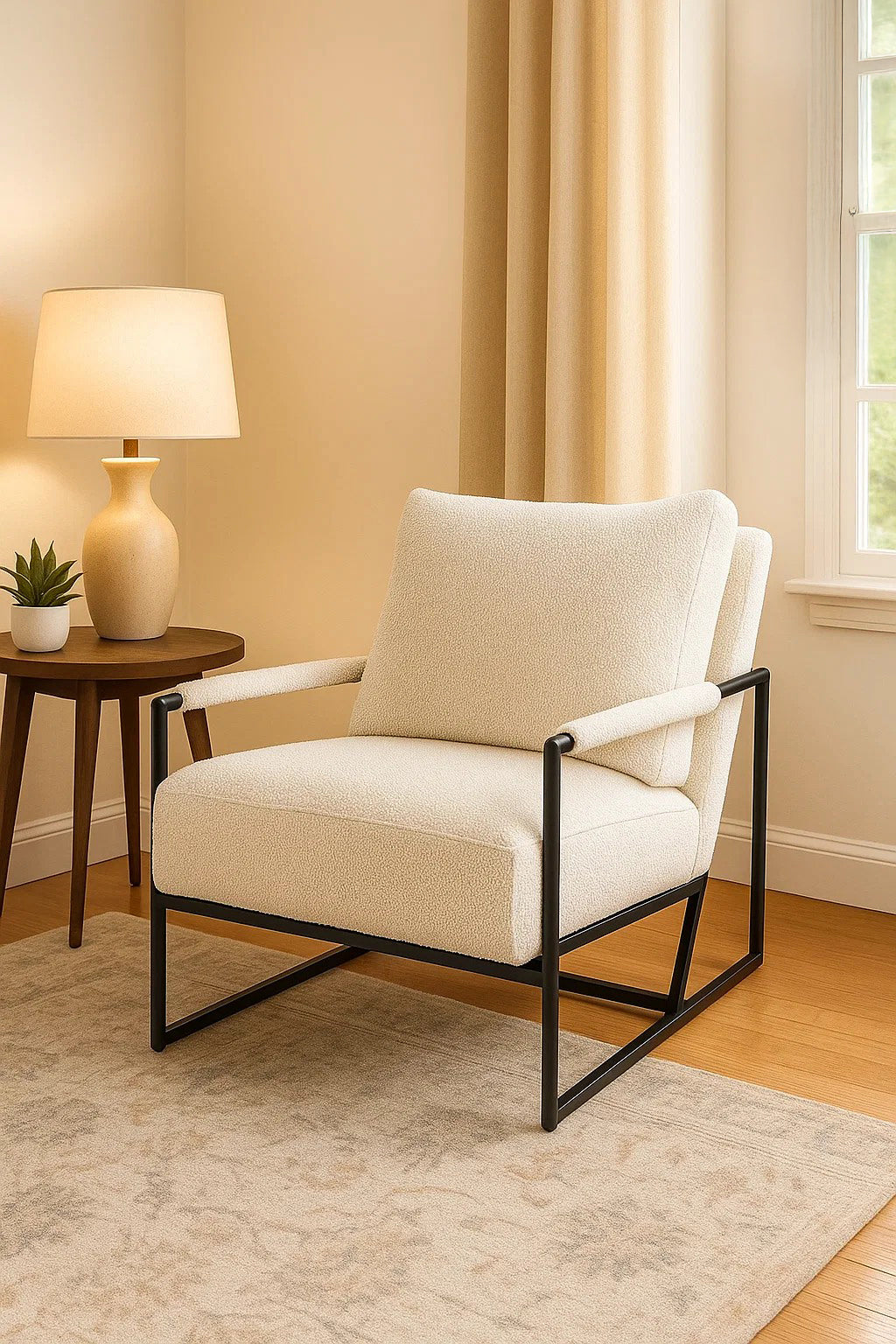 Settle into soft support with this accent chair upholstered in Boucle and set on a slim black painted frame. The wide seat and generous back cushion invite you to lounge while padded arm wraps add a gentle touch. The open base keeps the profile light and modern and the neutral palette layers effortlessly with your decor. This living room chair brings relaxed comfort to reading corners and conversation spaces.
