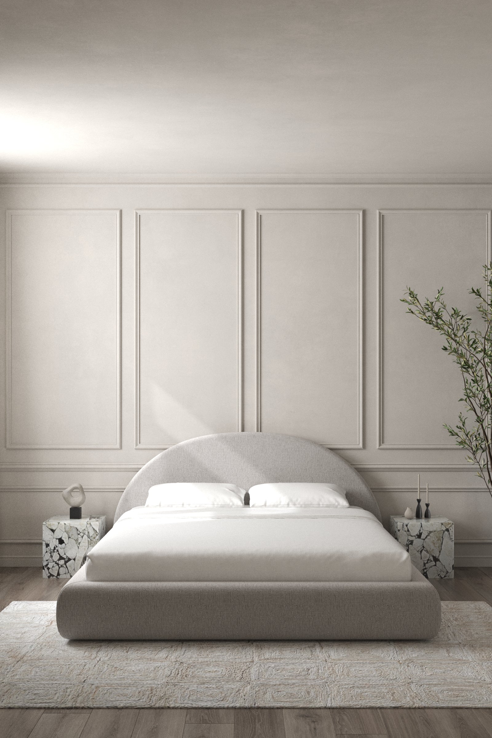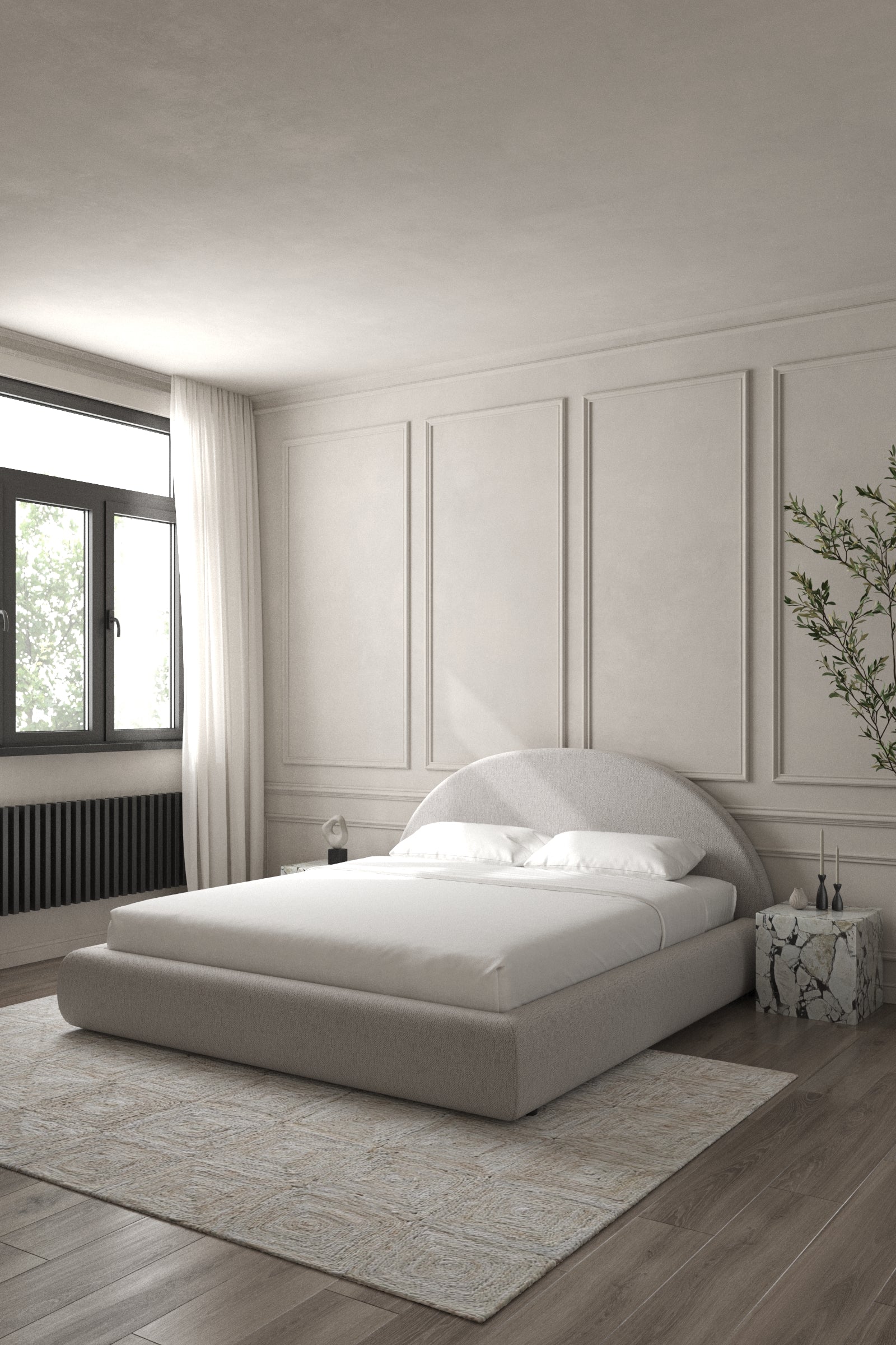 Sink into the soft curves of this elegantly sculpted bed, where minimalism meets modern comfort. The arched headboard offers a seamless, rounded silhouette, complementing the gently curved base for a harmonious and inviting presence in your bedroom. Designed with a low-profile frame, it enhances a spacious, airy feel while maintaining a refined aesthetic. Perfect for contemporary interiors, this bed blends form and function effortlessly, making it a statement piece that transforms your space into a serene retreat.
