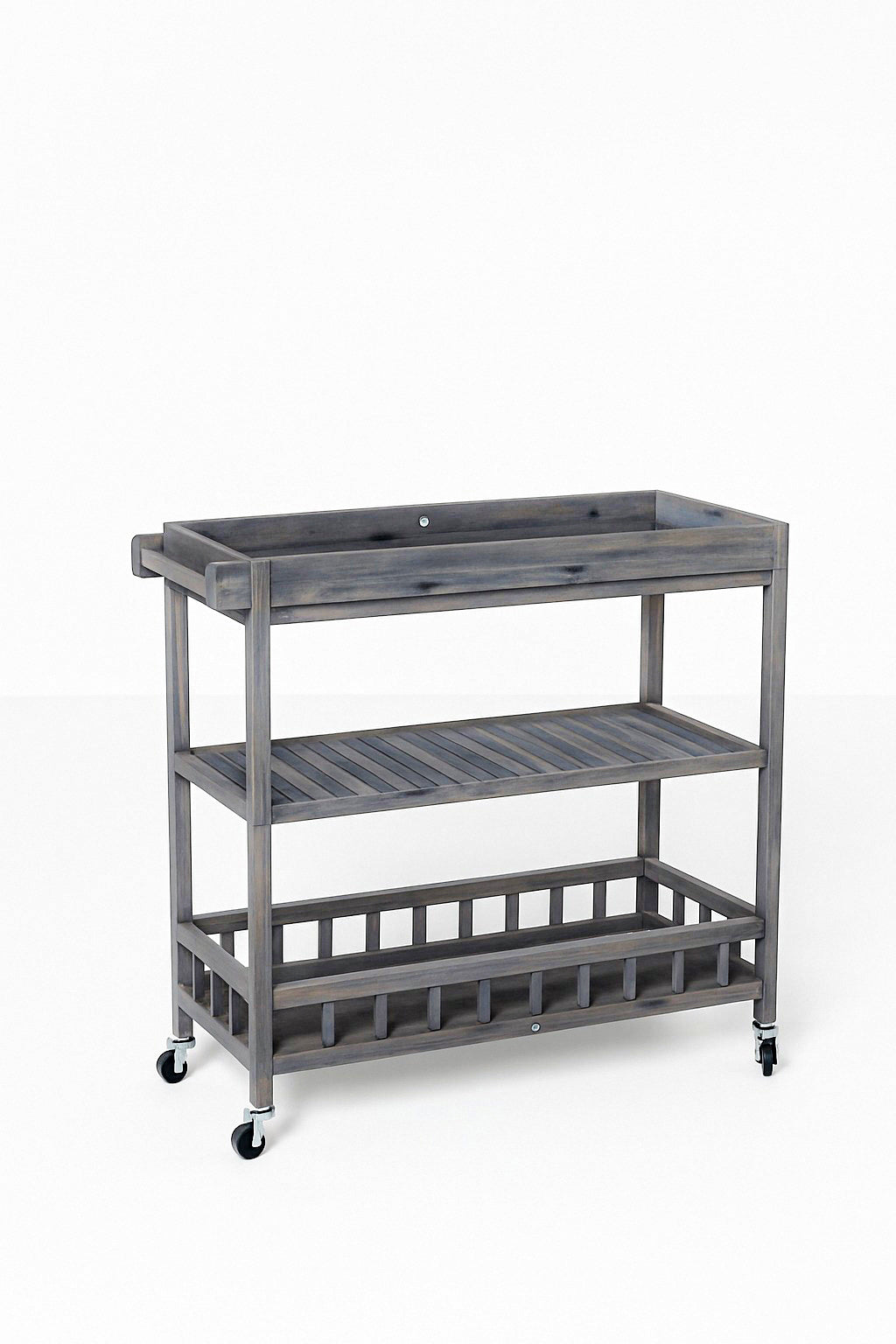 Envision effortlessly hosting gatherings with every drink and appetizer at your fingertips. This wooden trolley is your new, mobile centerpiece, designed to bring both style and convenience to your space. With its three-tier design and dusk grey finish, this trolley combines a rustic wooden aesthetic with modern functionality. The natural wood texture, slatted shelves, and smooth-rolling wheels make it both practical and visually appealing. Perfect for use as a serving trolley, coffee bar, or additional storage, this versatile piece enhances any kitchen, dining room, or living space with timeless European charm and organization.