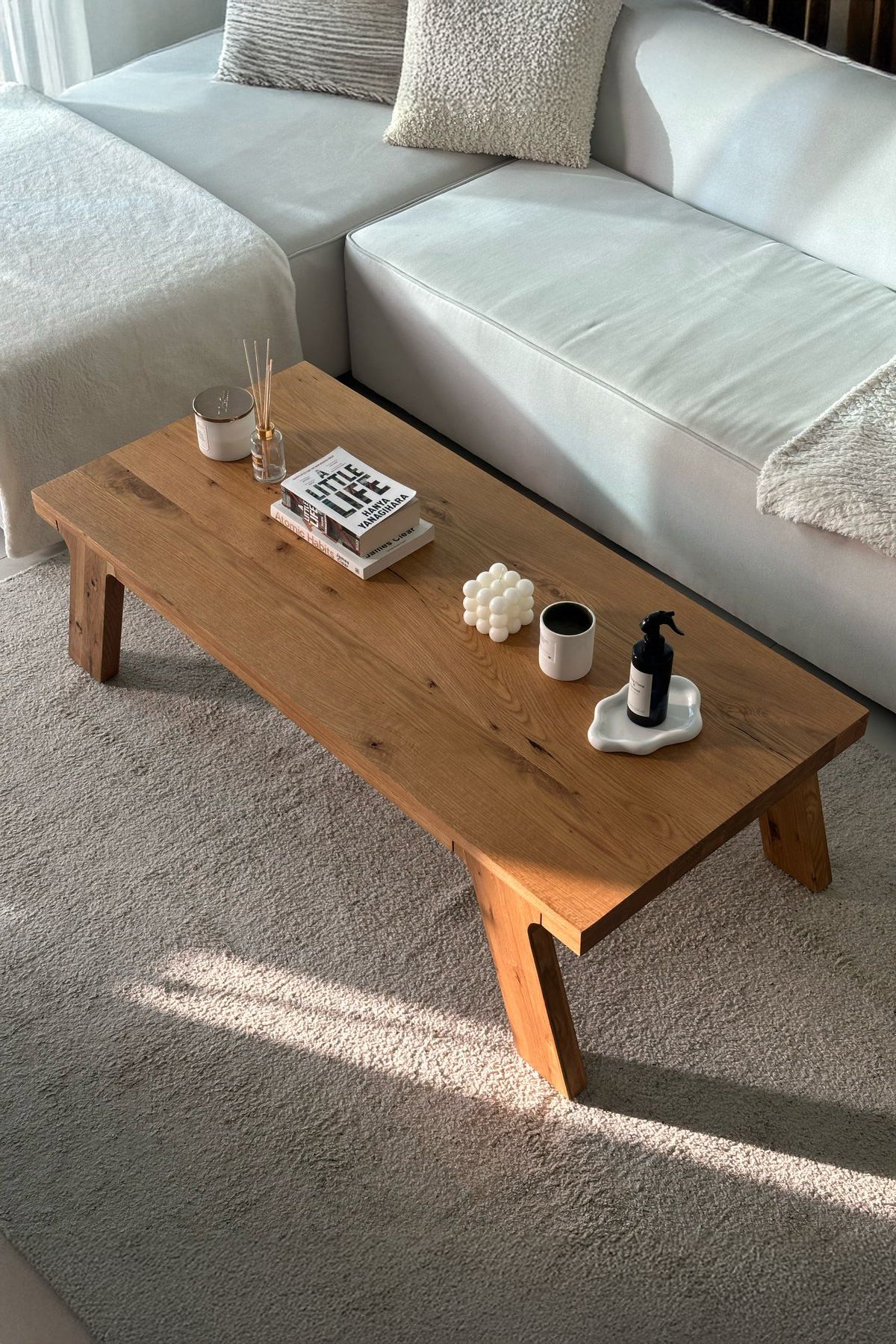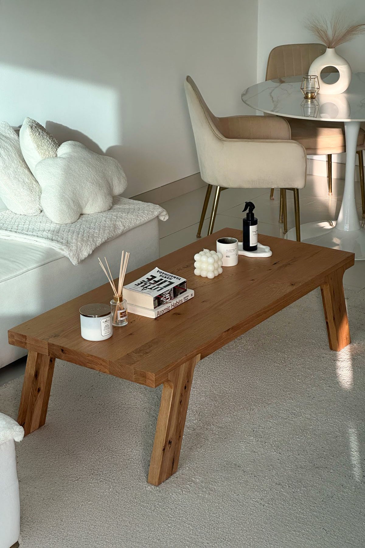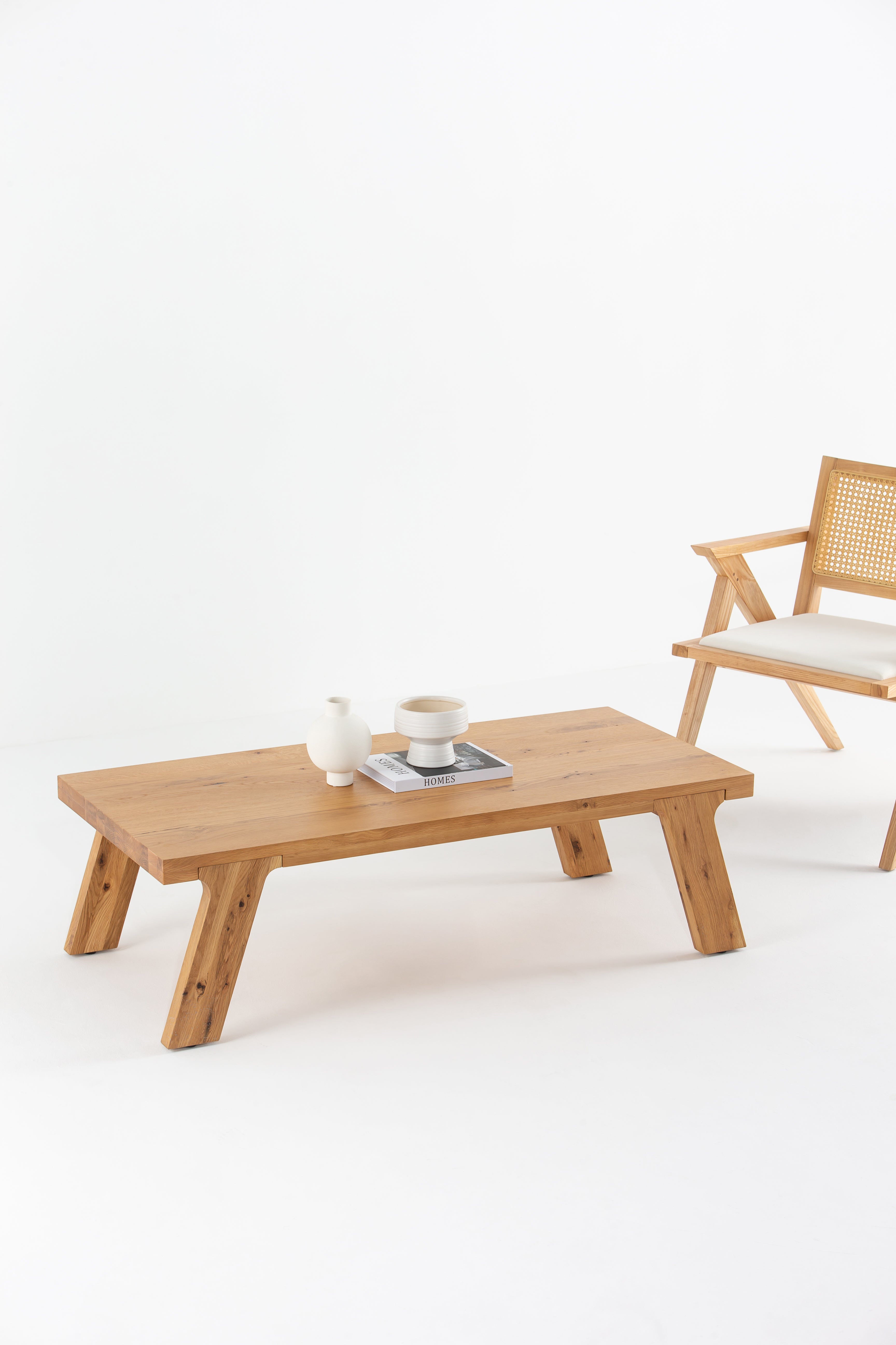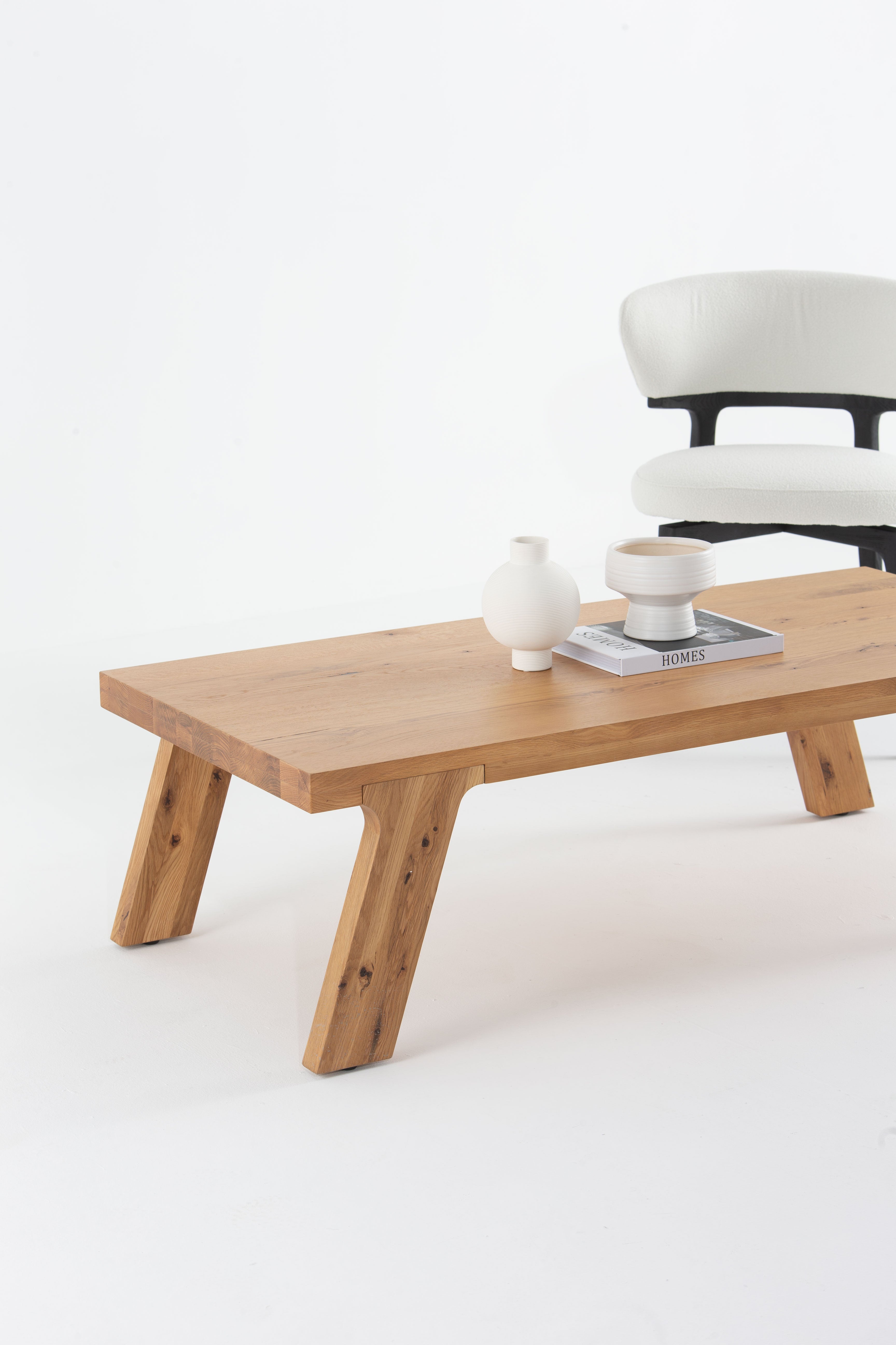 Grounded in natural beauty, this wooden coffee table brings warmth and character to your space. Crafted from rich oak veneer with a sturdy oak wood base, its smooth, wide surface highlights the organic grain patterns, while slightly angled legs add a touch of modern charm. The minimalist structure ensures versatility, making it a perfect fit for contemporary and rustic interiors alike. Whether holding your morning coffee or styled with décor, this statement piece enhances your living area with timeless appeal.