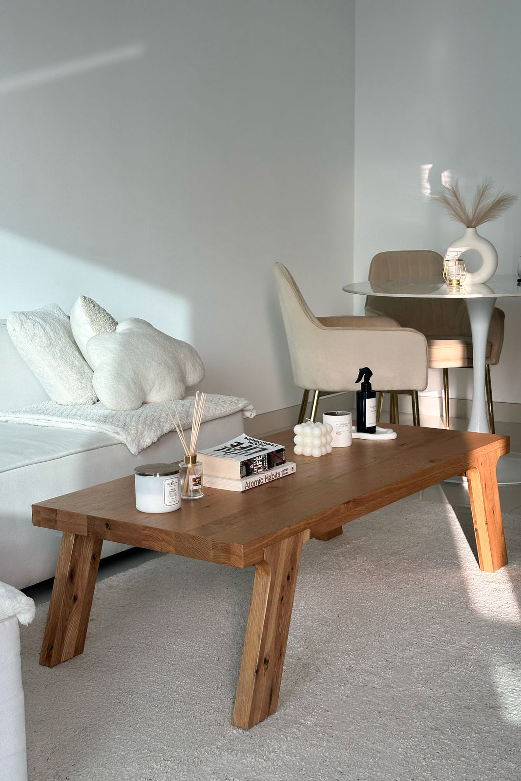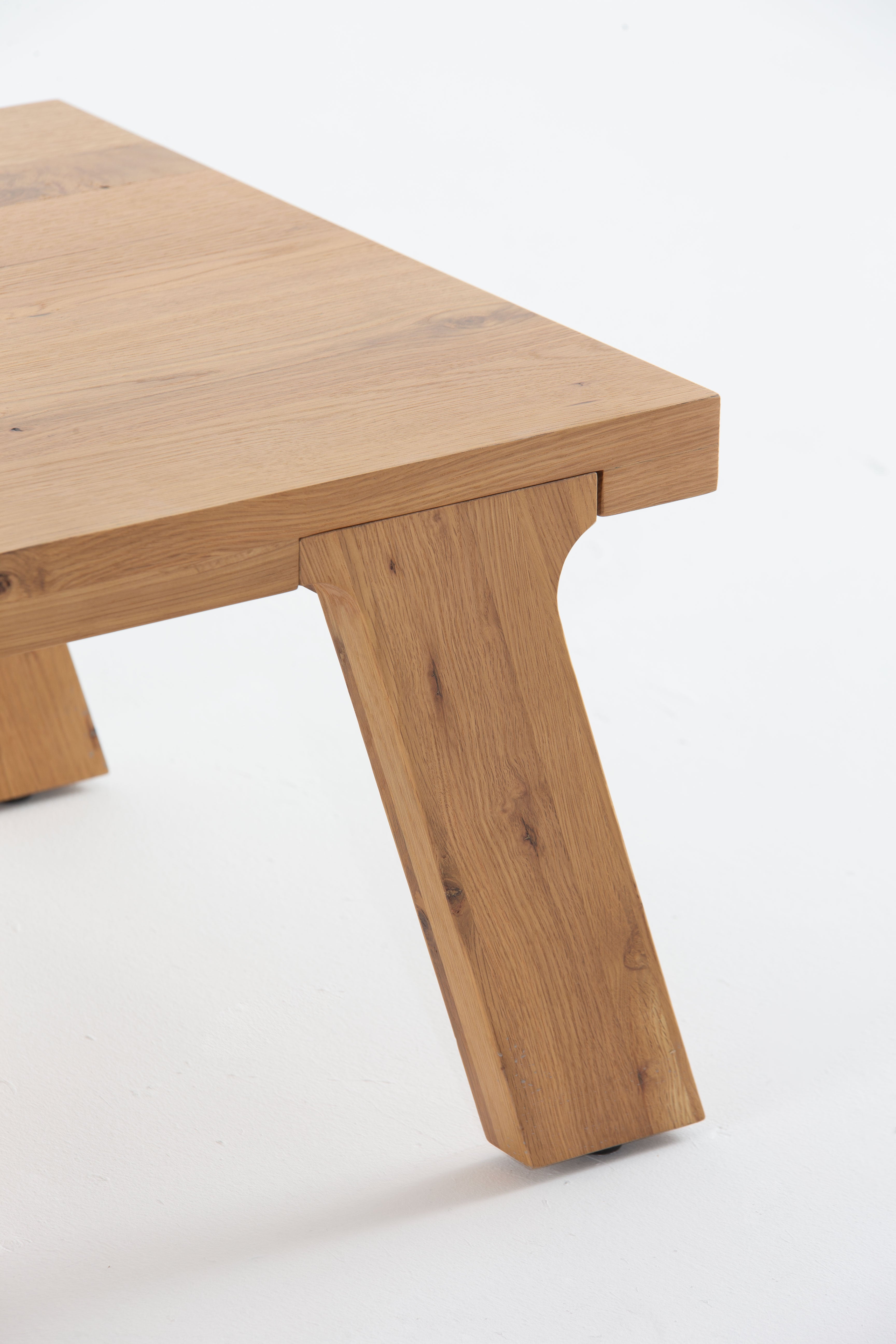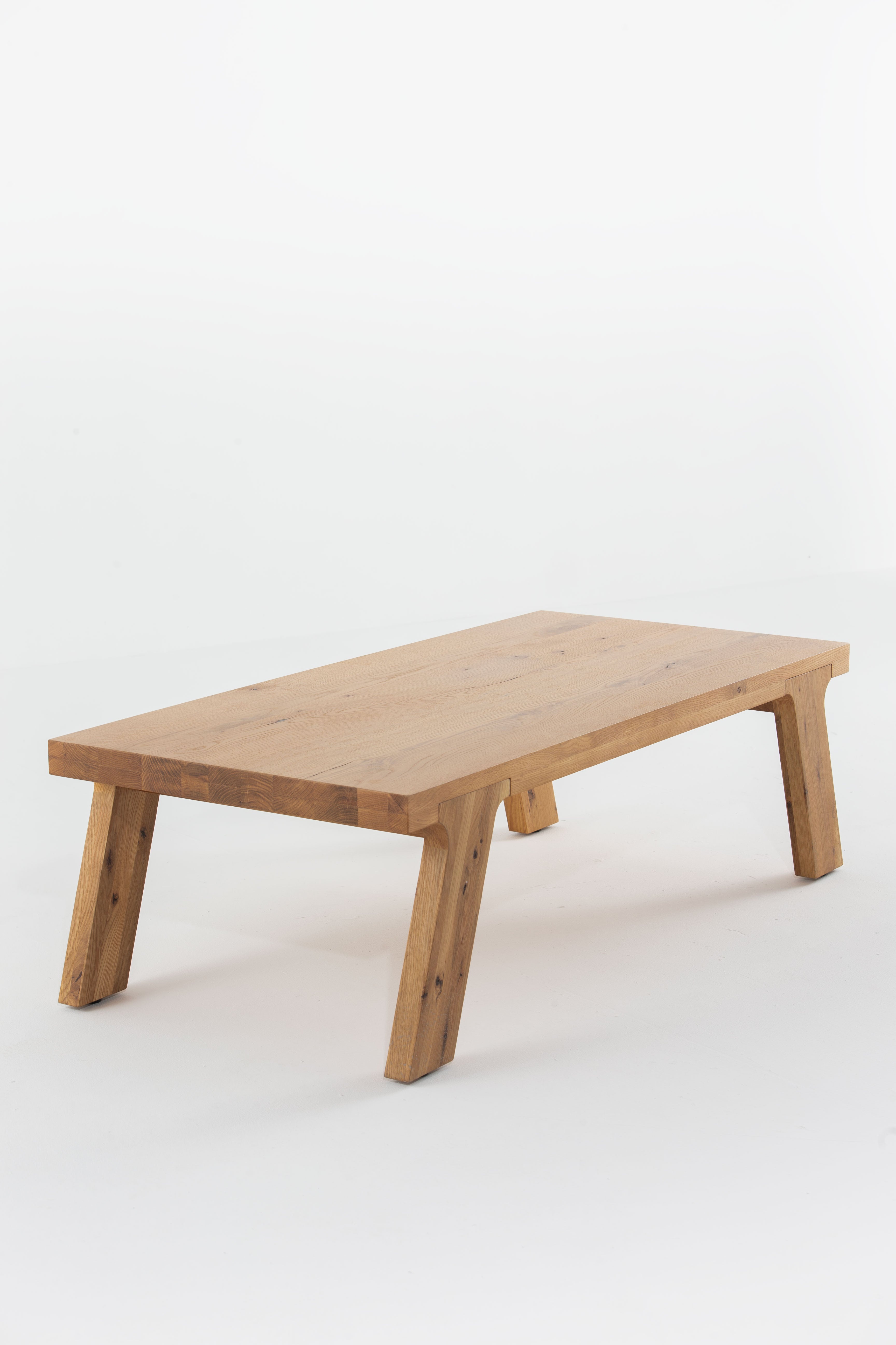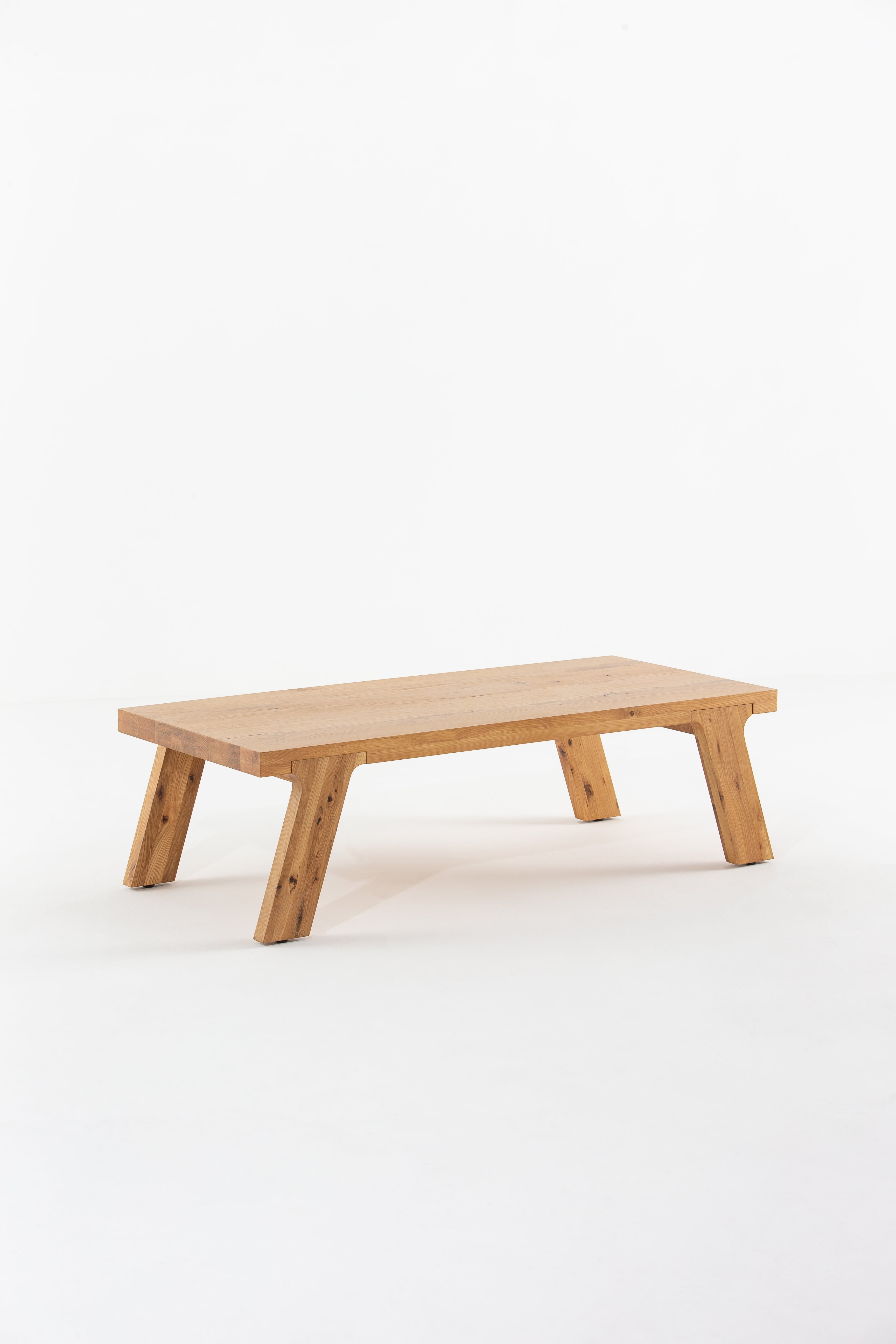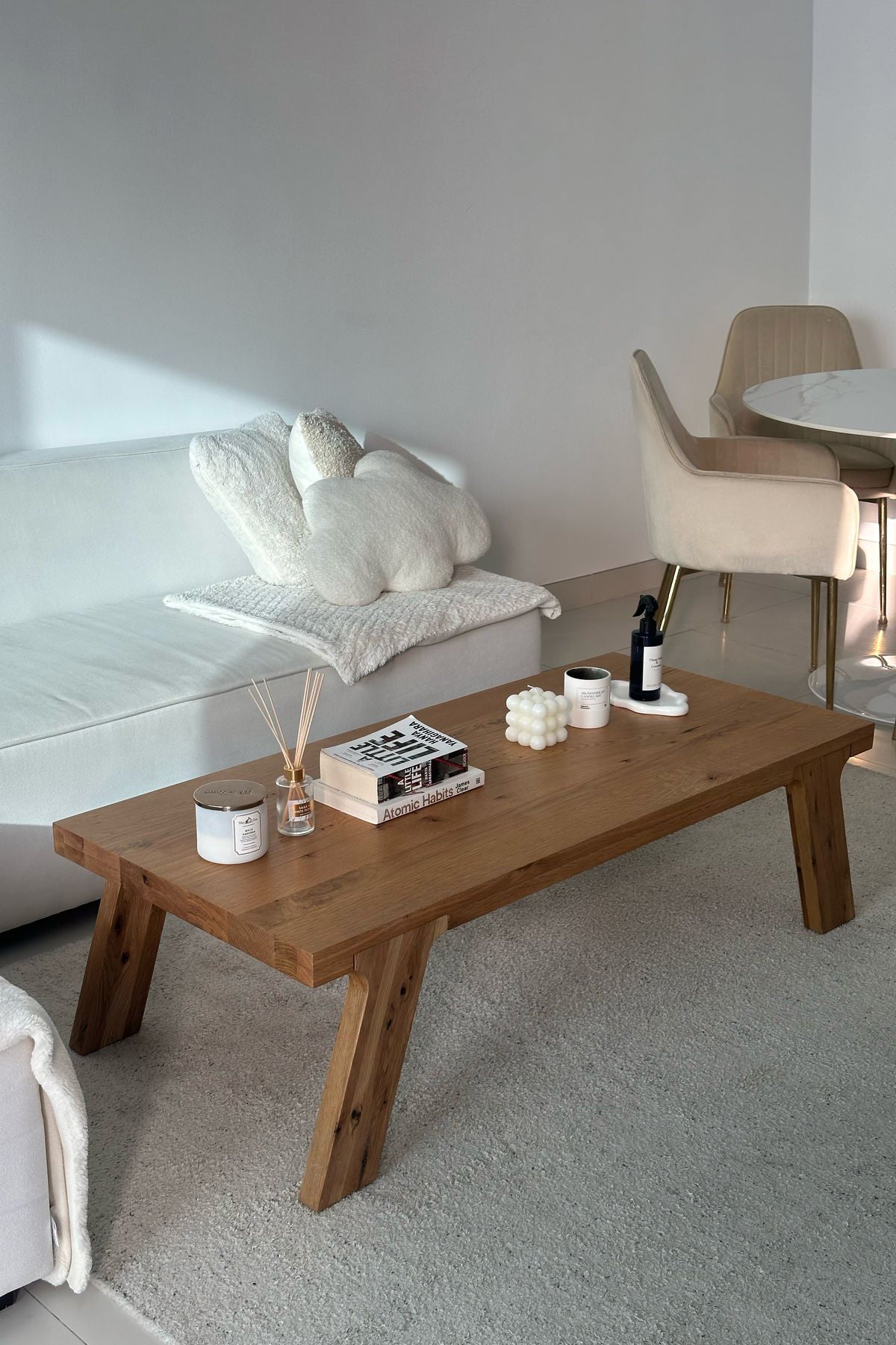 Grounded in natural beauty, this wooden coffee table brings warmth and character to your space. Crafted from rich oak veneer with a sturdy oak wood base, its smooth, wide surface highlights the organic grain patterns, while slightly angled legs add a touch of modern charm. The minimalist structure ensures versatility, making it a perfect fit for contemporary and rustic interiors alike. Whether holding your morning coffee or styled with décor, this statement piece enhances your living area with timeless appeal.