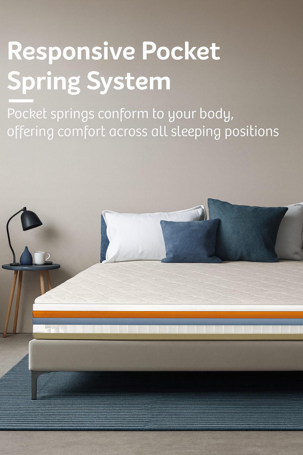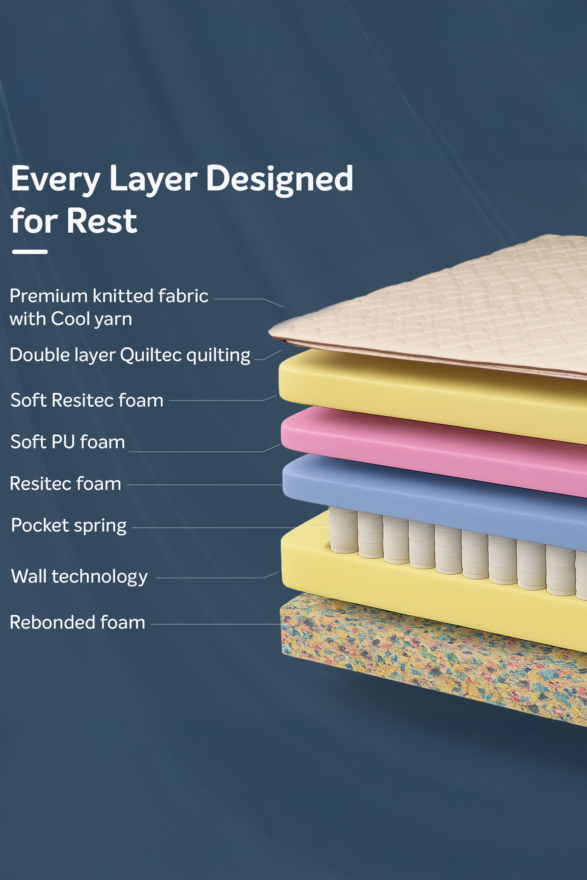 Upgrade your rest with a pocket spring mattress that offers ergonomic support and zero partner disturbance. The Soft Resitec Foam enhances comfort, while the orthopedic design ensures proper spinal alignment. Infused with Neem Fresche Technology, it stays hygienic and allergen-free. A luxurious blend of support, freshness, and rejuvenating comfort.