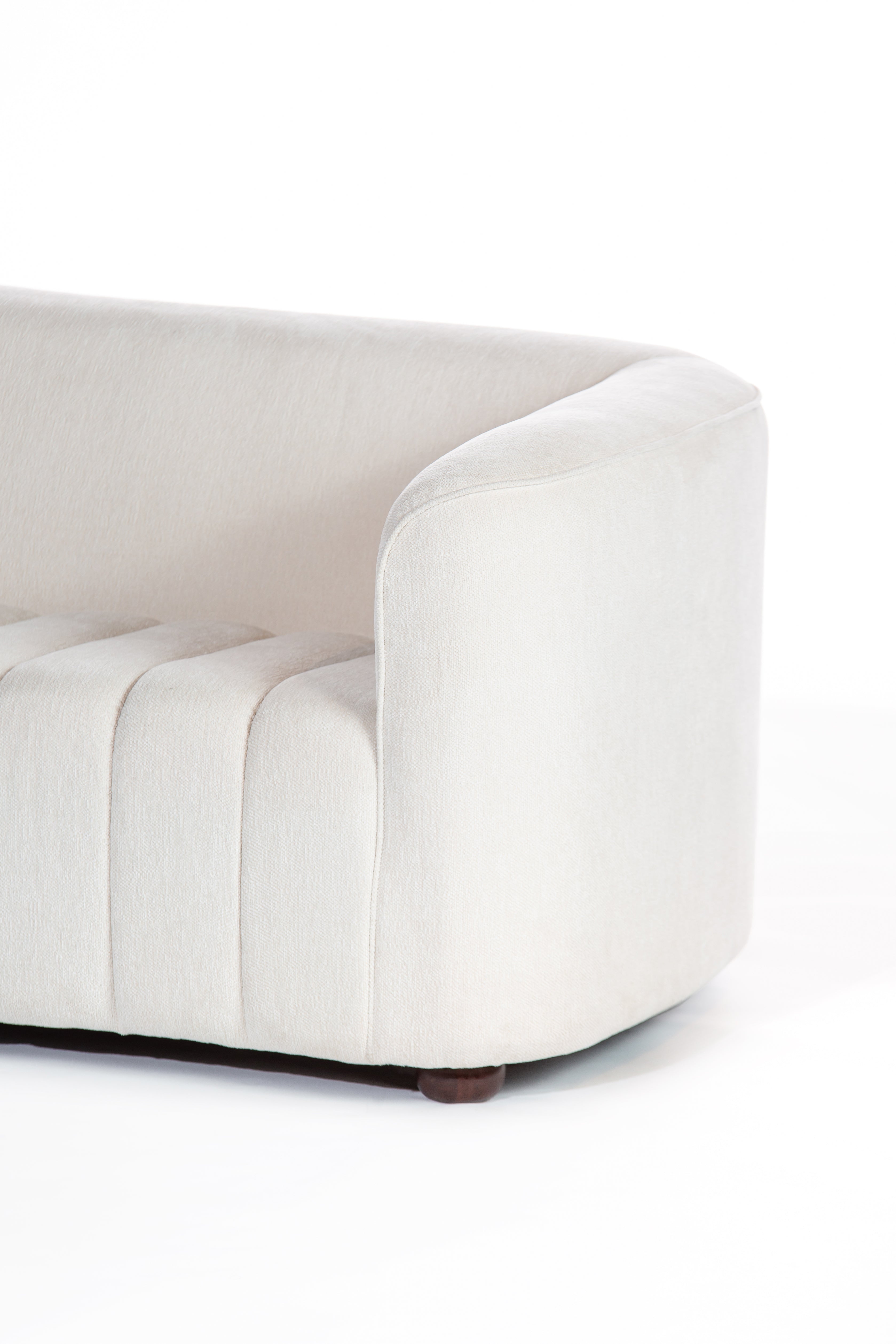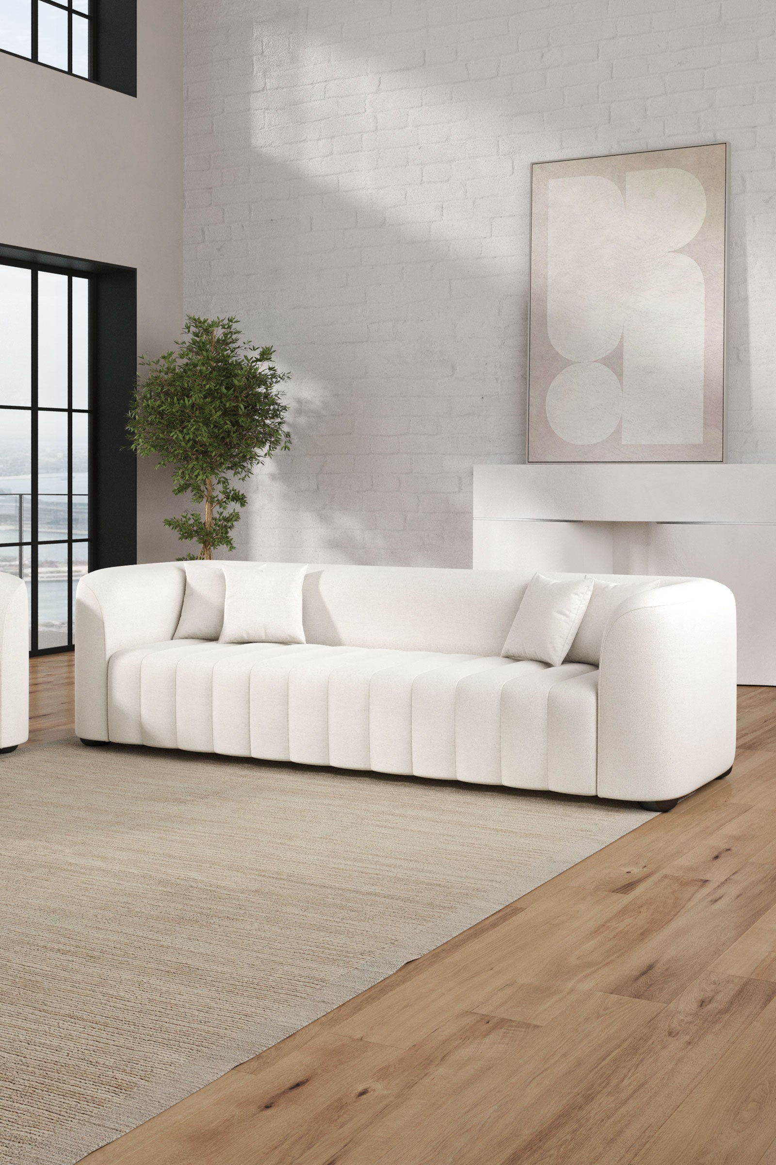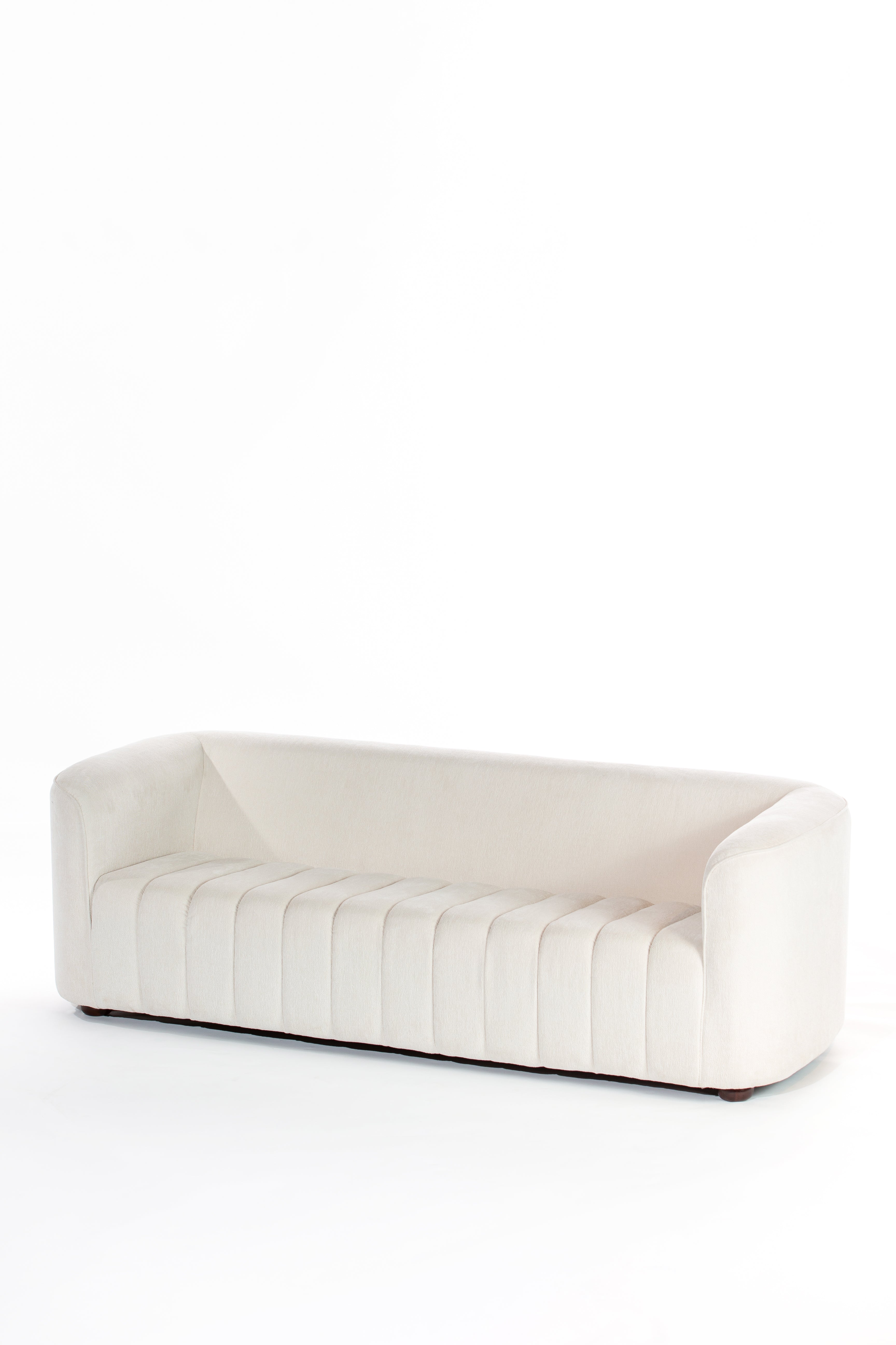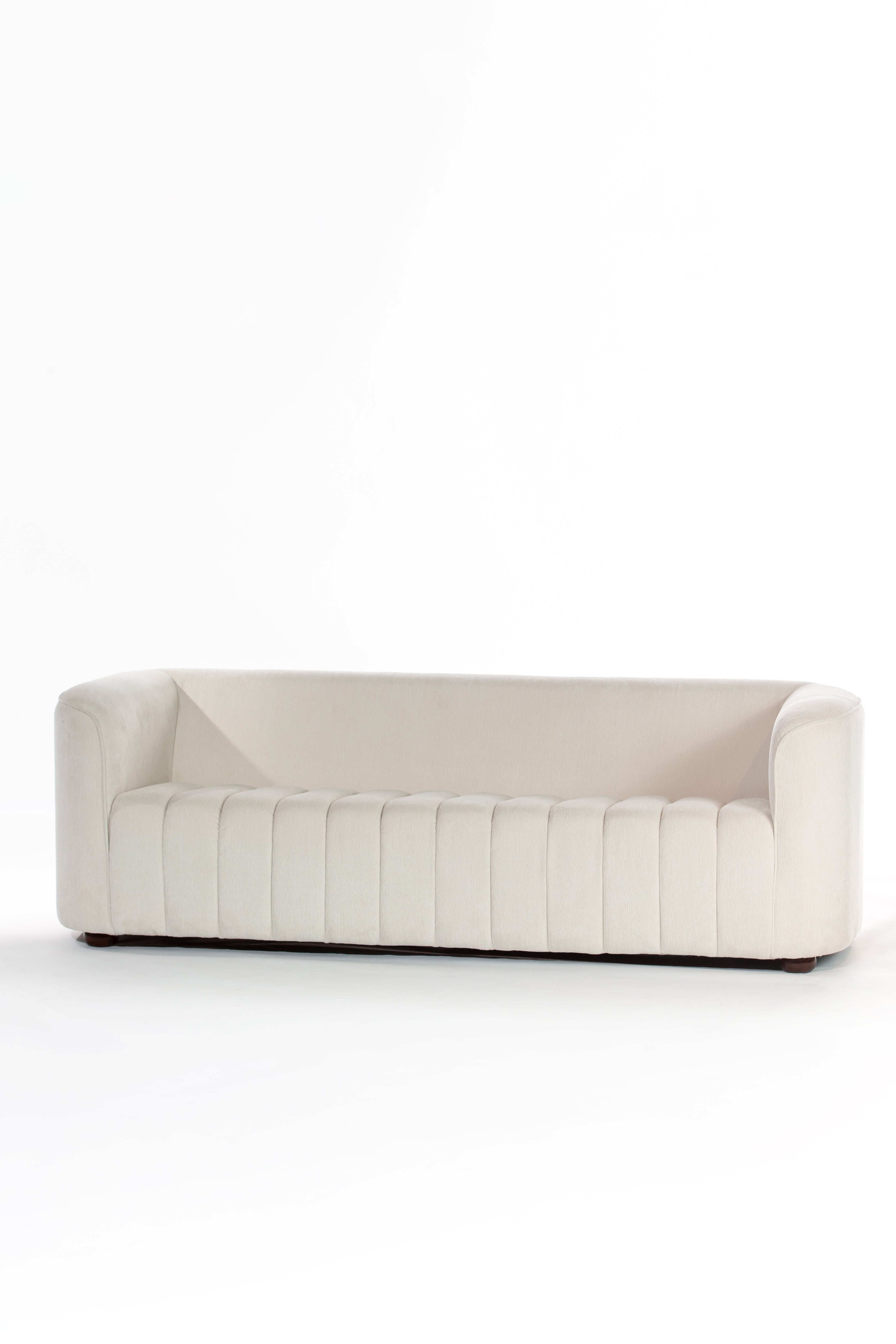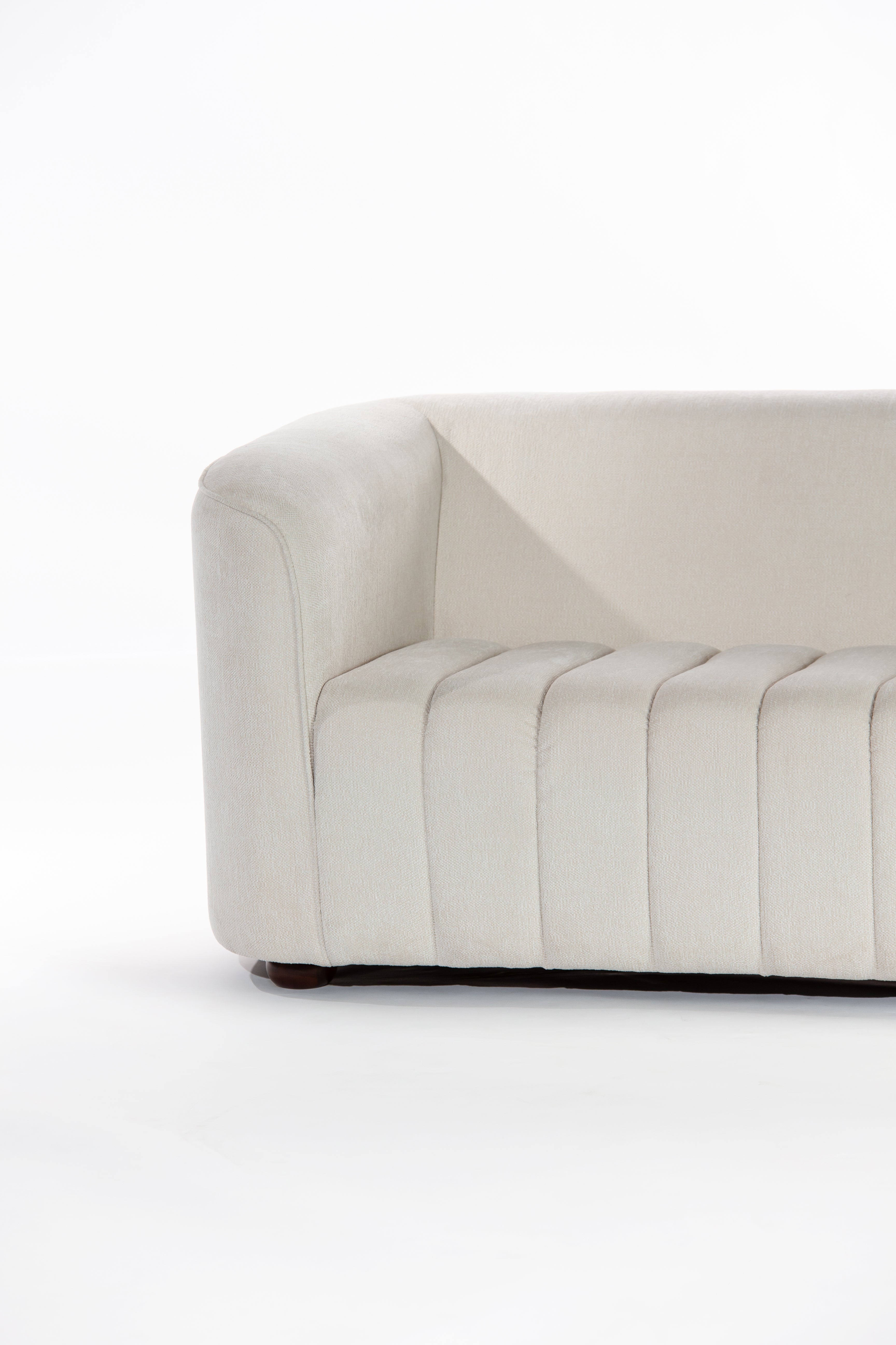 Transform your living space with this sculptural sofa, available in 2 and 3-seater options, upholstered in Moonstone Beige for a warm and refined aesthetic. The elegant vertical channel tufting along the seat enhances its sophisticated appeal, while the rounded arms and structured backrest bring balance and modern form. Designed for minimalist yet luxurious interiors, this statement piece serves as a focal point of style and comfort, seamlessly elevating both contemporary and transitional spaces.