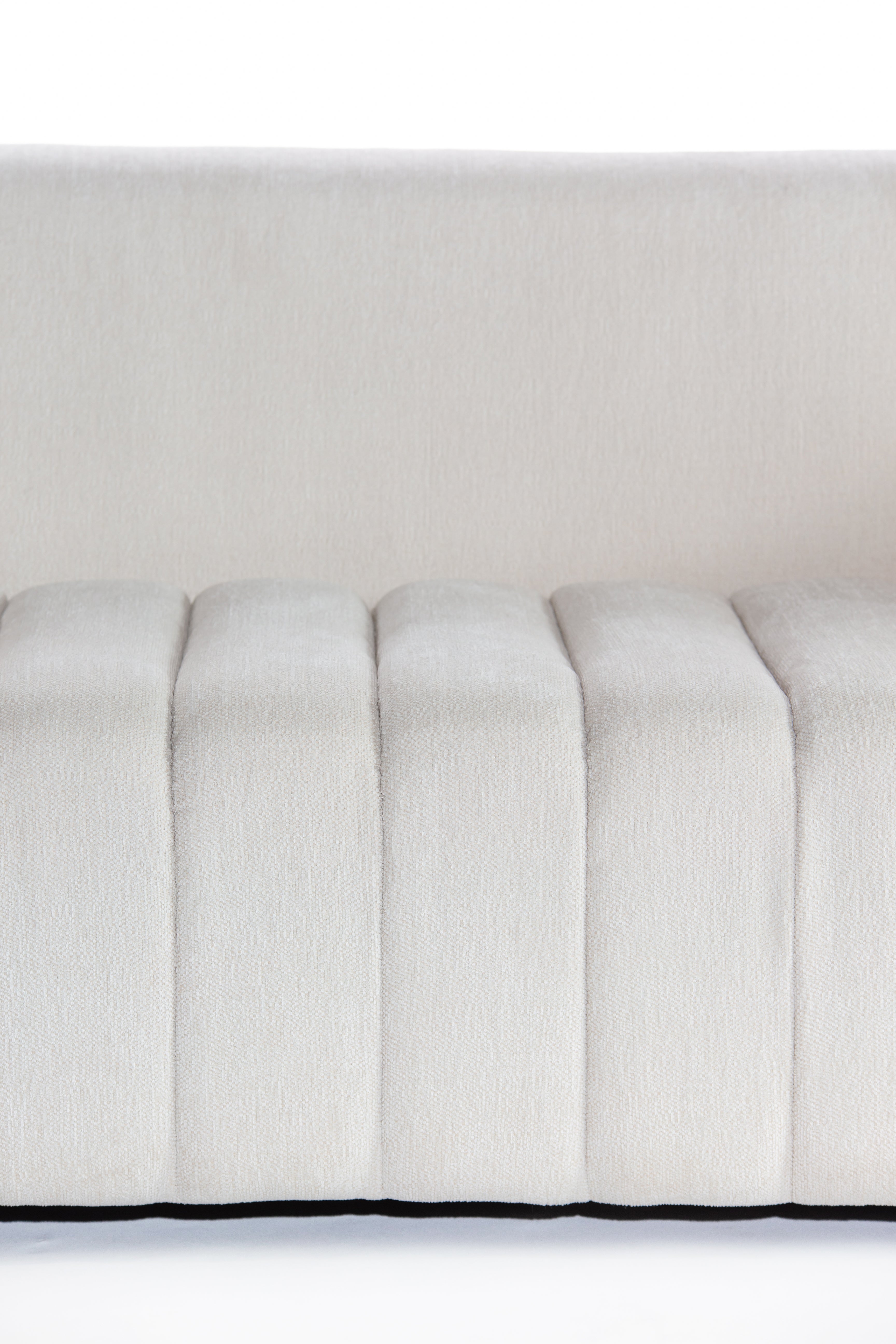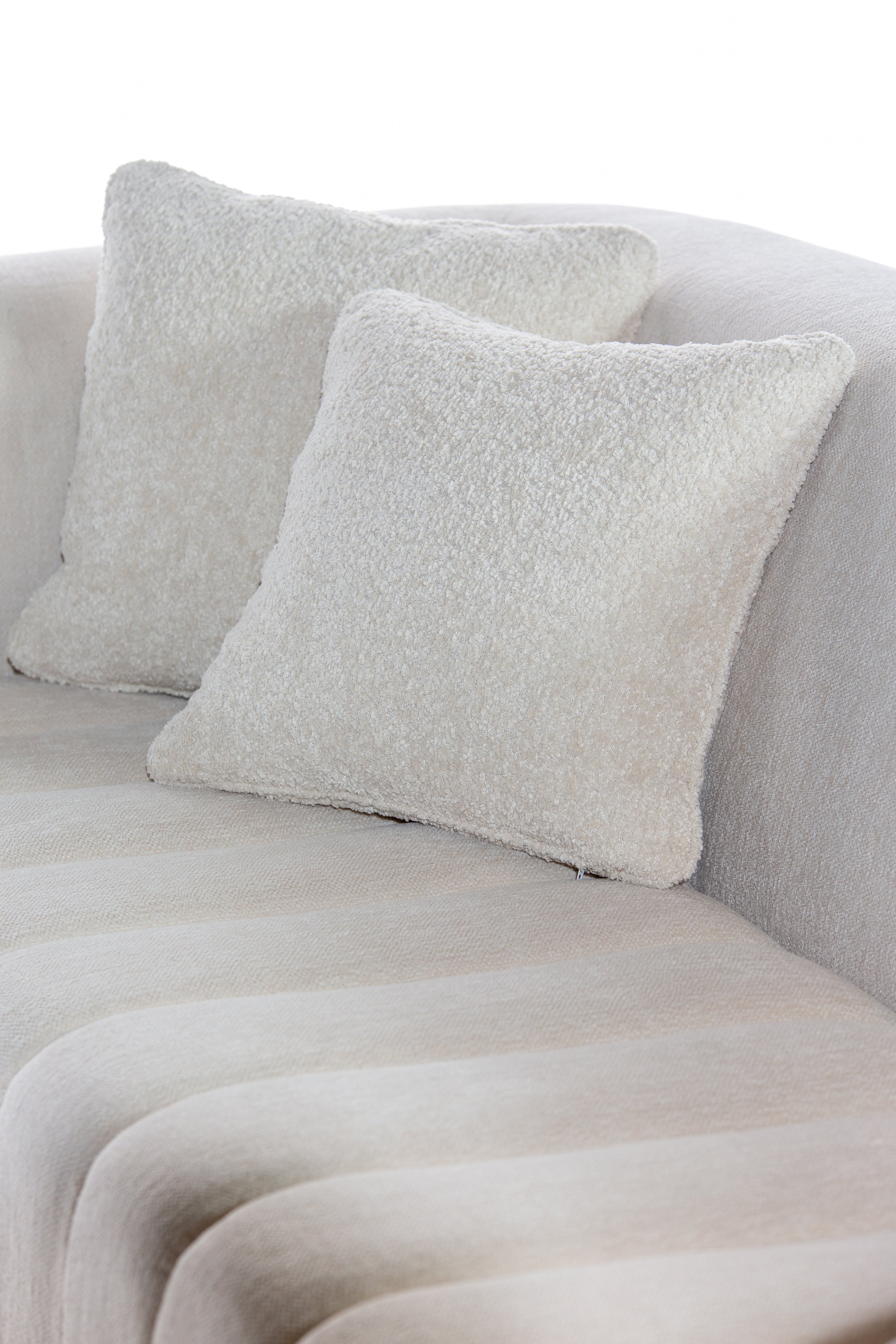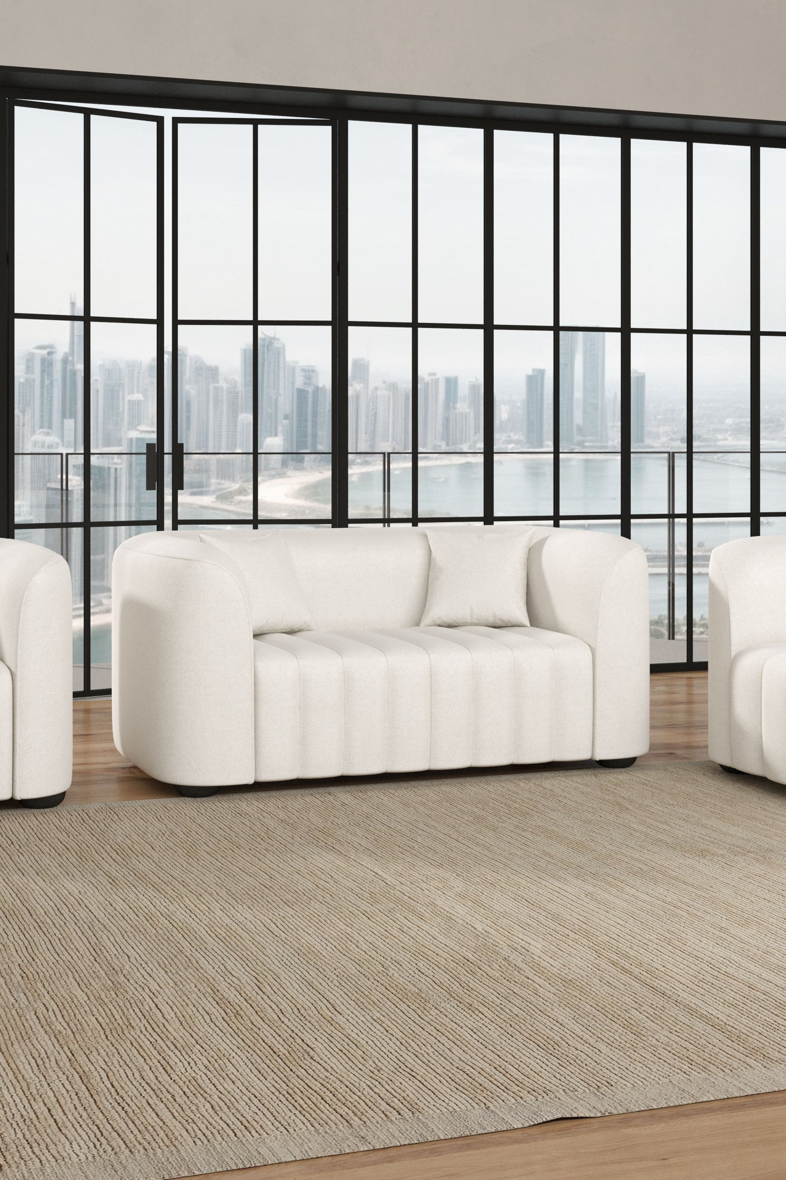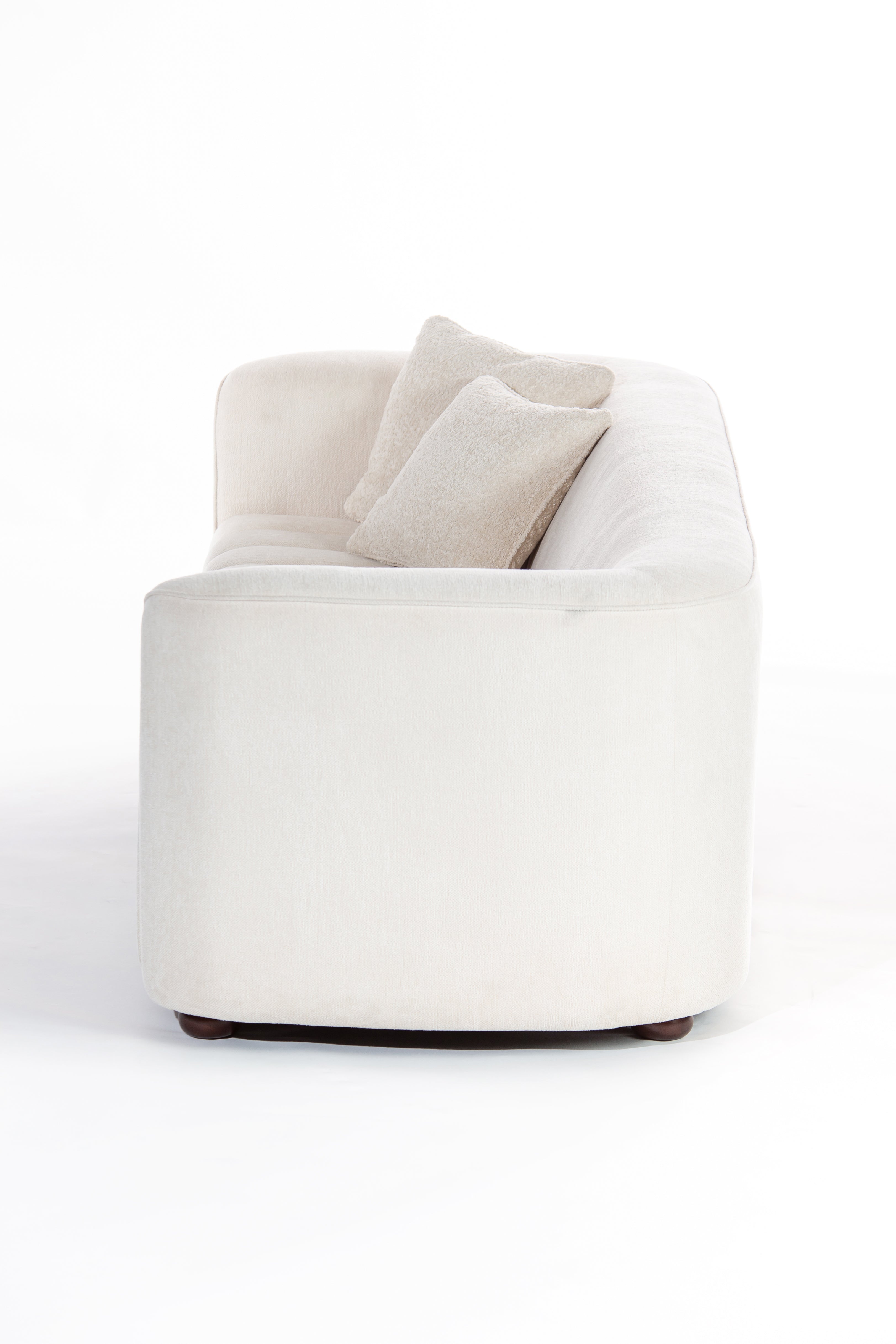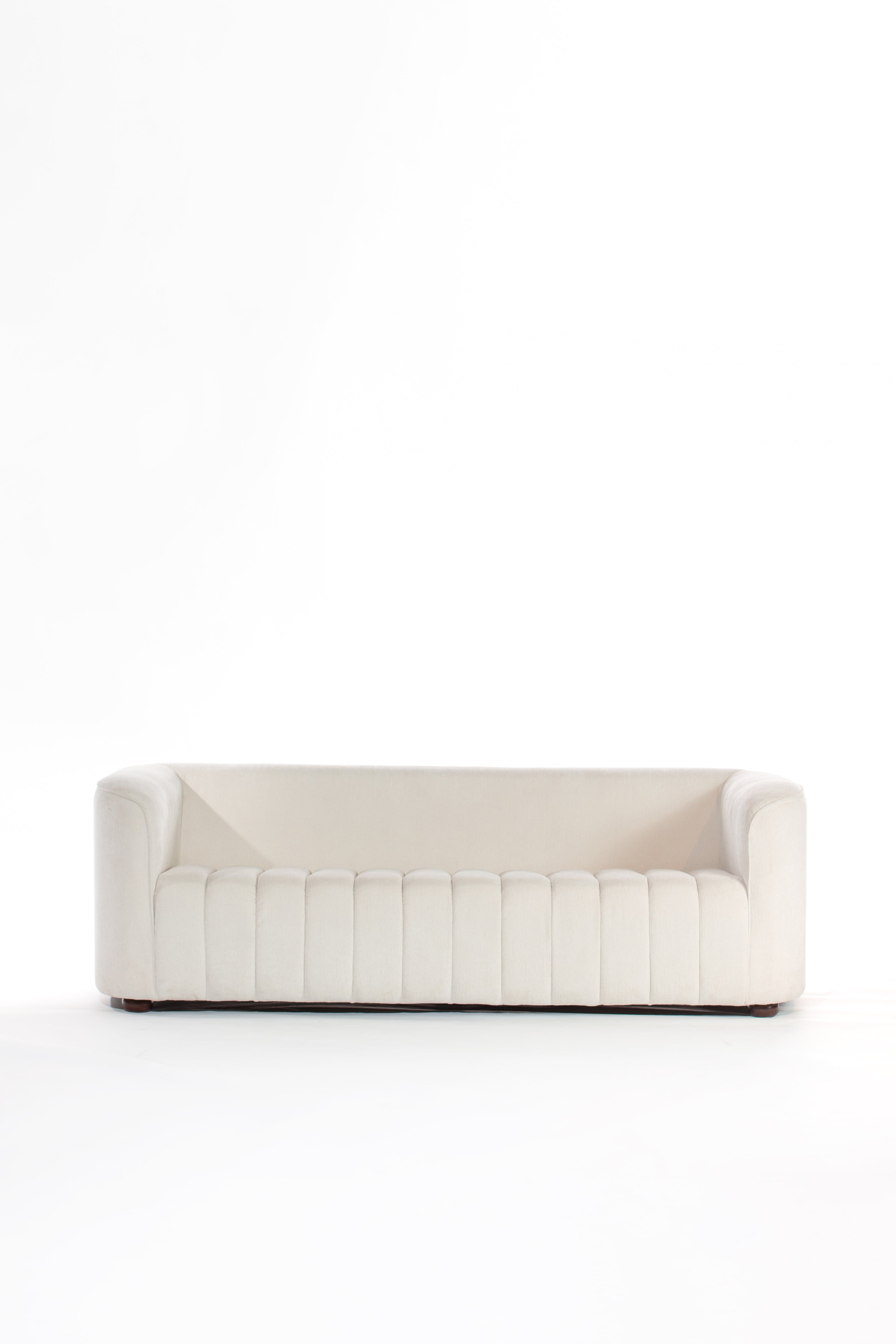 Transform your living space with this sculptural sofa, available in 2 and 3-seater options, upholstered in Moonstone Beige for a warm and refined aesthetic. The elegant vertical channel tufting along the seat enhances its sophisticated appeal, while the rounded arms and structured backrest bring balance and modern form. Designed for minimalist yet luxurious interiors, this statement piece serves as a focal point of style and comfort, seamlessly elevating both contemporary and transitional spaces.