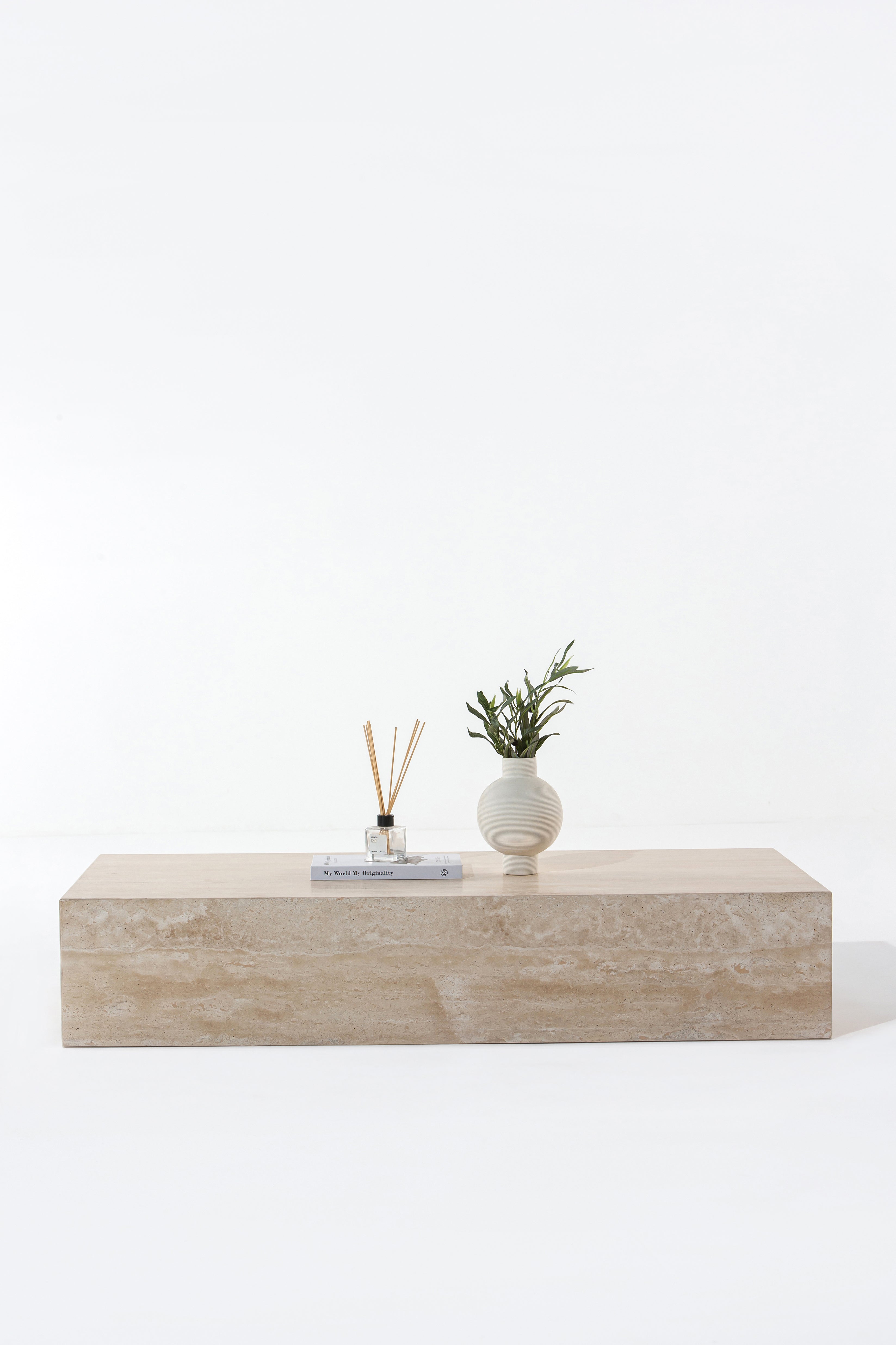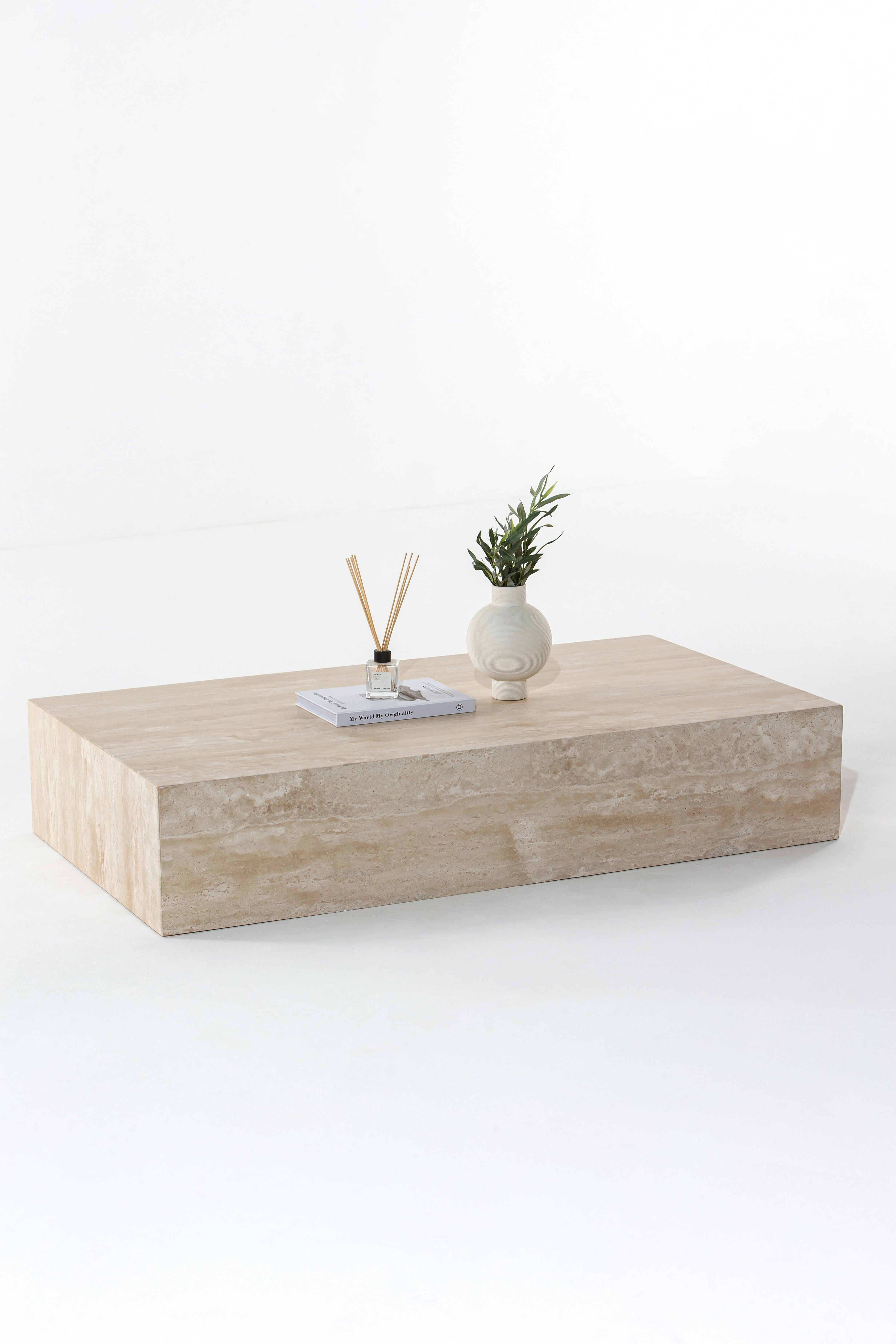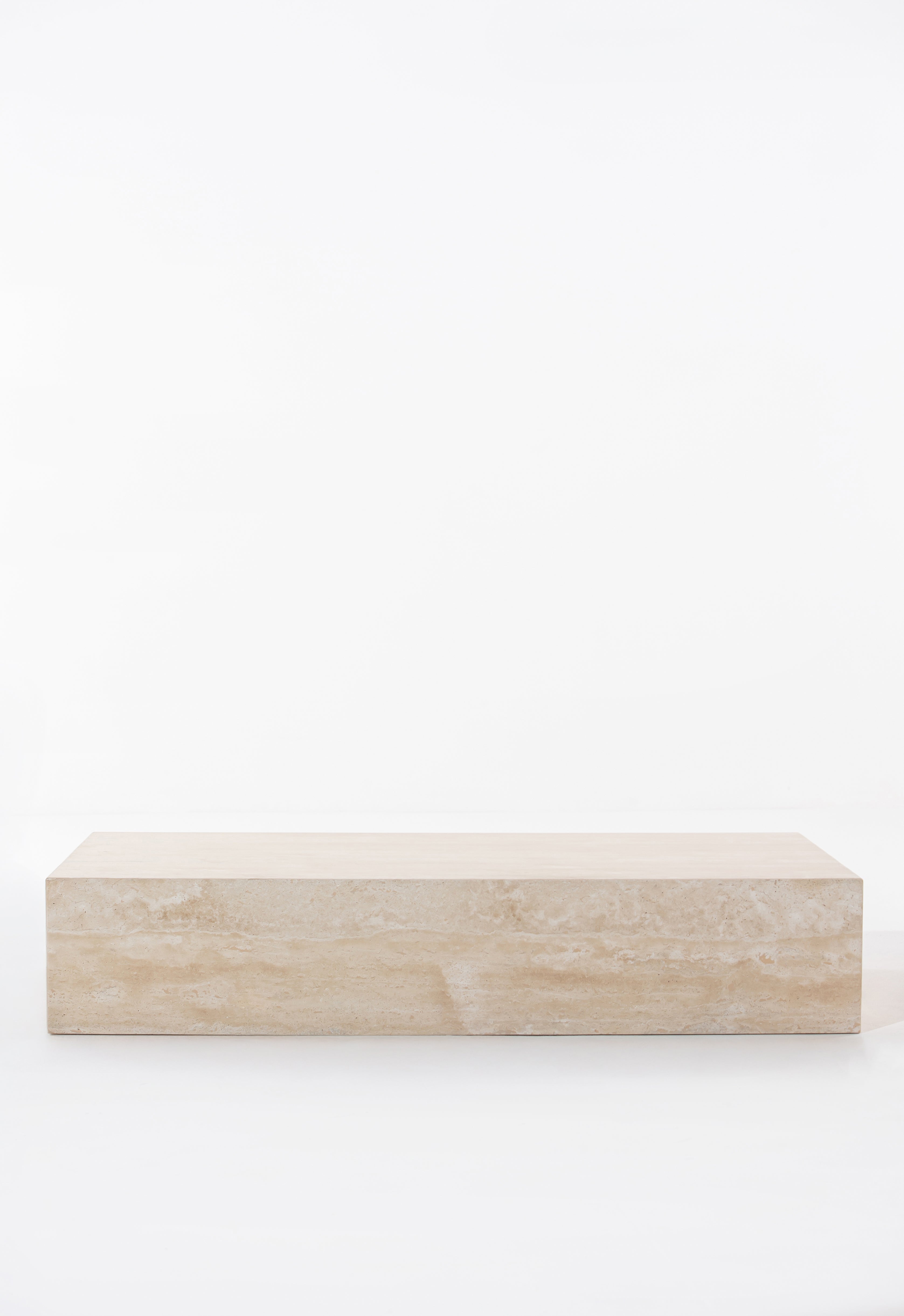 Let your space speak timeless elegance with this rectangular travertine coffee table. Crafted from solid beige travertine stone, the design brings a sense of calm minimalism with its clean lines, smooth honed surface, and soft natural veining. The warm neutral tones pair effortlessly with any interior—whether you're curating a modern living room or a serene lounge. Its low, monolithic form feels both sculptural and grounded, giving you a statement centerpiece that draws the eye without overpowering the room. Ideal for those seeking luxury travertine furniture that’s both modern and enduring.