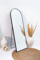This full length arch mirror features a slim black metal frame and built in stand that allows it to rest freely without wall mounting. The curved top softens its rectangular body, reflecting natural light to open up the room. Its stable structure and clean frame make it ideal for bedrooms, dressing spaces, or hallways, bringing a subtle sculptural element while providing a clear, accurate reflection.