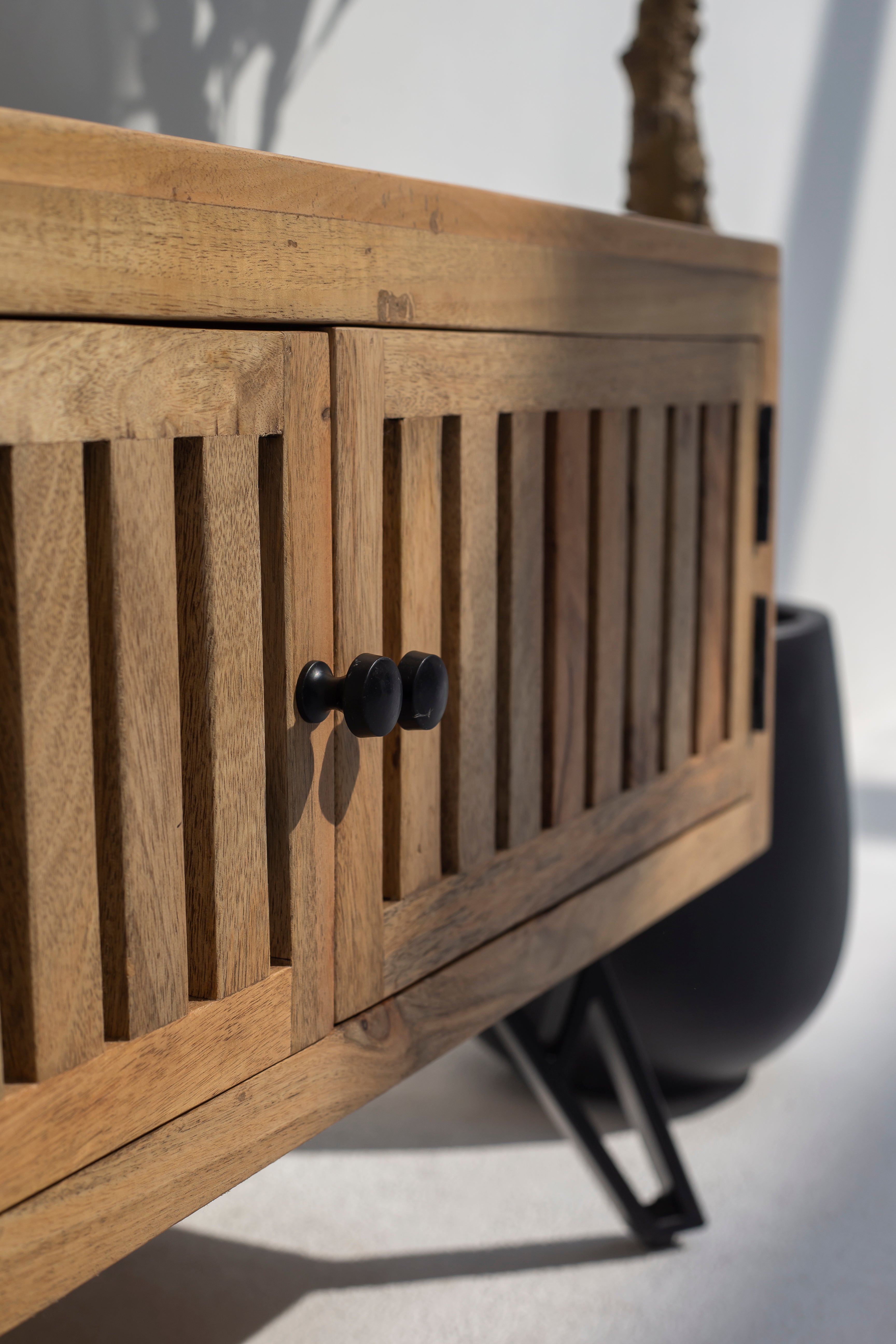 Henriette Wooden TV Unit, crafted from premium mango wood, showcases a warm natural finish that enhances its organic beauty. The unit features sleek black metal legs and a unique design with a mix of slatted and open storage spaces, making it both functional and stylish. Its earthy tones and smooth texture add elegance, while its sturdy build ensures durability. Perfect for contemporary interiors, this piece effortlessly combines practicality and aesthetics. Ideal for living spaces, it complements modern decor while providing ample storage. Transform your entertainment area with the timeless charm of mango wood. Hi there