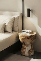 Exemplifying minimalist elegance, this sculptural side table is crafted from premium Fiber Reinforced Concrete and finished in a luxurious honey onyx marble effect that brings warmth, depth, and rich organic movement to its contemporary silhouette. The smooth, rounded top rests on three bold cylindrical legs, creating an architecturally inspired form that blends seamlessly into modern or minimalist interiors. Durable and visually captivating, its onyx-inspired surface highlights swirling amber and cream tones, offering both tactile sophistication and a striking natural aesthetic. Versatile enough for living rooms, bedrooms, or semi-outdoor settings, this piece introduces a refined touch of modern artistry while maintaining everyday functionality and timeless appeal.