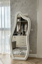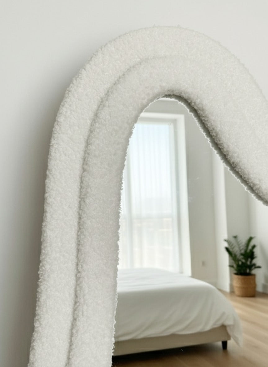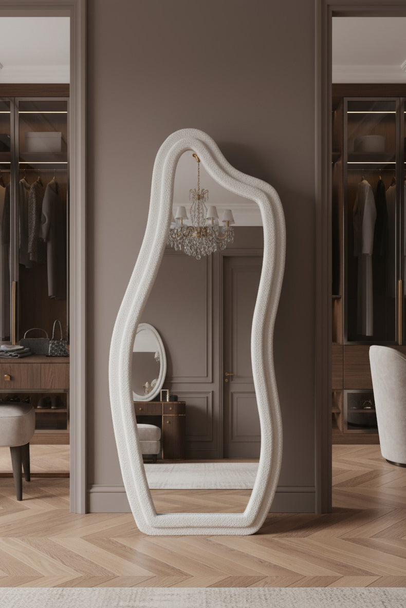 This floor mirror is defined by its irregular outline and off white Boucle frame that softens the bold curves with a tactile finish. The expansive reflective surface enhances natural light while the freestanding easel stand allows easy positioning in bedrooms, dressing corners, or entryways. Its textured border introduces warmth and refinement, turning a functional piece into a striking focal point for contemporary interiors.