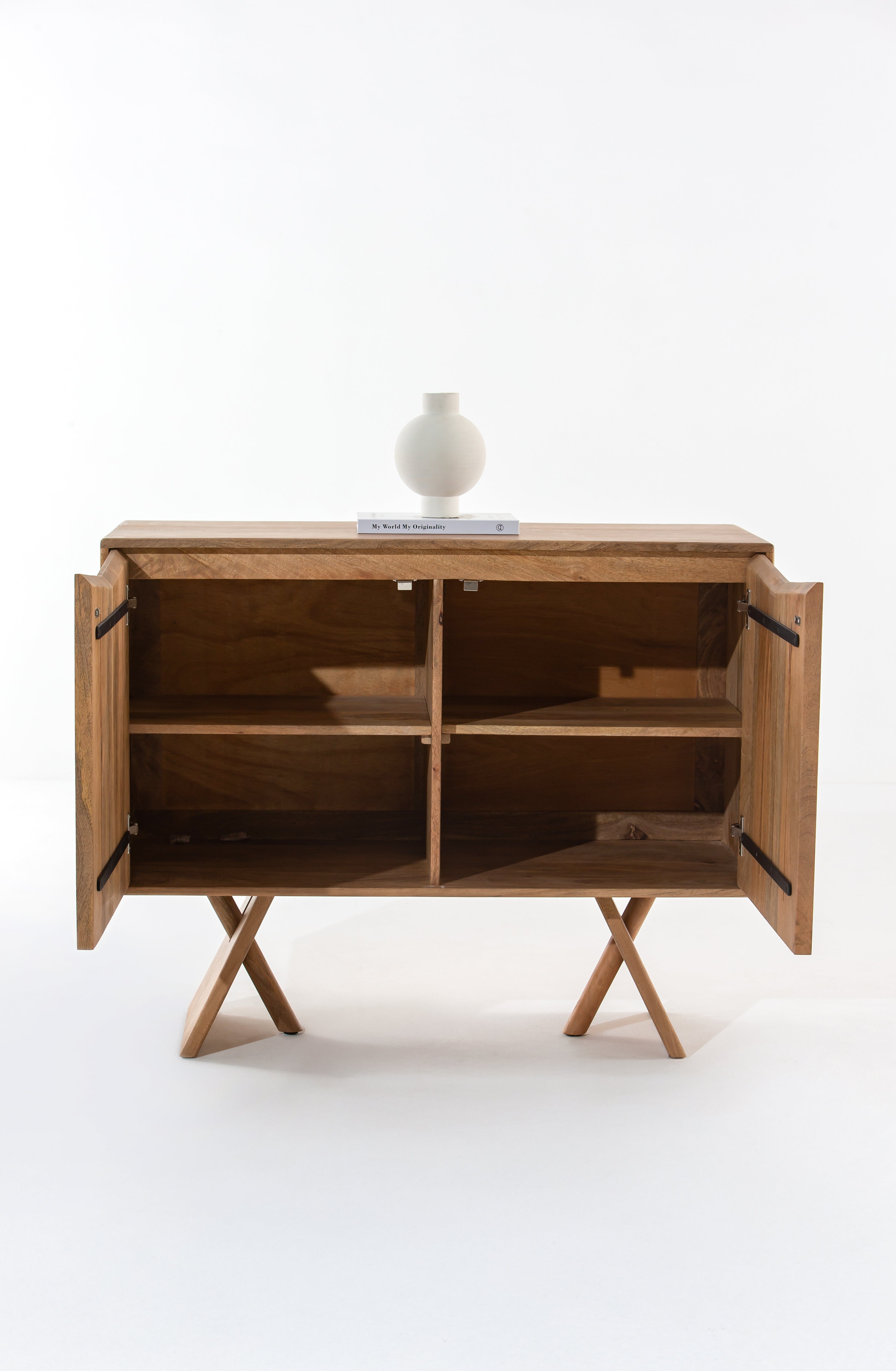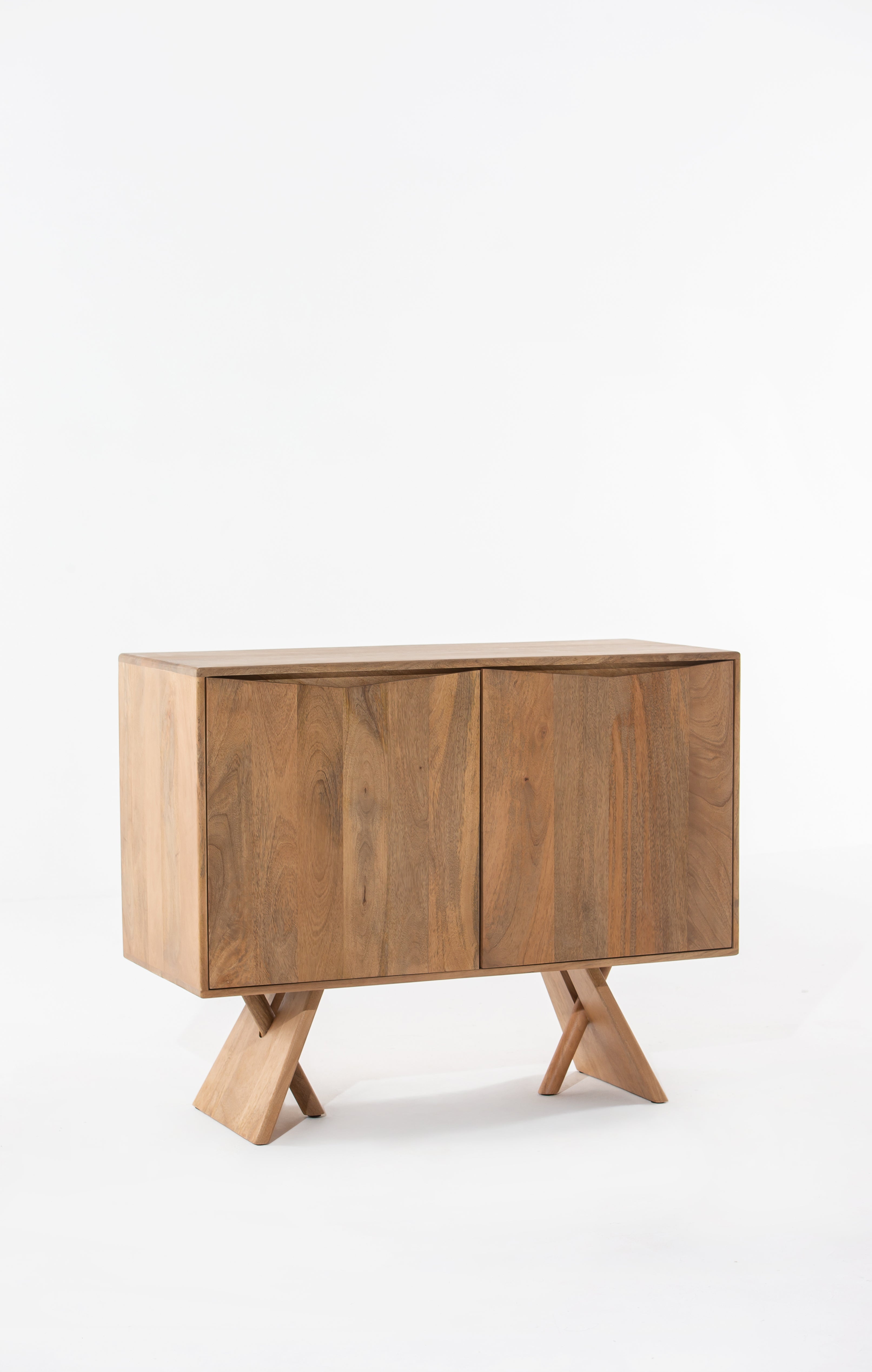 Bring effortless elegance to your interior with this 2-Door Wooden Sideboard, crafted from high-quality solid Mindi wood. Its natural grain finish highlights the organic beauty of the wood, while the minimalist design ensures it integrates seamlessly into contemporary or Scandinavian-inspired interiors. Resting on bold X-style sculptural legs, this compact storage unit offers two doors that open to reveal internal shelving—perfect for stashing away essentials in living rooms, entryways, or dining spaces. Thoughtfully sized for versatility, this piece is as functional as it is visually striking.